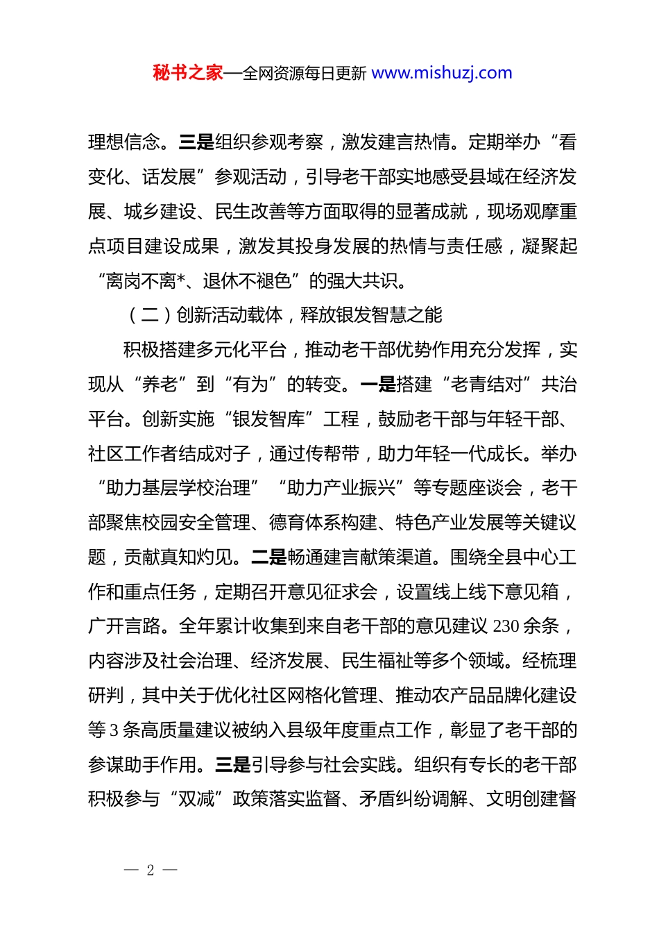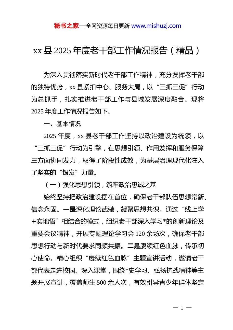 秘书之家—全网资源每日更新 www.mishuzj.comxx 县 2025 年度老干部工作情况报告(精品)为深入贯彻落实新时代老干部工作精神,充分发挥老干部的独特优势,xx 县紧扣中心、服务大局,以“三抓三促”行动为总抓手,扎实推进老干部工作与县域发展深度融合。现将2025 年度工作情况报告如下。一、基本情况2025 年度,xx 县老干部工作坚持以政治建设为统领,以“三抓三促”行动为引擎,在思想引领、作用发挥和服务保障三方面协同发力,取得了阶段性成效,为基层治理现代化注入了坚实的“银发”力量。(一)强化思想引领,筑牢政治忠诚之基始终坚持把政治建设摆在首位,确保老干部队伍思想常新、信念永固。一是深化理论武装,凝聚思想共识。通过“线上学+实地悟”相结合的模式,组织老干部深入学习*的创新理论及重要会议精神,开展专题理论学习会 120 余场次,确保老干部思想行动与新时代要求同频共振。二是赓续红色血脉,传承初心使命。精心组织“赓续红色血脉”主题宣讲活动,邀请老干部代表走进校园、深入课堂,围绕*史学习、弘扬抗战精神等主题开展宣讲,覆盖师生 500 余人次,有效引导青少年群体坚定— 1 —秘书之家—全网资源每日更新 www.mishuzj.com理想信念。三是组织参观考察,激发建言热情。定期举办“看变化、话发展”参观活动,引导老干部实地感受县域在经济发展、城乡建设、民生改善等方面取得的显著成就,现场观摩重点项目建设成果,激发其投身发展的热情与责任感,凝聚起“离岗不离*、退休不褪色”的强大共识。(二)创新活动载体,释放银发智慧之能积极搭建多元化平台,推动老干部优势作用充分发挥,实现从“养老”到“有为”的转变。一是搭建“老青结对”共治平台。创新实施“银发智库”工程,鼓励老干部与年轻干部、社区工作者结成对子,通过传帮带,助力年轻一代成长。举办“助力基层学校治理”“助力产业振兴”等专题座谈会,老干部聚焦校园安全管理、德育体系构建、特色产业发展等关键议题,贡献真知灼见。二是畅通建言献策渠道。围绕全县中心工作和重点任务,定期召开意见征求会,设置线上线下意见箱,广开言路。全年累计收集到来自老干部的意见建议 230 余条,内容涉及社会治理、经济发展、民生福祉等多个领域。经梳理研判,其中关于优化社区网格化管理、推动农产品品牌化建设等 3 条高质量建议被纳入县级年度重点工作,彰显了老干部的参谋助手作用。三是引导参与社会实践。组织有专长的老干部积极参与“双减”政策落实监督、矛盾纠纷调解、文明创建督— 2 —秘书之家—全网资源每日更新 www.mishuzj.com导等工作,使其在服务社会、服务群众的具体实践中实现人生价值,桑榆能量得到充分释放。(三)健全工作机制,提升服务保障之效聚焦老干部的实际需求,不断完善服务管理体系,着力提升服务质量和精细化水平。一是落实常态关爱机制。严格执行重大节日走访慰问、生日祝福、困难帮扶等制度,全年走访慰问老干部及遗属 200 余人次,发放慰问金及帮扶物资折合人民币 xx 万元,有效传递了*和政府的关怀与温暖。二是构建精准服务体系。创新建立“老干部人才库”,按照 dj、法律、农业、教育、医疗等专长领域分类建档,实现人才资源与岗位需求的精准匹配,推动形成“组织有需、老有所为”的良性循环。三是优化荣退工作机制。以增强老干部的荣誉感、归属感和幸福感为目标,创新落实干部荣誉退休制度。通过精心制作“一份时光剪影”纪念册、隆重举办“一场薪火对话”座谈会等形式,为新退休干部送上温情祝福与敬意,营造了尊老、敬老、爱老的浓厚氛围。二、存在问题在肯定成绩的同时,对照新时代老干部工作的高标准、严要求,工作中仍存在一些亟待解决的短板与不足。(一)制度体系仍需完善— 3 —秘书之家—全网资源每日更新 www.mishuzj.com老干部工作正处于转型发展的关键时期,现有体制机制与新时代要求尚不完全适应。一是领导协调机制不够健全。尚未成立由县主要领导牵头的老干部工作领导小组,部门间协调联动存在壁垒,有时会出现责任不清、推诿扯皮现象,影响了工作合力。二是经费保障机制有待强化。老干部工作专项经费未完全纳入...