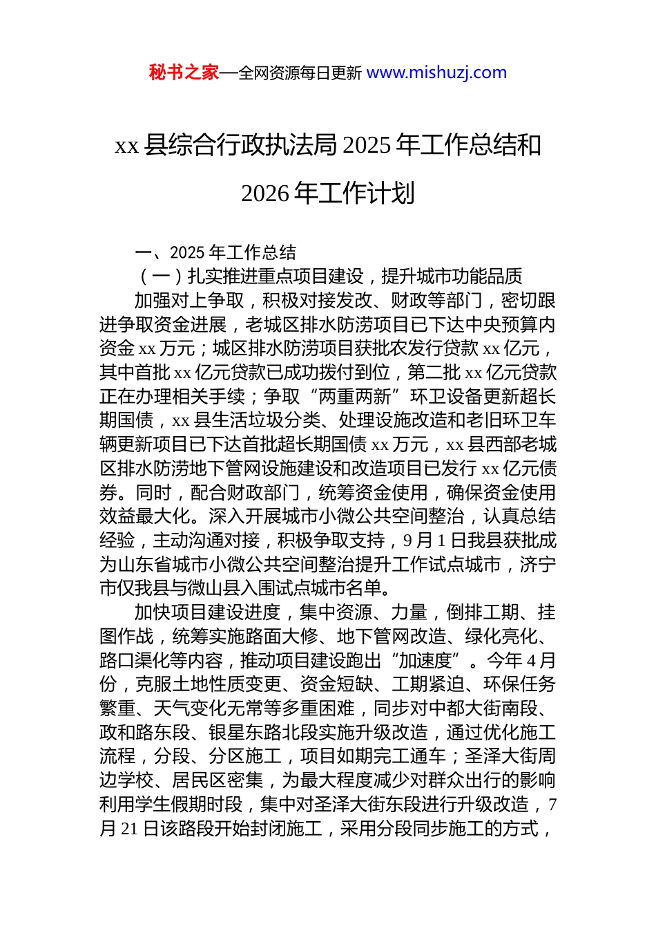 秘书之家—全网资源每日更新 www.mishuzj.comxx 县综合行政执法局 2025 年工作总结和2026 年工作计划一、2025 年工作总结(一)扎实推进重点项目建设,提升城市功能品质加强对上争取,积极对接发改、财政等部门,密切跟进争取资金进展,老城区排水防涝项目已下达中央预算内资金 xx 万元;城区排水防涝项目获批农发行贷款 xx 亿元,其中首批 xx 亿元贷款已成功拨付到位,第二批 xx 亿元贷款正在办理相关手续;争取“两重两新”环卫设备更新超长期国债,xx 县生活垃圾分类、处理设施改造和老旧环卫车辆更新项目已下达首批超长期国债 xx 万元,xx 县西部老城区排水防涝地下管网设施建设和改造项目已发行 xx 亿元债券。同时,配合财政部门,统筹资金使用,确保资金使用效益最大化。深入开展城市小微公共空间整治,认真总结经验,主动沟通对接,积极争取支持,9 月 1 日我县获批成为山东省城市小微公共空间整治提升工作试点城市,济宁市仅我县与微山县入围试点城市名单。加快项目建设进度,集中资源、力量,倒排工期、挂图作战,统筹实施路面大修、地下管网改造、绿化亮化、路口渠化等内容,推动项目建设跑出“加速度”。今年 4 月份,克服土地性质变更、资金短缺、工期紧迫、环保任务繁重、天气变化无常等多重困难,同步对中都大街南段、政和路东段、银星东路北段实施升级改造,通过优化施工流程,分段、分区施工,项目如期完工通车;圣泽大街周边学校、居民区密集,为最大程度减少对群众出行的影响利用学生假期时段,集中对圣泽大街东段进行升级改造,7月 21 日该路段开始封闭施工,采用分段同步施工的方式,秘书之家—全网资源每日更新 www.mishuzj.com经过一个多月的昼夜奋战,8 月底各分段路面具备通车条件,先行开放交通,切实满足了假期后群众的通行需求,目前道路已全线贯通。(二)做好精细化管理,提升城市管理效能深入开展“城市管理品质提升年”活动,实施市容市貌、市政设施、园林绿化、环境卫生等“四大”提升攻坚行动,通过精细化、网格化、智能化提升城市管理水平,在全市上半年城市管理效能评价中,我县城市管理工作成效显著。坚持“堵疏结合”原则,统筹考虑交通流量、周边小区、消防安全和环境秩序等因素,因地制宜设置了 7 处潮汐摊区,按照“一规范、两疏导、三统一、四严禁”的规定要求,规范摊区管理,切实管好城市微环境,5 月底通过市级验收,完成市政府“民生实事”项目建设任务。强化数字赋能,实施城市智慧化运行管理,不断拓展完善平台应用,打造油烟监管、门前五包管理、城市防汛指挥、共享电单车管理等应用场景,牵头起草市级《共享单车政府监管系统建设规范》,推出城管 ai 能力中心、非接触式市容市貌管理系统、城市建筑垃圾管理平台等一系列创新应用项目,其中,“ai 赋能打造城市‘智治’新场景”获评山东省公共视频智能应用示范案例;“非接触式市容市貌管理服务系统”、“城市建筑垃圾管理平台”荣获国家版权局著作权登记认证,推动城市管理精细化、常态化水平持续提升。截至目前,累计完成信息采集 68295 件,快速上报 案 件 13540 件 , 派 遣 并 处 置 案 件 52657 件 , 处 置 率99.32%,按期结案率 99.35%。(三)守好城市防汛底线,守护城市安全运行完善城市防汛应急预案,强化防汛队伍建设,加强防汛物质储备,深入开展风险隐患排查整治,对城区 5658 个雨水井、3212 个污水井,9845 个雨水篦子进行常态化管理养护,检查防坠网,切实守护群众“脚下安全”。组织开展城市防汛全要素演练,积极参与市、县防汛综合演练,秘书之家—全网资源每日更新 www.mishuzj.com加强技能培训,提升应急抢险能力。强化汛期值班值守,严格执行 24 小时值班制度和领导带班制度,及时发布预警信息,做到“六个提前”,提前布置泵车、提前运行泵站提前提闸塌坝、提前混编联动、提前安排部署、提前到岗到位,确保紧急情况及时上报、快速处置,圆满完成了2025 年汛期城市防汛任务。2025 年受理道路积水类工单 14笔,同比下降 51.7%,城市安全韧性进一步提升。(四)强化交通秩序整治,营造畅...