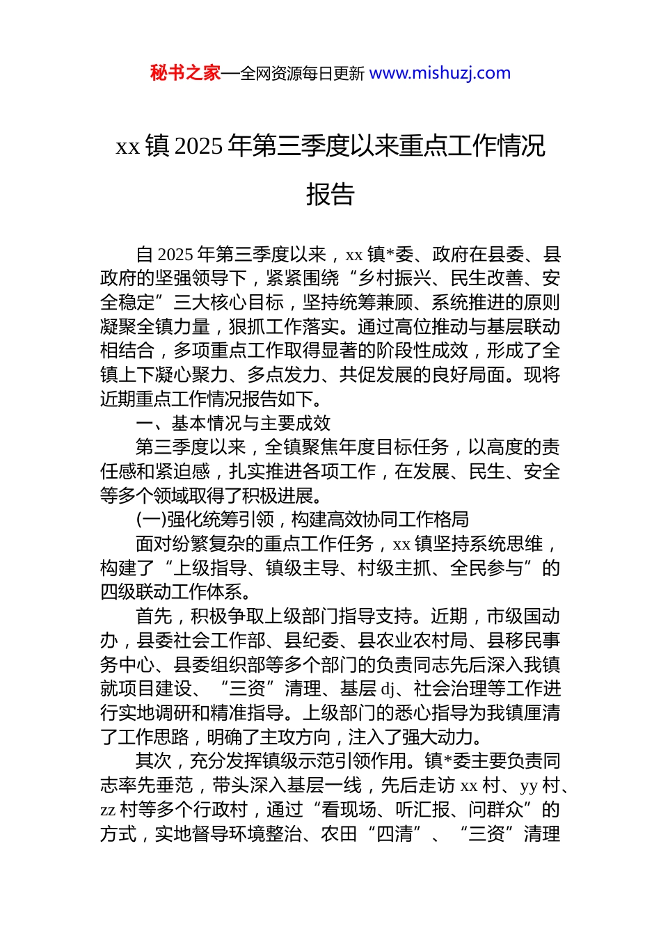 秘书之家—全网资源每日更新 www.mishuzj.comxx 镇 2025 年第三季度以来重点工作情况报告自 2025 年第三季度以来,xx 镇*委、政府在县委、县政府的坚强领导下,紧紧围绕“乡村振兴、民生改善、安全稳定”三大核心目标,坚持统筹兼顾、系统推进的原则凝聚全镇力量,狠抓工作落实。通过高位推动与基层联动相结合,多项重点工作取得显著的阶段性成效,形成了全镇上下凝心聚力、多点发力、共促发展的良好局面。现将近期重点工作情况报告如下。一、基本情况与主要成效第三季度以来,全镇聚焦年度目标任务,以高度的责任感和紧迫感,扎实推进各项工作,在发展、民生、安全等多个领域取得了积极进展。(一)强化统筹引领,构建高效协同工作格局面对纷繁复杂的重点工作任务,xx 镇坚持系统思维,构建了“上级指导、镇级主导、村级主抓、全民参与”的四级联动工作体系。首先,积极争取上级部门指导支持。近期,市级国动办,县委社会工作部、县纪委、县农业农村局、县移民事务中心、县委组织部等多个部门的负责同志先后深入我镇就项目建设、“三资”清理、基层 dj、社会治理等工作进行实地调研和精准指导。上级部门的悉心指导为我镇厘清了工作思路,明确了主攻方向,注入了强大动力。其次,充分发挥镇级示范引领作用。镇*委主要负责同志率先垂范,带头深入基层一线,先后走访 xx 村、yy 村、zz 村等多个行政村,通过“看现场、听汇报、问群众”的方式,实地督导环境整治、农田“四清”、“三资”清理秘书之家—全网资源每日更新 www.mishuzj.com等工作进度,现场协调解决难点问题。在主要领导的带动下,全镇干部职工严格执行“分片包村、责任到人”的工作机制,下沉至各自驻点村,与村“两委”干部并肩作战形成了“主要领导带头抓、分管领导具体抓、驻村干部抓落实”的责任闭环,确保了各项决策部署不折不扣落到实处。最后,全面激发村级组织能动作用。各村*组织积极响应镇*委、政府号召,立足本村实际,创造性地开展工作。将环境整治与生态保护相结合,将民生保障与乡村治理相融合,将安全稳定与项目建设相统筹,有效调动了广大村民的积极性和参与感,呈现出“村村有行动、户户见实效”的生动景象。据初步统计,第三季度以来,全镇累计动员镇村干部及志愿者达 1200 余人次,开展各类集中行动80 余场,解决群众急难愁盼问题超过 150 个。(二)聚焦乡村振兴,夯实高质量发展根基乡村振兴是新时代“三农”工作的总抓手。我镇坚持把产业发展和项目建设作为推动乡村振兴的核心引擎,持续用力,久久为功。在项目建设方面,重点推进了一批强基础、利长远的工程。特别是 xx 移民后期扶持项目,在县移民事务中心的指导下,镇*委委员、副镇长 xx 同志靠前指挥,协调施工单位,倒排工期、挂图作战,确保项目建设进度和质量。截至目前,该项目已完成总工程量的 75%,预计将于明年上半年全面竣工,届时将有效改善相关区域的基础设施条件和人居环境。同时,持续巩固拓展脱贫攻坚成果,严格落实防返贫动态监测和帮扶机制,对全镇 xx 户监测对象逐一进行走访核查,确保不发生规模性返贫现象。在产业发展方面,立足本镇资源禀赋,做优做强特色农业。依托现有的万亩油茶基地和千亩蓝莓基地等产业基础,积极引进农业新技术、新品种,引导农户和新型经营主体发展生态农业、观光农业,提升农产品附加值。通过秘书之家—全网资源每日更新 www.mishuzj.com“公司+基地+农户”等模式,带动超过 500 户农户实现稳定增收,户均年增收约 xx 元。此外,粮食生产工作常抓不懈,坚决遏制耕地“非农化”、防止“非粮化”,全面完成上级下达的粮食播种面积和产量任务,为保障粮食安全贡献 xx 力量。(三)聚焦民生改善,提升人民群众幸福感和获得感我镇始终坚持以人民为中心的发展思想,将有限的财力、物力向民生领域倾斜,着力解决群众最关心、最直接最现实的利益问题。一是深入推进人居环境整治。以农田“四清”为抓手,在全镇范围内掀起了一场声势浩大的人居环境“净化、绿化、美化”攻坚战。各村组织力量对村庄内外、田间地头的生产生活垃圾、乱堆乱放、残垣断壁进行集中清理。通过集中整治...