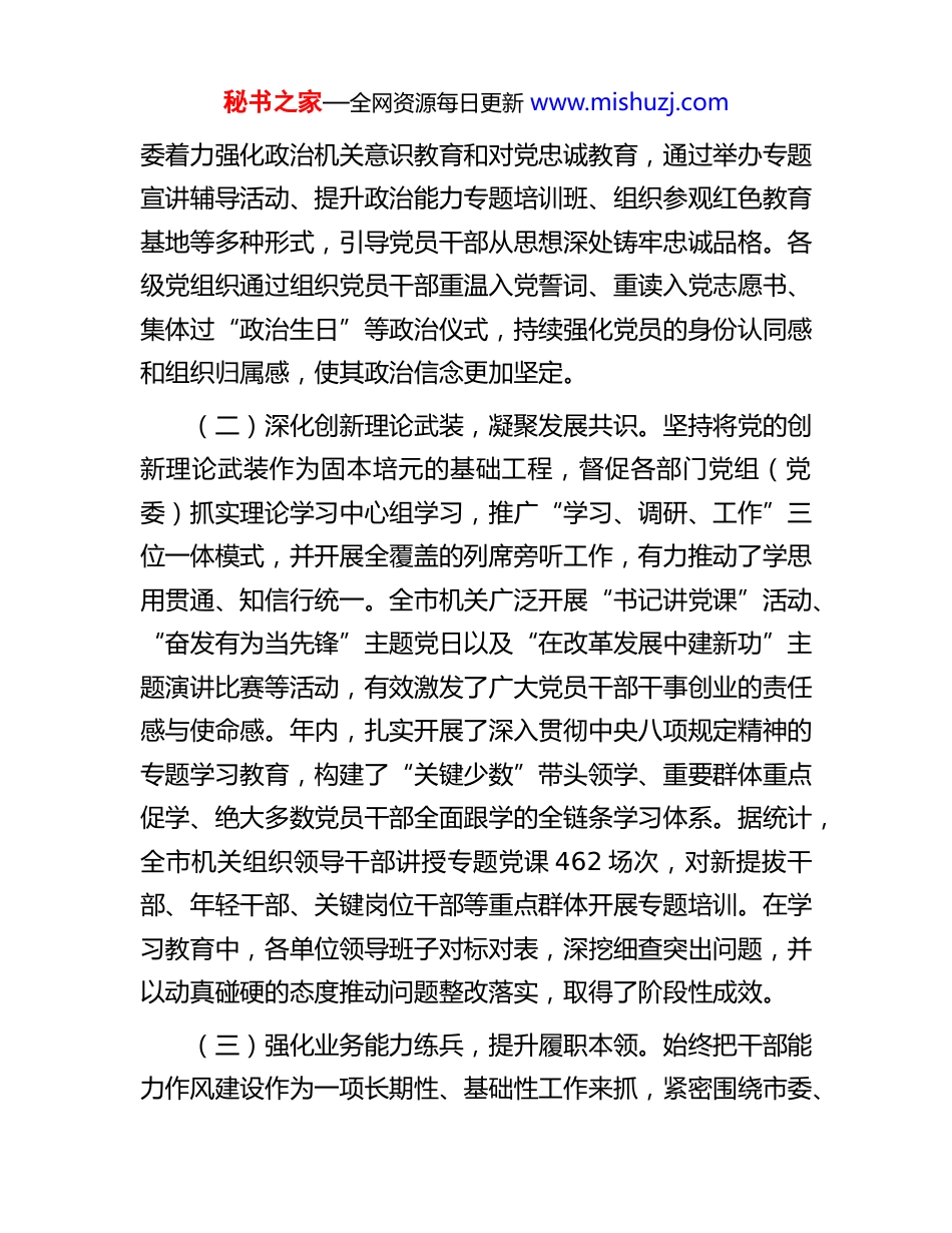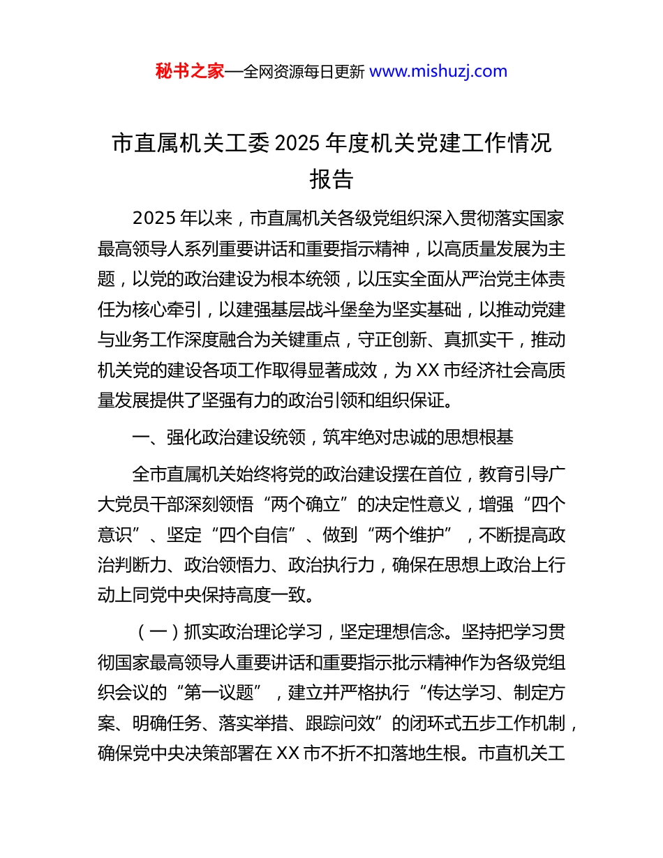 秘书之家—全网资源每日更新 www.mishuzj.com市直属机关工委 2025 年度机关党建工作情况报告2025 年以来,市直属机关各级党组织深入贯彻落实国家最高领导人系列重要讲话和重要指示精神,以高质量发展为主题,以党的政治建设为根本统领,以压实全面从严治党主体责任为核心牵引,以建强基层战斗堡垒为坚实基础,以推动党建与业务工作深度融合为关键重点,守正创新、真抓实干,推动机关党的建设各项工作取得显著成效,为 XX 市经济社会高质量发展提供了坚强有力的政治引领和组织保证。一、强化政治建设统领,筑牢绝对忠诚的思想根基全市直属机关始终将党的政治建设摆在首位,教育引导广大党员干部深刻领悟“两个确立”的决定性意义,增强“四个意识”、坚定“四个自信”、做到“两个维护”,不断提高政治判断力、政治领悟力、政治执行力,确保在思想上政治上行动上同党中央保持高度一致。(一)抓实政治理论学习,坚定理想信念。坚持把学习贯彻国家最高领导人重要讲话和重要指示批示精神作为各级党组织会议的“第一议题”,建立并严格执行“传达学习、制定方案、明确任务、落实举措、跟踪问效”的闭环式五步工作机制,确保党中央决策部署在 XX 市不折不扣落地生根。市直机关工秘书之家—全网资源每日更新 www.mishuzj.com委着力强化政治机关意识教育和对党忠诚教育,通过举办专题宣讲辅导活动、提升政治能力专题培训班、组织参观红色教育基地等多种形式,引导党员干部从思想深处铸牢忠诚品格。各级党组织通过组织党员干部重温入党誓词、重读入党志愿书、集体过“政治生日”等政治仪式,持续强化党员的身份认同感和组织归属感,使其政治信念更加坚定。(二)深化创新理论武装,凝聚发展共识。坚持将党的创新理论武装作为固本培元的基础工程,督促各部门党组(党委)抓实理论学习中心组学习,推广“学习、调研、工作”三位一体模式,并开展全覆盖的列席旁听工作,有力推动了学思用贯通、知信行统一。全市机关广泛开展“书记讲党课”活动、“奋发有为当先锋”主题党日以及“在改革发展中建新功”主题演讲比赛等活动,有效激发了广大党员干部干事创业的责任感与使命感。年内,扎实开展了深入贯彻中央八项规定精神的专题学习教育,构建了“关键少数”带头领学、重要群体重点促学、绝大多数党员干部全面跟学的全链条学习体系。据统计,全市机关组织领导干部讲授专题党课 462 场次,对新提拔干部、年轻干部、关键岗位干部等重点群体开展专题培训。在学习教育中,各单位领导班子对标对表,深挖细查突出问题,并以动真碰硬的态度推动问题整改落实,取得了阶段性成效。(三)强化业务能力练兵,提升履职本领。始终把干部能力作风建设作为一项长期性、基础性工作来抓,紧密围绕市委、秘书之家—全网资源每日更新 www.mishuzj.com市政府部署的优化营商环境、降低全社会物流成本、现代农业产业发展等“三个一号工程”,精心设计了一系列特色培训课程。其中包括依托本地高校资源的“XX 共建”名师特色课、发挥传帮带作用的领导骨干帮带课,以及聚焦专业领域的“淬炼赋能”重点领域专业课,举办跨部门、跨系统的联学讲堂,有效拓宽了干部视野。同时,根据不同行业、部门及岗位的实际需求,聚焦社会治理、应急处置、项目建设等重点工作,显著提升了干部队伍的专业素养和实战能力。二、夯实基层组织基础,提升机关党建的整体效能全市直属机关牢固树立大抓基层的鲜明导向,坚持问题导向和目标导向相结合,持续用力推动基层党组织在标准化、规范化建设上取得新突破,实现全面进步、全面过硬。(一)压实贯通到底的党建责任体系。为解决机关党建“上热中温下冷”问题,研究建立了知责明责、履责尽责、督责考责的闭环式工作机制,有力推动了各部门党组(党委)切实当好主角、抓好主业、履行好主责。工委制定印发了《市直机关部门党组(党委)落实机关党建主体责任指引清单》,清晰界定了 4 类责任主体和 22 项主要职责任务,为各级党组织履责提供了明确依据,推动了知责于心、担责于身、履责于行。同时,不断完善新任职党组织书记任前谈话、基本制度落实情况抽查调阅、党组织换届到期提醒...