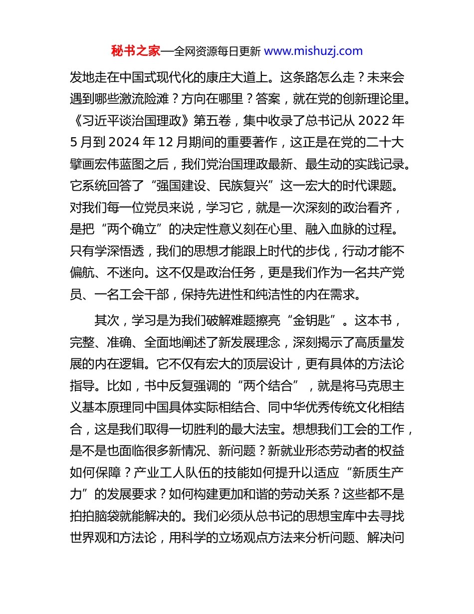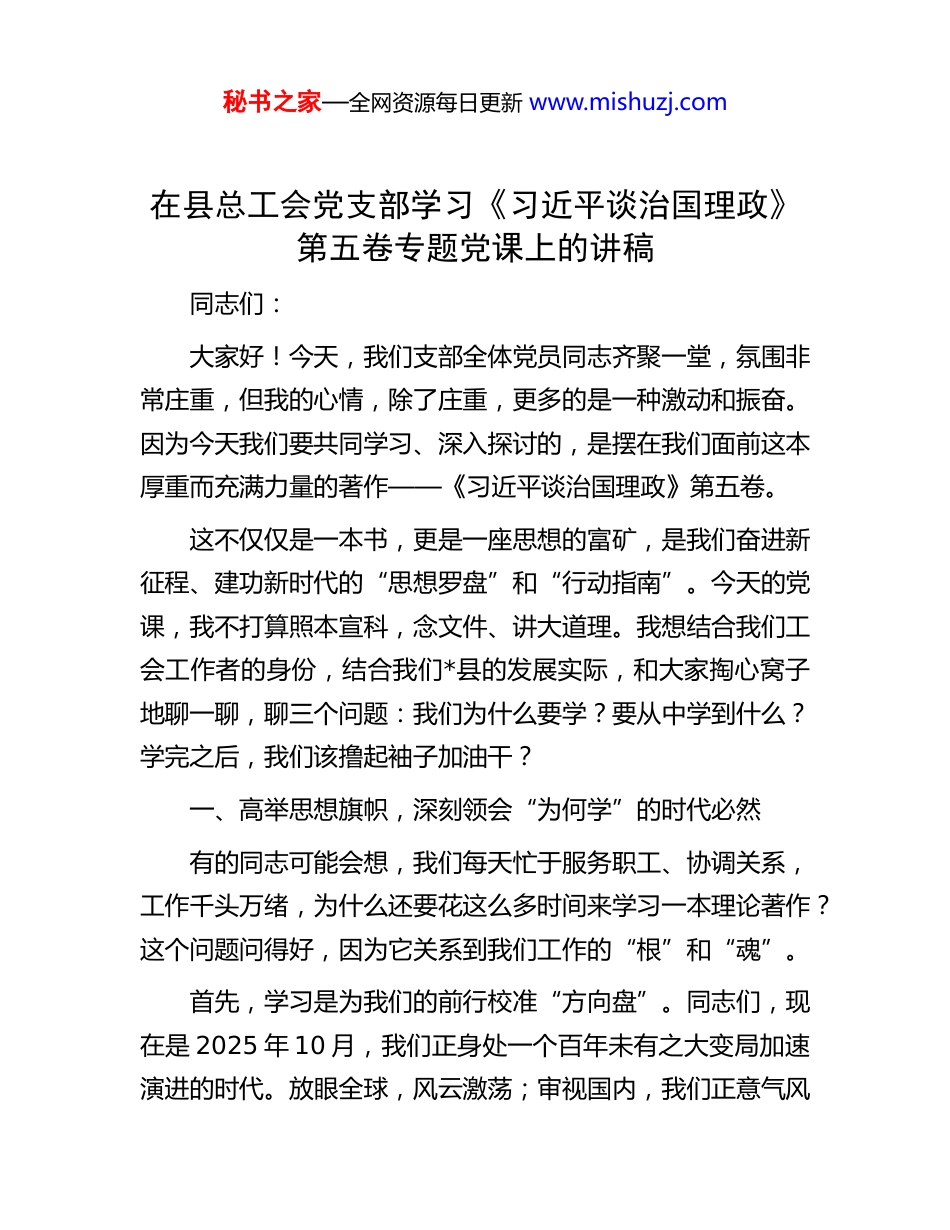 秘书之家—全网资源每日更新 www.mishuzj.com在县总工会党支部学习《习近平谈治国理政》第五卷专题党课上的讲稿同志们:大家好!今天,我们支部全体党员同志齐聚一堂,氛围非常庄重,但我的心情,除了庄重,更多的是一种激动和振奋。因为今天我们要共同学习、深入探讨的,是摆在我们面前这本厚重而充满力量的著作——《习近平谈治国理政》第五卷。这不仅仅是一本书,更是一座思想的富矿,是我们奋进新征程、建功新时代的“思想罗盘”和“行动指南”。今天的党课,我不打算照本宣科,念文件、讲大道理。我想结合我们工会工作者的身份,结合我们*县的发展实际,和大家掏心窝子地聊一聊,聊三个问题:我们为什么要学?要从中学到什么?学完之后,我们该撸起袖子加油干?一、高举思想旗帜,深刻领会“为何学”的时代必然有的同志可能会想,我们每天忙于服务职工、协调关系,工作千头万绪,为什么还要花这么多时间来学习一本理论著作?这个问题问得好,因为它关系到我们工作的“根”和“魂”。首先,学习是为我们的前行校准“方向盘”。同志们,现在是 2025 年 10 月,我们正身处一个百年未有之大变局加速演进的时代。放眼全球,风云激荡;审视国内,我们正意气风秘书之家—全网资源每日更新 www.mishuzj.com发地走在中国式现代化的康庄大道上。这条路怎么走?未来会遇到哪些激流险滩?方向在哪里?答案,就在党的创新理论里。《习近平谈治国理政》第五卷,集中收录了总书记从 2022 年5 月到 2024 年 12 月期间的重要著作,这正是在党的二十大擘画宏伟蓝图之后,我们党治国理政最新、最生动的实践记录。它系统回答了“强国建设、民族复兴”这一宏大的时代课题。对我们每一位党员来说,学习它,就是一次深刻的政治看齐,是把“两个确立”的决定性意义刻在心里、融入血脉的过程。只有学深悟透,我们的思想才能跟上时代的步伐,行动才能不偏航、不迷向。这不仅是政治任务,更是我们作为一名共产党员、一名工会干部,保持先进性和纯洁性的内在需求。其次,学习是为我们破解难题擦亮“金钥匙”。这本书,完整、准确、全面地阐述了新发展理念,深刻揭示了高质量发展的内在逻辑。它不仅有宏大的顶层设计,更有具体的方法论指导。比如,书中反复强调的“两个结合”,就是将马克思主义基本原理同中国具体实际相结合、同中华优秀传统文化相结合,这是我们取得一切胜利的最大法宝。想想我们工会的工作,是不是也面临很多新情况、新问题?新就业形态劳动者的权益如何保障?产业工人队伍的技能如何提升以适应“新质生产力”的发展要求?如何构建更加和谐的劳动关系?这些都不是拍拍脑袋就能解决的。我们必须从总书记的思想宝库中去寻找世界观和方法论,用科学的立场观点方法来分析问题、解决问秘书之家—全网资源每日更新 www.mishuzj.com题。这本书,就是我们破解工作难题、提升履职能力的“金钥匙”。最后,学习是为我们砥砺初心注入“强心剂”。总书记在书中反复强调“江山就是人民,人民就是江山”。我们工会是党联系职工群众的桥梁和纽带,我们的初心和使命,就是全心全意为职工群众服务。有时候工作累了、倦了,甚至受了委屈,不妨静下心来读一读。字里行间那种深厚的人民情怀,那种“我将无我,不负人民”的责任担当,会像一股暖流,重新点燃我们心中的火焰,让我们时刻牢记,我们是谁、为了谁、依靠谁。所以说,学习《习近平谈治国理政》第五卷,不是一个可有可无的选项,而是一门必须学好、学透的必修课。它关乎方向,关乎能力,更关乎我们共产党人的初心使命。二、把握精髓要义,精准弄懂“学什么”的核心内涵这本书内容博大精深,分为 18 个专题,共 91 篇文章。我们不可能一口吃成个胖子。但有几个核心要义,我认为是必须牢牢把握的。第一,要学懂“中国式现代化”这个最大的政治。“中国式现代化”是贯穿第五卷的一条鲜明主线。总书记深刻指出,中国式现代化是我们党领导人民长期探索和实践的重大成果。它不是西方现代化的翻版,而是人口规模巨大的现代化,是全体人民共同富裕的现代化,是物质文明和精神文明相协调的现秘书之家—全网资源每日更新 www.mishuzj.com代...