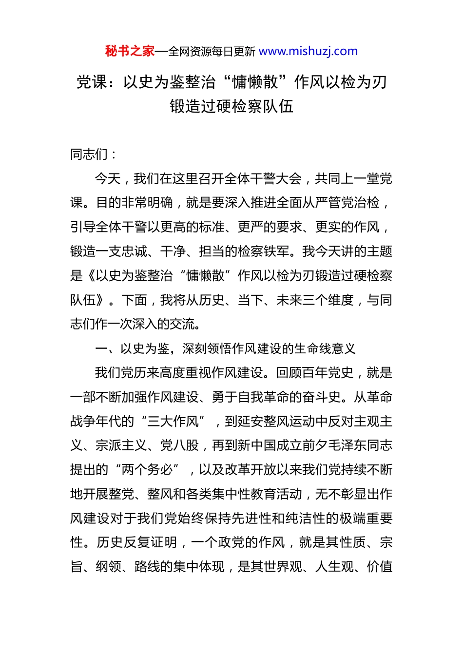 秘书之家—全网资源每日更新 www.mishuzj.com党课:以史为鉴整治“慵懒散”作风以检为刃锻造过硬检察队伍 同志们:今天,我们在这里召开全体干警大会,共同上一堂党课。目的非常明确,就是要深入推进全面从严管党治检,引导全体干警以更高的标准、更严的要求、更实的作风,锻造一支忠诚、干净、担当的检察铁军。我今天讲的主题是《以史为鉴整治“慵懒散”作风以检为刃锻造过硬检察队伍》。下面,我将从历史、当下、未来三个维度,与同志们作一次深入的交流。一、以史为鉴,深刻领悟作风建设的生命线意义我们党历来高度重视作风建设。回顾百年党史,就是一部不断加强作风建设、勇于自我革命的奋斗史。从革命战争年代的“三大作风”,到延安整风运动中反对主观主义、宗派主义、党八股,再到新中国成立前夕毛泽东同志提出的“两个务必”,以及改革开放以来我们党持续不断地开展整党、整风和各类集中性教育活动,无不彰显出作风建设对于我们党始终保持先进性和纯洁性的极端重要性。历史反复证明,一个政党的作风,就是其性质、宗旨、纲领、路线的集中体现,是其世界观、人生观、价值秘书之家—全网资源每日更新 www.mishuzj.com观的外在反映。作风问题绝不是小事,它关系到党的形象,关系到人心向背,关系到党的生死存亡。作为党绝对领导下的政治机关、法律监督机关和司法机关,我们检察机关是党的作风建设的重要窗口和前沿阵地。检察队伍的作风,直接影响着司法公信力,影响着人民群众对公平正义的切身感受,影响着党和政府在人民心中的形象。因此,我们必须从党的百年奋斗史中汲取磅礴的自我革命力量,深刻认识到,加强作风建设,不仅是管党治党的普遍要求,更是我们检察机关履行好新时代法律监督职责、服务保障中国式现代化建设的内在需要和必然选择。当前,我们队伍的主流是好的,是忠诚可靠、敢于担当的。但我们也要清醒地看到,一些不良作风,特别是“慵、懒、散”等沉疴顽疾,在少数干警身上依然不同程度地存在,它像病毒一样侵蚀着我们队伍的肌体,必须下大气力予以整治。这种整治,不是权宜之计,而是一场必须打赢的、持久的自我革命。二、立足当下,精准透视“慵懒散”作风的现实危害习近平总书记深刻指出:“‘慵懒散’是当前干部队伍中存在的突出问题,务必下大气力解决。”结合我们检察工作的实际,我们必须对“慵懒散”的具体表现及其危害有精准的画像和清醒的认识。秘书之家—全网资源每日更新 www.mishuzj.com(一)“慵”——精神懈怠,不思进取,是能力建设的“绊脚石”。“慵”的病根在于思想上的惰性。主要表现为安于现状,缺乏学习热情和进取精神。有的同志满足于“吃老本”,对新时代、新形势下检察工作的新理念、新要求学习不深、研究不透,面对大数据、人工智能等新技术赋能法律监督的趋势,存在“本领恐慌”却无动于衷。对新出台的法律法规、司法解释“一知半解”,办案依然沿用老经验、老办法,导致监督能力和水平停滞不前。有的同志缺乏钻研精神,满足于办完案子,对案件背后的社会治理问题、类案监督要点不愿深入思考,精品意识、极致思维严重缺失。还有的同志精神萎靡,工作“佛系”,对待任务“不求有功、但求无过”,满足于“大概”“差不多”,缺乏争创一流的志气和劲头。这种“慵”病,看似无伤大雅,实则危害甚巨。它直接导致我们的干警在面对新型、复杂案件时力不从心,法律监督的精准度和力度大打折扣。根据院里 2025 年第三季度的一项内部调研,我们发现有近 15%的员额检察官在过去半年内,未能系统学习过一部新颁布的重点法律或司法解释,业务知识更新明显滞后。这种精神上的“缺钙”,是锻造高素质专业化检察队伍的最大障碍。(二)“懒”——推诿扯皮,效率低下,是司法为民秘书之家—全网资源每日更新 www.mishuzj.com的“拦路虎”。“懒”的病根在于责任心的缺失。主要表现为工作上拈轻怕重、敷衍塞责。有的同志对待案件能拖就拖,办案节奏缓慢,不注重诉讼效率,让当事人在焦急等待中消耗对司法的信任。有的同志习惯于当“二传手”,遇到疑难复杂问题,不是主动研究、积极破解,而是习惯性向上级请示、向同级推诿,把责任“甩出去...