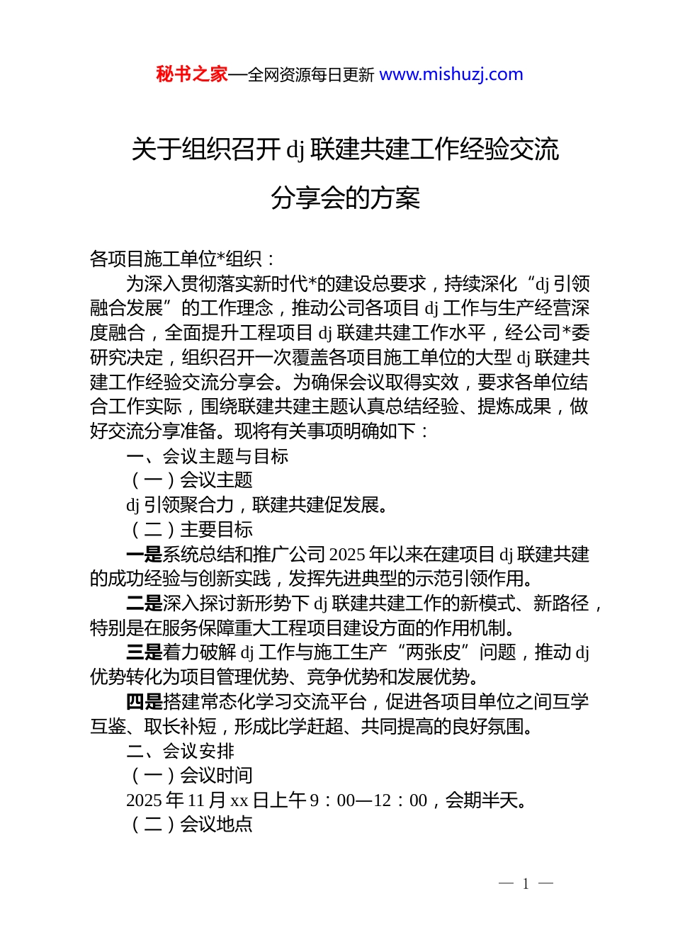 秘书之家—全网资源每日更新 www.mishuzj.com关于组织召开 dj 联建共建工作经验交流分享会的方案各项目施工单位*组织:为深入贯彻落实新时代*的建设总要求,持续深化“dj 引领融合发展”的工作理念,推动公司各项目 dj 工作与生产经营深度融合,全面提升工程项目 dj 联建共建工作水平,经公司*委研究决定,组织召开一次覆盖各项目施工单位的大型 dj 联建共建工作经验交流分享会。为确保会议取得实效,要求各单位结合工作实际,围绕联建共建主题认真总结经验、提炼成果,做好交流分享准备。现将有关事项明确如下:一、会议主题与目标(一)会议主题dj 引领聚合力,联建共建促发展。(二)主要目标一是系统总结和推广公司 2025 年以来在建项目 dj 联建共建的成功经验与创新实践,发挥先进典型的示范引领作用。二是深入探讨新形势下 dj 联建共建工作的新模式、新路径,特别是在服务保障重大工程项目建设方面的作用机制。三是着力破解 dj 工作与施工生产“两张皮”问题,推动 dj优势转化为项目管理优势、竞争优势和发展优势。四是搭建常态化学习交流平台,促进各项目单位之间互学互鉴、取长补短,形成比学赶超、共同提高的良好氛围。二、会议安排(一)会议时间2025 年 11 月 xx 日上午 9:00—12:00,会期半天。(二)会议地点— 1 —秘书之家—全网资源每日更新 www.mishuzj.com公司总部 xx 会议中心。(三)参会人员公司*委主要领导、分管领导;公司*委工作部、工程管理部等相关职能部门负责人;各项目施工单位*组织书记、项目经理、*务工作负责人。(四)会议议程主持人:公司*委副书记 xxx9:00—9:10 公司*委书记 xxx 同志致开幕词,阐明会议重要意义并提出要求。9:10—10:50 优秀单位经验交流分享。选取 4 家在 dj 联建共建方面成效显著的单位作典型发言,每家单位发言时间控制在 25 分钟以内。10:50—11:10 互动交流与提问。参会人员可就关心的问题与发言单位进行现场互动。11:10—11:40 特邀 dj 专家 xxx 教授作专题点评与辅导。专家将结合各单位分享内容,从理论和实践层面进行点评,并就如何深化联建共建工作提出指导性意见。11:40—12:00 公司总经理、*委副书记 xxx 同志作总结讲话,部署下一步重点工作。三、经验交流材料撰写要求为做好本次经验交流,请各单位*组织牵头,认真撰写经验交流材料。材料应符合公开发表要求,确保内容真实、数据准确、案例生动。具体要求如下:(一)突出主题,聚焦实践材料内容必须紧扣“dj 联建共建”这一核心主题,杜绝空泛议论,避免写成常规的工作总结。要重点围绕如何通过与业主、监理、分包单位、地方社区乃至科研院所等不同主体开展dj 联建,有效凝聚各方力量,共同服务项目建设这一主线展开。要突出实践特色,用翔实的事例和数据说话。— 2 —秘书之家—全网资源每日更新 www.mishuzj.com(二)内容详实,各有侧重各单位在全面总结的基础上,可根据自身特色选择 1-2 个方面进行重点阐述和深度剖析,力求“人无我有、人有我优、人优我精”。撰写内容可参考以下几个方面:一是聚焦“政治理论联学”,筑牢思想根基。详细阐述如何通过建立联学小组、举办专题读书班、邀请专家共同授课、共过主题*日、共建紅色教育基地等方式,打破组织壁垒,提升全体参建*员的政治理论水平和思想觉悟,将学习成果转化为统一思想、共克时艰的强大动力。二是聚焦“优势资源联享”,破解发展难题。具体介绍如何通过联建平台,实现人员、技术、信息、设备等关键资源的共享与互补。诸如,在面对重大技术瓶颈时,如何通过与 xx 设计院或 xx 大学的专家*员建立联合攻关小组,成功解决技术难题;在物资采购困难时,如何借助业主单位的资源渠道,保障了关键材料的及时供应。据统计,2025 年以来,通过联建共建模式,各项目累计解决技术与管理难题 80 余项,有效保障了工程进度。三是聚焦“中心工作联促”,服务工程建设。这是衡量联建共建成效的核心标准。要重点说明 dj 联建如何与项目安全生产、质量管控、进度管理、成本控制等中心工作深度融合。包括如何通过组建“*员先锋队”“...