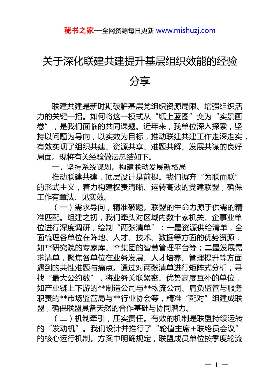 秘书之家—全网资源每日更新 www.mishuzj.com关于深化联建共建提升基层组织效能的经验分享联建共建是新时期破解基层党组织资源局限、增强组织活力的关键一招。如何将这一模式从“纸上蓝图”变为“实景画卷”,是我们面临的共同课题。近年来,我单位深入探索,坚持以问题为导向,以实效为目标,推动联建共建工作走深走实,有效实现了组织共建、资源共享、难题共解、发展共谋的良好局面。现将有关经验做法总结如下。一、坚持系统谋划,构建联动发展新格局推动联建共建,顶层设计是前提。我们摒弃“为联而联”的形式主义,着力构建权责清晰、运转高效的党建联盟,确保工作有章法、见实效。(一)需求导向,精准破题。联盟的生命力源于供需的精准匹配。组建之初,我们牵头对区域内数十家机关、企事业单位进行深度调研,绘制“两张清单”:一是资源供给清单,全面梳理各单位在阵地、人才、技术、数据等方面的优势资源,如**研究院的专家库、**集团的智慧管理平台等;二是发展需求清单,聚焦各单位在业务发展、人才培养、管理提升等方面遇到的共性难题与痛点。通过对两张清单进行矩阵式分析,寻找“最大公约数”,将业务关联紧密、优势高度互补的单位,如产业链上下游的**制造公司与**物流公司、肩负监管与服务职责的**市场监管局与**行业协会等,精准“配对”组建成联盟,确保联盟具备天然的合作基础与协同潜力。(二)机制牵引,压实责任。有效的机制是联盟持续运转的“发动机”。我们设计并推行了“轮值主席+联络员会议”的核心运行机制。方案中明确规定,联盟成员单位按季度轮流— 1 —秘书之家—全网资源每日更新 www.mishuzj.com担任轮值主席,任期内主席单位不仅是活动的“召集人”,更是成效的“第一责任人”,负责当期重大活动的策划、组织、协调与总结。为杜绝“轮流坐庄、敷衍了事”,我们将轮值期间的工作成效与该单位年度党建考核、评优评先资格进行强关联,倒逼轮值主席单位主动作为。同时,建立每月一次的联络员会议制度,及时沟通进展、协调问题、部署任务,确保联盟各项工作有人抓、有人管、能落地。(三)内容为王,深度融合。联建共建的价值在于服务中心大局,而非“体内循环”式的自娱自乐。我们坚持将活动内容聚焦于区域发展的中心任务和成员单位的业务痛点,全面推行“项目化”运作模式。2025 年,围绕“优化**片区营商环境”的共同目标,我们策划实施了“红帆领航”系列行动。该项目整合了“理论联学、难题联解、队伍联建、服务联动”四大模块:组织成员单位共同学习最新的减税降费政策;组建联合调研组,深入走访 50 余家中小企业,现场解决融资、审批等难题 18 个;推行党员干部交叉挂职,让机关干部到企业一线体察实情,让企业骨干到机关跟班学习,换位思考增进理解;联合开展“送政策、送服务”上门活动。最终,项目成果不仅体现为一份高质量的《关于提升**新区产业配套服务能力的联合调研报告》,更直接推动了一项“一站式”企业服务流程的优化,真正实现了党建与业务的同频共振。(四)流程管控,闭环落实。从“想法”到“办法”再到“成效”,离不开精细化的过程管理。我们为联盟活动制定了“计划-执行-反馈-复盘”的闭环管理流程。轮值单位须在每季度初提交详尽的年度活动计划表,明确时间、地点、目标、预算及责任人。活动结束后 5 个工作日内,必须提交图文并茂的活动简报和成效总结。联盟秘书处定期对活动台账进行检查,确保所有计划按时推进。上级党组织则扮演“监督员”与“协调员”的角色,对执行不力的单位及时提醒,对活动中遇到的— 2 —秘书之家—全网资源每日更新 www.mishuzj.com跨部门、跨层级难题,主动出面协调资源,保障联盟工作顺畅高效运行。(五)考核激励,激发动能。没有激励的考核是“空头支票”。为确保联盟成员“真投入、真干事”,我们建立了一套与单位、个人利益紧密挂钩的评估激励体系。一方面,将各单位在联盟中的贡献度、参与度以及联建共建成效,作为其年度党建工作考核的核心指标之一,分值权重不低于 20%。在“两优一先”等评选表彰中,优先考虑在联盟工作中表现突出的集体和个人。另一方面,创新经费支...