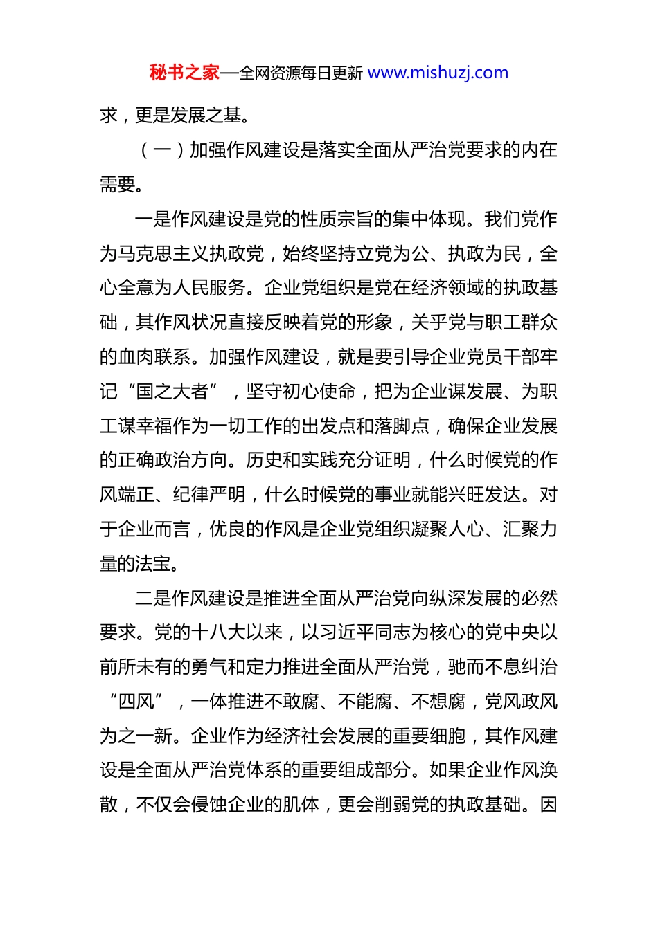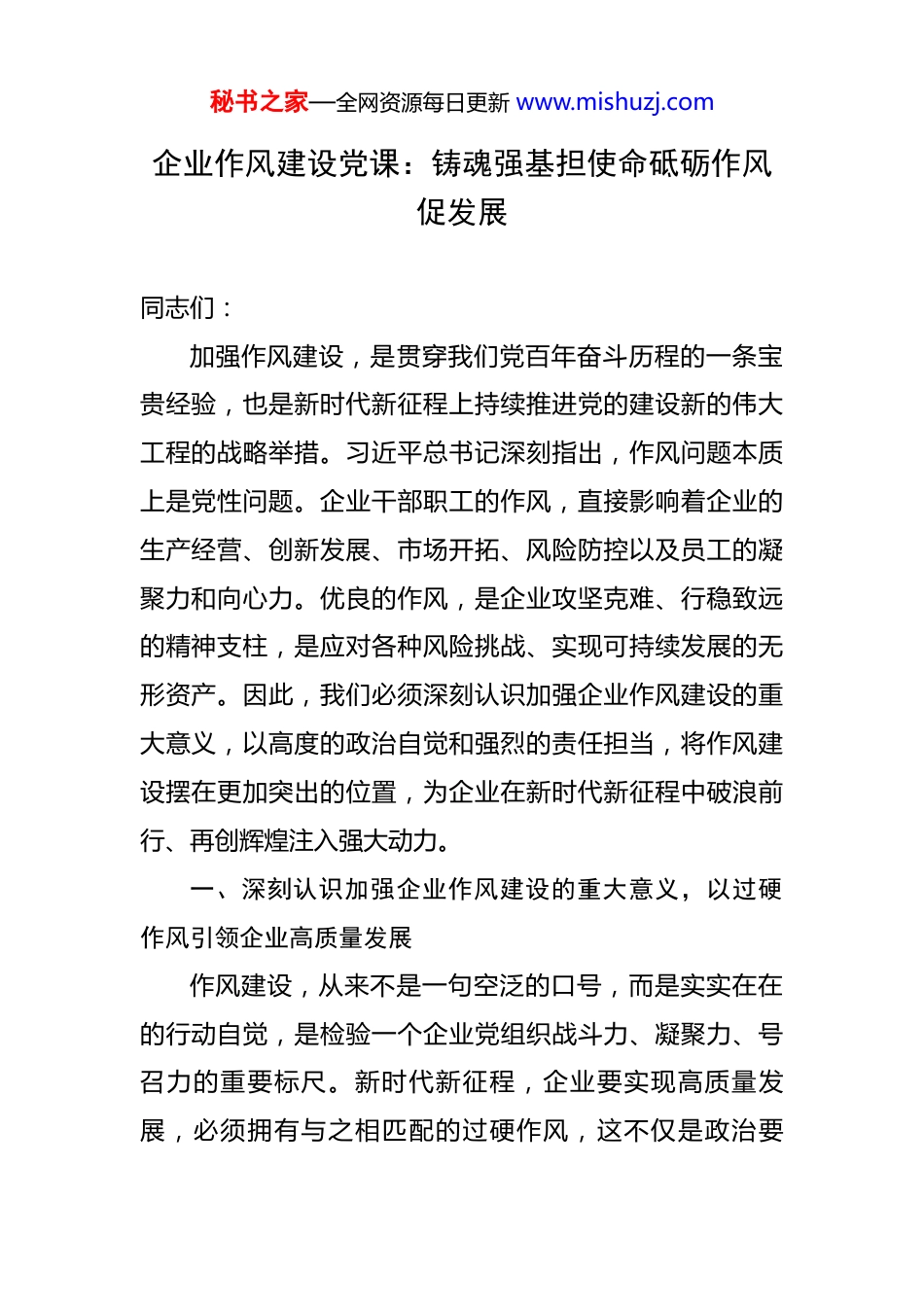 秘书之家—全网资源每日更新 www.mishuzj.com企业作风建设党课:铸魂强基担使命砥砺作风促发展 同志们:加强作风建设,是贯穿我们党百年奋斗历程的一条宝贵经验,也是新时代新征程上持续推进党的建设新的伟大工程的战略举措。习近平总书记深刻指出,作风问题本质上是党性问题。企业干部职工的作风,直接影响着企业的生产经营、创新发展、市场开拓、风险防控以及员工的凝聚力和向心力。优良的作风,是企业攻坚克难、行稳致远的精神支柱,是应对各种风险挑战、实现可持续发展的无形资产。因此,我们必须深刻认识加强企业作风建设的重大意义,以高度的政治自觉和强烈的责任担当,将作风建设摆在更加突出的位置,为企业在新时代新征程中破浪前行、再创辉煌注入强大动力。一、深刻认识加强企业作风建设的重大意义,以过硬作风引领企业高质量发展作风建设,从来不是一句空泛的口号,而是实实在在的行动自觉,是检验一个企业党组织战斗力、凝聚力、号召力的重要标尺。新时代新征程,企业要实现高质量发展,必须拥有与之相匹配的过硬作风,这不仅是政治要秘书之家—全网资源每日更新 www.mishuzj.com求,更是发展之基。(一)加强作风建设是落实全面从严治党要求的内在需要。一是作风建设是党的性质宗旨的集中体现。我们党作为马克思主义执政党,始终坚持立党为公、执政为民,全心全意为人民服务。企业党组织是党在经济领域的执政基础,其作风状况直接反映着党的形象,关乎党与职工群众的血肉联系。加强作风建设,就是要引导企业党员干部牢记“国之大者”,坚守初心使命,把为企业谋发展、为职工谋幸福作为一切工作的出发点和落脚点,确保企业发展的正确政治方向。历史和实践充分证明,什么时候党的作风端正、纪律严明,什么时候党的事业就能兴旺发达。对于企业而言,优良的作风是企业党组织凝聚人心、汇聚力量的法宝。二是作风建设是推进全面从严治党向纵深发展的必然要求。党的十八大以来,以习近平同志为核心的党中央以前所未有的勇气和定力推进全面从严治党,驰而不息纠治“四风”,一体推进不敢腐、不能腐、不想腐,党风政风为之一新。企业作为经济社会发展的重要细胞,其作风建设是全面从严治党体系的重要组成部分。如果企业作风涣散,不仅会侵蚀企业的肌体,更会削弱党的执政基础。因秘书之家—全网资源每日更新 www.mishuzj.com此,必须将全面从严治党的要求延伸到企业的每一个层级、每一个环节,用铁的纪律和过硬的作风,确保党的各项决策部署在企业落地生根、开花结果,为企业健康发展提供坚强政治保证。三是作风建设是净化企业政治生态的关键举措。一个企业的作风好坏,直接决定着其政治生态的清明与否。如果形式主义、官僚主义盛行,不作为、慢作为、乱作为现象突出,甚至滋生腐败问题,那么企业政治生态必然遭到破坏,严重阻碍企业发展。加强作风建设,就是要正本清源,激浊扬清,以雷霆之势整治各种不正之风,构建“亲”“清”统一的政商关系和健康的企业内部关系,营造风清气正、干事创业的良好环境。这不仅是党纪党规的要求,更是企业长远发展的内在需求,有助于凝聚正气、激发活力。(二)加强作风建设是提升企业核心竞争力的必然选择。一是过硬作风是企业创新发展的内生动力。在激烈的市场竞争中,企业要脱颖而出,必须依靠创新驱动。而创新离不开一支敢闯敢试、勇于担当的干部职工队伍。如果企业内部存在安于现状、墨守成规、推诿扯皮、不思进取的作风,那么创新活力就会被扼杀。加强作风建设,就是秘书之家—全网资源每日更新 www.mishuzj.com要破除思想藩篱,激发创新热情,鼓励干部职工解放思想、大胆探索,营造宽容失败、鼓励成功的创新文化,让创新创造成为企业高质量发展的强大引擎。这种求真务实、锐意进取的作风,能够推动企业在技术研发、产品升级、管理优化等方面不断取得突破,进而筑牢企业的核心竞争力。二是过硬作风是企业提质增效的根本保障。企业的发展最终要体现为经济效益和社会效益的提升。作风散漫、效率低下,不仅会造成资源浪费,更会贻误发展时机。加强作风建设,就是要向形式主义、官僚主义开刀,精简不必要的会议文件,优化工作流程,提高...