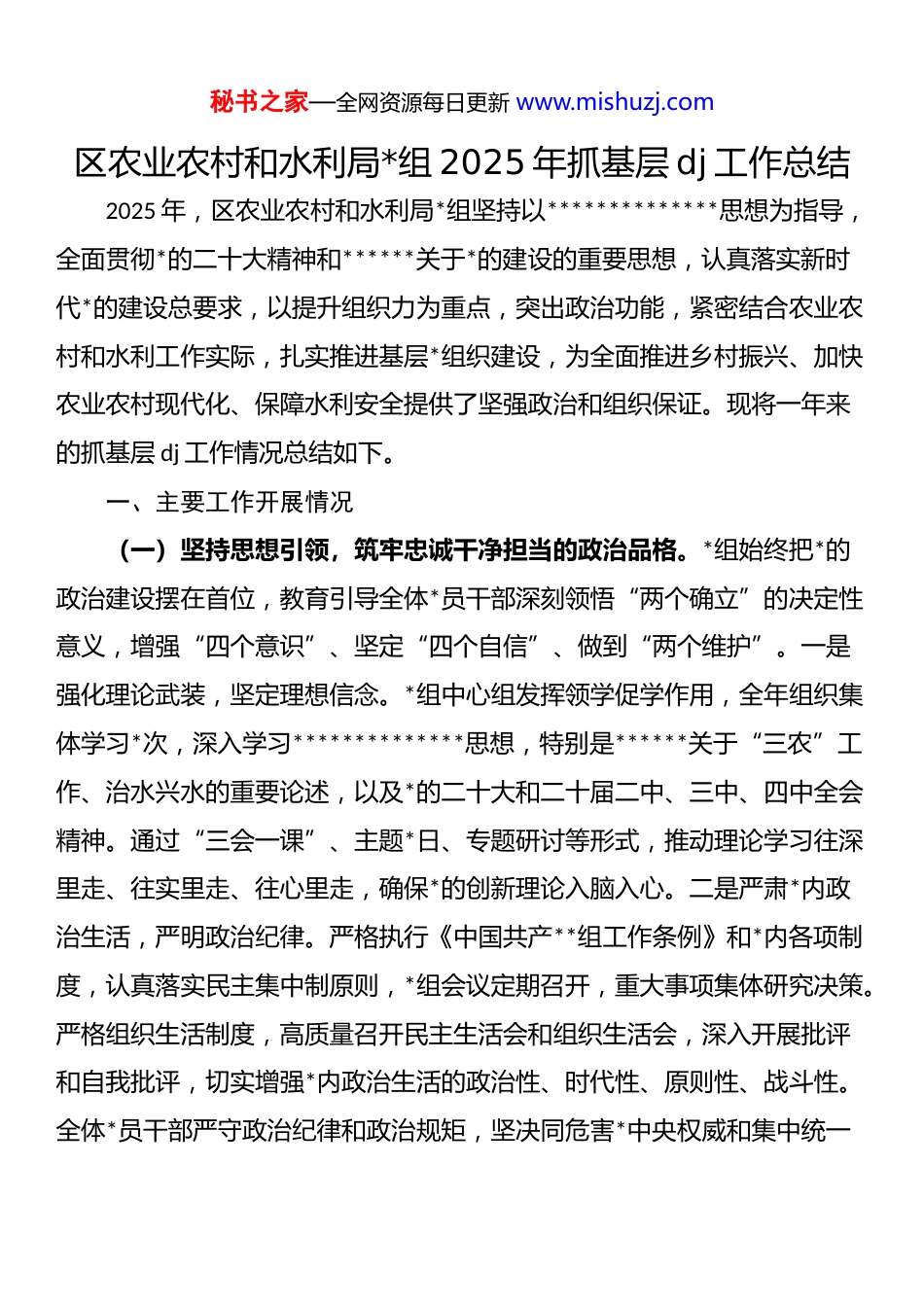 秘书之家—全网资源每日更新 www.mishuzj.com区农业农村和水利局*组 2025 年抓基层 dj 工作总结2025 年,区农业农村和水利局*组坚持以**************思想为指导,全面贯彻*的二十大精神和******关于*的建设的重要思想,认真落实新时代*的建设总要求,以提升组织力为重点,突出政治功能,紧密结合农业农村和水利工作实际,扎实推进基层*组织建设,为全面推进乡村振兴、加快农业农村现代化、保障水利安全提供了坚强政治和组织保证。现将一年来的抓基层 dj 工作情况总结如下。一、主要工作开展情况(一)坚持思想引领,筑牢忠诚干净担当的政治品格。*组始终把*的政治建设摆在首位,教育引导全体*员干部深刻领悟“两个确立”的决定性意义,增强“四个意识”、坚定“四个自信”、做到“两个维护”。一是强化理论武装,坚定理想信念。*组中心组发挥领学促学作用,全年组织集体学习*次,深入学习**************思想,特别是******关于“三农”工作、治水兴水的重要论述,以及*的二十大和二十届二中、三中、四中全会精神。通过“三会一课”、主题*日、专题研讨等形式,推动理论学习往深里走、往实里走、往心里走,确保*的创新理论入脑入心。二是严肃*内政治生活,严明政治纪律。严格执行《中国共产**组工作条例》和*内各项制度,认真落实民主集中制原则,*组会议定期召开,重大事项集体研究决策。严格组织生活制度,高质量召开民主生活会和组织生活会,深入开展批评和自我批评,切实增强*内政治生活的政治性、时代性、原则性、战斗性。全体*员干部严守政治纪律和政治规矩,坚决同危害*中央权威和集中统一秘书之家—全网资源每日更新 www.mishuzj.com领导的言行作斗争。三是加强意识形态工作,凝聚思想共识。*组定期分析研判意识形态领域情况,加强对*员干部的思想教育和引导,确保全局干部职工在思想上政治上行动上同*中央保持高度一致。积极传播正能量,讲好农业农村和水利改革发展故事,为各项工作营造良好的舆论氛围。(二)聚焦组织建设,锻造坚强有力的基层战斗堡垒。*组织牢固树立大抓基层的鲜明导向,全面提升基层*组织政治功能和组织功能,推动基层*组织全面进步、全面过硬。一是健全组织体系,夯实基层基础。根据机构改革和人员变动情况,及时调整完善基层*组织设置,配齐配强*务干部队伍。常态化开展*支部规范化建设,推行“dj 工作法”,指导各支部严格落实“三会一课”、主题*日、组织生活会等基本制度,提升*支部标准化规范化水平。二是加强队伍建设,提升*员素质。严格执行发展*员工作细则,确保发展*员质量。加强对入*积极分子和*员的教育培训,激发*员队伍活力。组织开展*员先锋岗、责任区创建活动,引导*员立足本职岗位,亮身份、作表率、当先锋。加强对青年干部、业务骨干的政治吸纳和培养,发挥其在农业农村和水利事业发展中的生力军作用。三是抓实 dj 融合,服务中心大局。坚持 dj 工作与业务工作同谋划、同部署、同落实、同考核,推行“dj+”模式,将 dj 工作融入农业生产、乡村建设、水利工程、防汛抗旱等各项业务工作中。例如,在[具体工作,如:春耕备耕、高标准农田建设、河湖长制落实、防汛应急值守]等重点任务中,成立*员突击队、设立*员先锋岗,充分发挥*组织和*员的战斗堡垒作用和先锋模范作用,确保各项任务高质量完成。秘书之家—全网资源每日更新 www.mishuzj.com(三)深化作风建设,营造风清气正的政治生态。*组始终把纪律和规矩挺在前面,驰而不息抓好作风建设和反腐倡廉工作,为事业发展提供坚实纪律保障。一是压实主体责任,强化监督执纪。*组书记认真履行第一责任人职责,班子成员严格落实“一岗双责”,层层传导压力,把全面从严治*各项要求落到实处。加强对重点领域和关键环节的监督检查,运用监督执纪“第一种形态”,抓早抓小、防微杜渐。二是持之以恒纠治“四风”。坚决反对形式主义、官僚主义,力戒空谈、注重实效。深入开展调查研究,了解基层实际困难,解决群众急难愁盼问题。严格执行中央八项规定及其实施细则精神,紧盯重要节点,常态化开展警示教育,坚决防止不正之风反弹回潮。三是加强廉政教育,筑牢思想防线。组织*...