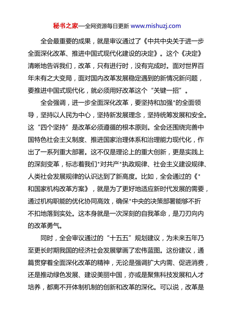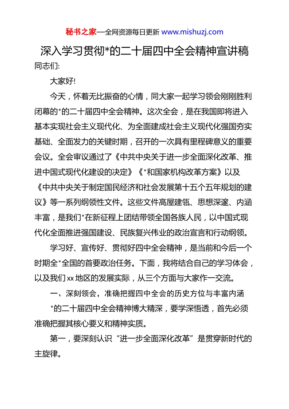 秘书之家—全网资源每日更新 www.mishuzj.com深入学习贯彻*的二十届四中全会精神宣讲稿同志们:大家好!今天,怀着无比振奋的心情,同大家一起学习领会刚刚胜利闭幕的*的二十届四中全会精神。这次全会,是在我国即将进入基本实现社会主义现代化、为全面建成社会主义现代化强国夯实基础、全面发力的关键时期,召开的一次具有里程碑意义的重要会议。全会审议通过了《中共中央关于进一步全面深化改革、推进中国式现代化建设的决定》《*和国家机构改革方案》以及《中共中央关于制定国民经济和社会发展第十五个五年规划的建议》等一系列纲领性文件。这些文件高屋建瓴、思想深邃、内涵丰富,是我们*在新征程上团结带领全国各族人民,以中国式现代化全面推进强国建设、民族复兴伟业的政治宣言和行动纲领。学习好、宣传好、贯彻好四中全会精神,是当前和今后一个时期全*全国的首要政治任务。下面,我将结合自己的学习体会,以及我们 xx 地区的发展实际,从三个方面与大家作一交流。一、深刻领会,准确把握四中全会的历史方位与丰富内涵*的二十届四中全会精神博大精深,要学深悟透,首先必须准确把握其核心要义和精神实质。第一,要深刻认识“进一步全面深化改革”是贯穿新时代的主旋律。秘书之家—全网资源每日更新 www.mishuzj.com全会最重要的成果,就是审议通过了《中共中央关于进一步全面深化改革、推进中国式现代化建设的决定》。这个《决定》清晰地告诉我们,改革,只有进行时,没有完成时。面对世界百年未有之大变局,面对国内改革发展稳定遇到的新情况新问题,要推进中国式现代化,就必须用好改革这个“关键一招”。全会强调,进一步全面深化改革,要坚持和加强*的全面领导,坚持以人民为中心,坚持新发展理念,坚持统筹发展和安全。这“四个坚持”是改革必须遵循的根本原则。全会还围绕完善中国特色社会主义制度、推进国家治理体系和治理能力现代化,作出了一系列重大部署。这不仅是理论上的重大创新,更是实践上的深刻变革,标志着我们*对共产*执政规律、社会主义建设规律、人类社会发展规律的认识达到了新高度。比如,全会通过的《*和国家机构改革方案》,就是为了更好地适应新时代发展的需要,通过机构职能的优化协同高效,确保*中央的决策部署能够不折不扣地落到实处。这本身就是一次深刻的自我革命,是刀刃向内的改革勇气。同时,全会审议通过的“十五五”规划建议,为未来五年乃至更长时期我国的经济社会发展擘画了宏伟蓝图。这份建议,通篇贯穿着全面深化改革的精神,无论是强调扩大内需、促进消费,还是推动绿色发展、建设美丽中国,亦或是聚焦科技发展和人才培养,都离不开体制机制的创新和改革的深化。可以说,改革是秘书之家—全网资源每日更新 www.mishuzj.com解锁“十五五”发展密码、激发中国式现代化澎湃动力的总钥匙。第二,要深刻认识“高质量发展”是推进中国式现代化的首要任务。发展是*执政兴国的第一要务。四中全会鲜明指出,高质量发展是全面建设社会主义现代化国家的首要任务。何为高质量发展?它不再是简单追求 gdp 的增长速度,而是更加注重发展的质量和效益,是体现新发展理念的发展。全会精神指引我们,推动高质量发展,必须完整、准确、全面贯彻新发展理念,加快构建新发展格局。这意味着要在科技自立自强上取得更大突破,要加快建设现代化产业体系,要全面推进乡村振兴,要促进区域协调发展,要推进高水平对外开放。这些都不是敲锣打鼓就能实现的,必须付出更为艰巨、更为艰苦的努力。特别值得关注的是,全会把“一体推进教育科技人才发展”摆在了突出位置。这深刻揭示了在当前国际科技竞争日趋激烈的背景下,创新在我国现代化建设全局中的核心地位。教育是基础,科技是关键,人才是根本。只有将三者紧密结合、一体推进,形成“科技自主创新和人才自主培养良性互动”的生动局面,才能为高质量发展注入源源不断的强大动力,有效应对人口老龄化、少子化等挑战,塑造发展新动能新优势。第三,要深刻认识“统筹发展和安全”是行稳致远的根本保秘书之家—全网资源每日更新 www.mishuzj.com障。安全是发展的前提,发展是安全的保障。四中全会强调,要...