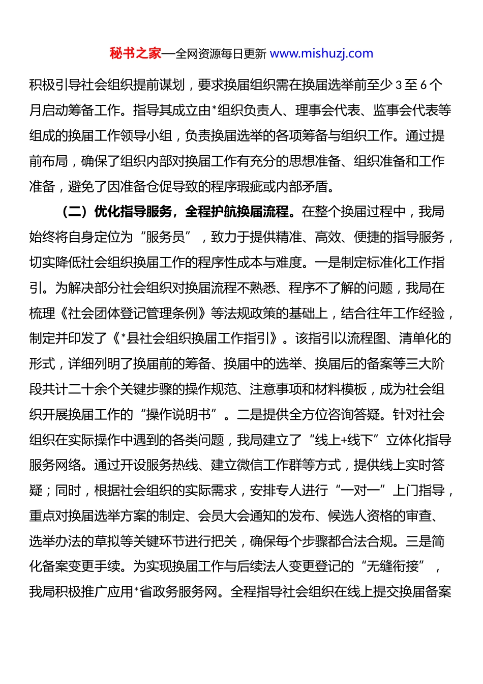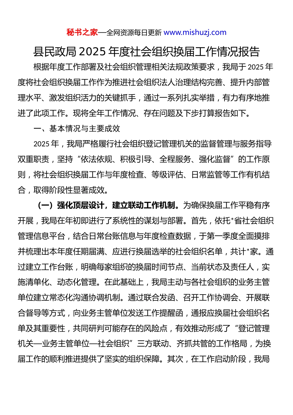 秘书之家—全网资源每日更新 www.mishuzj.com县民政局 2025 年度社会组织换届工作情况报告根据年度工作部署及社会组织管理相关法规政策要求,我局于 2025 年度将社会组织换届工作作为推进社会组织法人治理结构完善、提升内部管理水平、激发组织活力的关键抓手,通过一系列扎实举措,有力有序地推进了此项工作。现将全年工作情况、存在问题及下步打算报告如下。一、基本情况与主要成效2025 年,我局严格履行社会组织登记管理机关的监督管理与服务指导双重职责,坚持“依法依规、积极引导、全程服务、强化监督”的工作原则,将社会组织换届工作与年度检查、等级评估、日常监管等工作有机结合,取得阶段性显著成效。(一)强化顶层设计,建立联动工作机制。为确保换届工作平稳有序开展,我局在年初即进行了系统性的谋划与部署。首先,依托*省社会组织管理信息平台,结合日常台账信息与年度检查数据,于第一季度全面摸排并梳理出本年度任期届满、应进行换届选举的社会组织名单,共计*家。通过建立工作台账,明确每家组织的换届时间节点、当前状态及责任人,实施清单化、动态化管理。在此基础上,我局主动与各社会组织的业务主管单位建立常态化沟通协调机制。通过联合发函、召开工作协调会、开展联合督导等方式,向业务主管单位发送工作提醒函,通报应换届社会组织名单及其重要性,共同研判可能存在的风险点,有效推动形成了“登记管理机关—业务主管单位—社会组织”三方联动、齐抓共管的工作格局,为换届工作的顺利推进提供了坚实的组织保障。其次,在工作启动阶段,我局秘书之家—全网资源每日更新 www.mishuzj.com积极引导社会组织提前谋划,要求换届组织需在换届选举前至少 3 至 6 个月启动筹备工作。指导其成立由*组织负责人、理事会代表、监事会代表等组成的换届工作领导小组,负责换届选举的各项筹备与组织工作。通过提前布局,确保了组织内部对换届工作有充分的思想准备、组织准备和工作准备,避免了因准备仓促导致的程序瑕疵或内部矛盾。(二)优化指导服务,全程护航换届流程。在整个换届过程中,我局始终将自身定位为“服务员”,致力于提供精准、高效、便捷的指导服务,切实降低社会组织换届工作的程序性成本与难度。一是制定标准化工作指引。为解决部分社会组织对换届流程不熟悉、程序不了解的问题,我局在梳理《社会团体登记管理条例》等法规政策的基础上,结合往年工作经验,制定并印发了《*县社会组织换届工作指引》。该指引以流程图、清单化的形式,详细列明了换届前的筹备、换届中的选举、换届后的备案等三大阶段共计二十余个关键步骤的操作规范、注意事项和材料模板,成为社会组织开展换届工作的“操作说明书”。二是提供全方位咨询答疑。针对社会组织在实际操作中遇到的各类问题,我局建立了“线上+线下”立体化指导服务网络。通过开设服务热线、建立微信工作群等方式,提供线上实时答疑;同时,根据社会组织的实际需求,安排专人进行“一对一”上门指导,重点对换届选举方案的制定、会员大会通知的发布、候选人资格的审查、选举办法的草拟等关键环节进行把关,确保每个步骤都合法合规。三是简化备案变更手续。为实现换届工作与后续法人变更登记的“无缝衔接”,我局积极推广应用*省政务服务网。全程指导社会组织在线上提交换届备案秘书之家—全网资源每日更新 www.mishuzj.com及负责人、地址、章程等变更申请材料,实现“一网通办、一次办好”。此举不仅大幅提升了办事效率,也确保了换届结果能够及时、准确地反映在组织的法人登记信息中,维护了登记事项的严肃性与权威性。(三)严守程序规范,确保过程公平公正。在做好服务的同时,我局亦严格履行“监督员”职责,将过程监督贯穿于换届工作的始终,坚决维护换届选举的公开、公平、公正原则。一是严格审查换届方案。要求社会组织在召开换届选举大会前,必须将其换届选举方案、候选人产生办法及建议名单等核心材料报送我局及业务主管单位进行前置审查。我局重点审查会员(代表)大会的召集程序是否合法、候选人资格是否符合章程规定、选举办法是否体现民主原则等,对发现的问题及时提出书面修改意见...