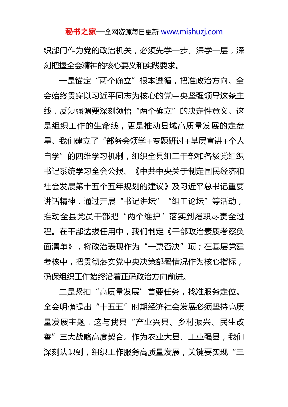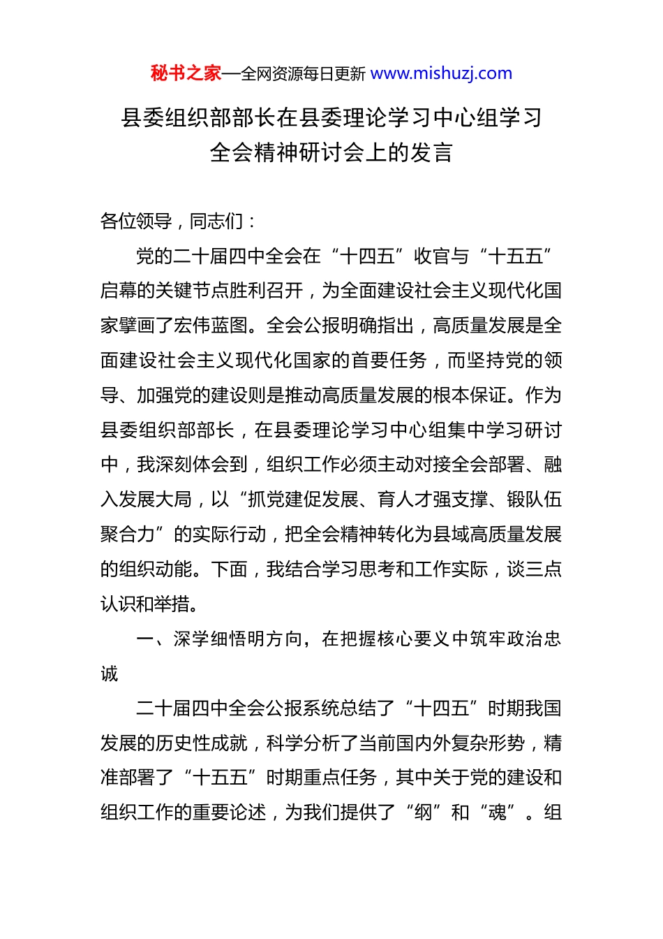 秘书之家—全网资源每日更新 www.mishuzj.com县委组织部部长在县委理论学习中心组学习全会精神研讨会上的发言 各位领导,同志们:党的二十届四中全会在“十四五”收官与“十五五”启幕的关键节点胜利召开,为全面建设社会主义现代化国家擘画了宏伟蓝图。全会公报明确指出,高质量发展是全面建设社会主义现代化国家的首要任务,而坚持党的领导、加强党的建设则是推动高质量发展的根本保证。作为县委组织部部长,在县委理论学习中心组集中学习研讨中,我深刻体会到,组织工作必须主动对接全会部署、融入发展大局,以“抓党建促发展、育人才强支撑、锻队伍聚合力”的实际行动,把全会精神转化为县域高质量发展的组织动能。下面,我结合学习思考和工作实际,谈三点认识和举措。一、深学细悟明方向,在把握核心要义中筑牢政治忠诚二十届四中全会公报系统总结了“十四五”时期我国发展的历史性成就,科学分析了当前国内外复杂形势,精准部署了“十五五”时期重点任务,其中关于党的建设和组织工作的重要论述,为我们提供了“纲”和“魂”。组秘书之家—全网资源每日更新 www.mishuzj.com织部门作为党的政治机关,必须先学一步、深学一层,深刻把握全会精神的核心要义和实践要求。一是锚定“两个确立”根本遵循,把准政治方向。全会始终贯穿以习近平同志为核心的党中央坚强领导这条主线,反复强调要深刻领悟“两个确立”的决定性意义。这是组织工作的生命线,更是推动县域高质量发展的定盘星。我们建立了“部务会领学+专题研讨+基层宣讲+个人自学”的四维学习机制,组织全县组工干部和各级党组织书记系统学习全会公报、《中共中央关于制定国民经济和社会发展第十五个五年规划的建议》及习近平总书记重要讲话精神,通过开展“书记讲坛”“组工论坛”等活动,推动全县党员干部把“两个维护”落实到履职尽责全过程。在干部选拔任用中,我们制定《干部政治素质考察负面清单》,将政治表现作为“一票否决”项;在基层党建考核中,把贯彻落实党中央决策部署情况作为核心指标,确保组织工作始终沿着正确政治方向前进。二是紧扣“高质量发展”首要任务,找准服务定位。全会明确提出“十五五”时期经济社会发展必须坚持高质量发展主题,这与我县“产业兴县、乡村振兴、民生改善”三大战略高度契合。作为农业大县、工业强县,我们深刻认识到,组织工作服务高质量发展,关键要实现“三秘书之家—全网资源每日更新 www.mishuzj.com个对接”:对接现代化产业体系建设,重点培育工业转型、农业升级领域的骨干干部和专业人才;对接农业农村现代化,建强乡村振兴一线党组织和带头人队伍;对接共同富裕目标,强化民生领域干部队伍的宗旨意识和服务能力。我们已牵头开展“组织工作服务高质量发展”专题调研,梳理出干部能力短板、党建薄弱环节、人才瓶颈制约等 6 类 18 项问题,形成问题清单和整改台账,为精准施策奠定基础。三是把握“自我革命”战略要求,夯实党建根基。全会鲜明提出“坚持以党的自我革命引领社会革命,持之以恒推进全面从严治党”。组织工作作为全面从严治党的重要载体,必须把抓基层打基础作为长远之计。我们深刻认识到,县域层面的自我革命,关键要解决基层党组织政治功能和组织功能不强、干部队伍精气神不足等问题。为此,我们将开展“基层党建提质增效年”活动,重点整治农村党组织“软弱涣散”、机关党建“两张皮”、新兴领域党建“覆盖不到位”等问题,以基层党组织的全面进步带动治理效能的全面提升,为高质量发展提供坚强组织保障。二、实干担当强作为,在服务大局中彰显组织价值全会强调,要“坚持和加强党中央集中统一领导,充秘书之家—全网资源每日更新 www.mishuzj.com分调动全社会投身中国式现代化建设的积极性主动性创造性”。组织部门将聚焦主责主业,把全会部署转化为干部队伍建设、基层党建、人才工作的具体举措,以高质量组织工作赋能县域高质量发展。一是锻造堪当重任的干部队伍,筑牢“骨干支撑”。全会提出要“建设堪当民族复兴重任的高素质干部队伍”,这是推动高质量发展的关键。我们将构建“选育管用”全链条机制,实现干部队伍与发展需求精准匹配。在...