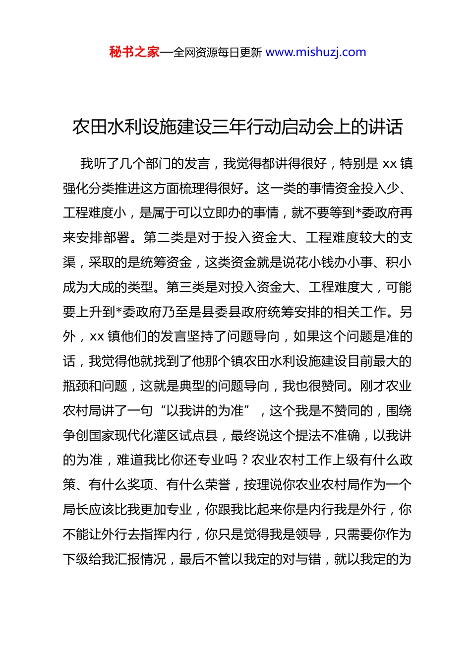 秘书之家—全网资源每日更新 www.mishuzj.com农田水利设施建设三年行动启动会上的讲话 我听了几个部门的发言,我觉得都讲得很好,特别是 xx 镇强化分类推进这方面梳理得很好。这一类的事情资金投入少、工程难度小,是属于可以立即办的事情,就不要等到*委政府再来安排部署。第二类是对于投入资金大、工程难度较大的支渠,采取的是统筹资金,这类资金就是说花小钱办小事、积小成为大成的类型。第三类是对投入资金大、工程难度大,可能要上升到*委政府乃至是县委县政府统筹安排的相关工作。另外,xx 镇他们的发言坚持了问题导向,如果这个问题是准的话,我觉得他就找到了他那个镇农田水利设施建设目前最大的瓶颈和问题,这就是典型的问题导向,我也很赞同。刚才农业农村局讲了一句“以我讲的为准”,这个我是不赞同的,围绕争创国家现代化灌区试点县,最终说这个提法不准确,以我讲的为准,难道我比你还专业吗?农业农村工作上级有什么政策、有什么奖项、有什么荣誉,按理说你农业农村局作为一个局长应该比我更加专业,你跟我比起来你是内行我是外行,你不能让外行去指挥内行,你只是觉得我是领导,只需要你作为下级给我汇报情况,最后不管以我定的对与错,就以我定的为秘书之家—全网资源每日更新 www.mishuzj.com准,万一我定错了怎么办呢?压根就没有这个说法。我也不是批评他,就是大家都要改进这种工作作风,事情要实事求是,这才是我们应该干的,首先你把问题搞清楚,也便于我询问的时候你给我回答清楚,便于 xx 干不干,便于我们大家在一起商量,最终我决策的时候我们定不定得清楚,这才是我们干工作应有的作风。针对今天我们开这个会,我再强调几句话。 第一句话,思想上我们高度重视。从重视层面上来讲,本来是从中央到地方各级的一个政治要求,不抓也得抓。从自己本身来讲,xx 是农业大县、农业强县,水利基础设施也是我们的短板,如果不顺势而为的话,我们就会错失这次 xx 农田水利设施建设的有利契机。有的工作是需要逆势而上,有的工作是需要顺势而为,对这项工作还不需要我们逆势而上,就是我们做顺势而为的工作,何乐而不为呢?上级有专项资金,可能银行贷款也会给我们很方便的通道,天时地利人和,我们就应该加快。思想重视就是需要从这两个方面来重视,在座的同志包括我在内一定要抓住这次机遇。 第二句话,一定要搞明白我们这次到底要建什么。第一,农田水利设施我们可能天天都在说,月月都在讲,对很多干部来讲都变成了口头禅,但是有没有下来冷静下来理性思考一下,农田水利设施到底包含什么?第二,我们是不是冷静下来思考秘书之家—全网资源每日更新 www.mishuzj.com过,在座的每个人对 xx 农田水利设施的现状是否都了解清楚了、知晓清楚了,对书记、镇长来讲,你对你那个镇的情况是否了解清楚了、梳理清楚了,对很多业务部门来讲,那条业务线你是否了解清楚了、梳理清楚了。同时,按照问题导向,xx目前农田水利设施的问题在哪里、短板在哪里?我们搞农田水利设施建设三年行动不是搞大糊弄,不是把过去已建的全部重新再建一次,必须坚持问题导向,把我们 xx 真正的短板和弱项补上去。这就需要我们客观、冷静、仔细做一些艰苦卓绝的、孤独的、寂寞的梳理工作、思考工作,否则大家提出来要建的这些很有可能都是人云亦云,都是一些道听途说,建完也不一定能解决和弥补 xx 真正农田水利设施的问题和短板。我认为我们在思考的过程中要坚持两条线:第一条线就是水利这条流动线,农田水利设施更多是解决水的问题,从水源、疏水渠道到田,水源的问题、抽水站的问题、提灌站的问题,围绕干渠、支渠、毛渠这条线我们到底还有哪些问题和短板。第二条线就是考虑蓄水这条线,这里面就包括我们的水库、塘堰、山坪塘、田间地头的蓄水池。我认为水利设施围绕这两条线就抓住了主线,围绕这两条线业务部门从部门的层面、乡镇从乡镇的层面去思考我们到底哪一块有短板,其中不畅的地方就是我们要干的事情,蓄不住的地方就是我们要干的事情,把要干的事秘书之家—全网资源每日更新 www.mishuzj.com情叠加在一起是不是就解决了到底抓什么、做什么的问题。我们下...