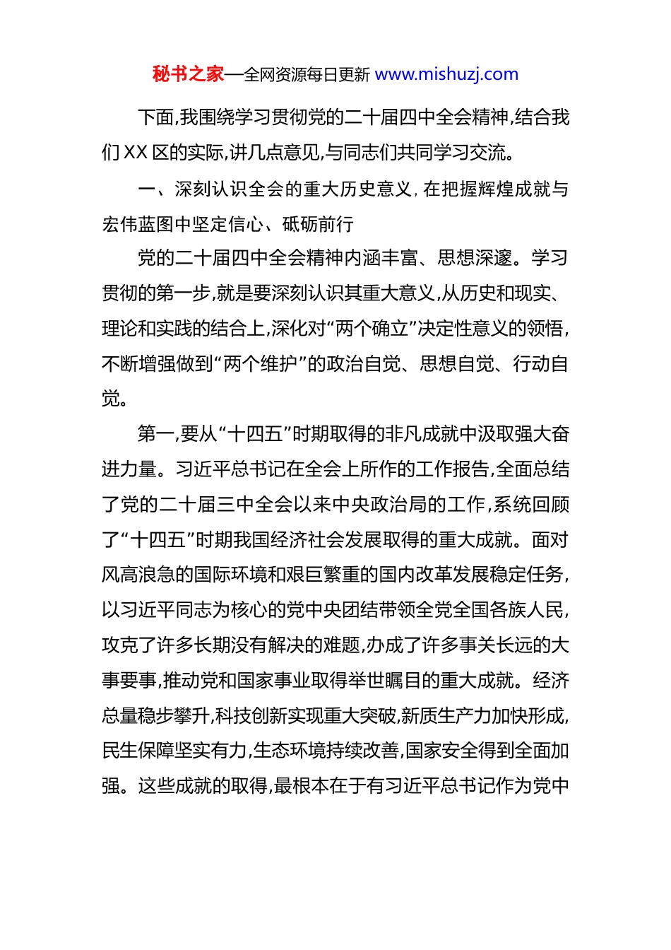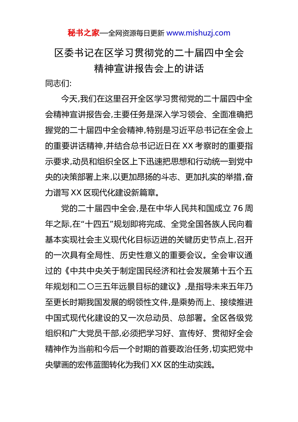 秘书之家—全网资源每日更新 www.mishuzj.com区委书记在区学习贯彻党的二十届四中全会精神宣讲报告会上的讲话 同志们:今天,我们在这里召开全区学习贯彻党的二十届四中全会精神宣讲报告会,主要任务是深入学习领会、全面准确把握党的二十届四中全会精神,特别是习近平总书记在全会上的重要讲话精神,并结合总书记近日在 XX 考察时的重要指示要求,动员和组织全区上下迅速把思想和行动统一到党中央的决策部署上来,以更加昂扬的斗志、更加扎实的举措,奋力谱写 XX 区现代化建设新篇章。党的二十届四中全会,是在中华人民共和国成立 76 周年之际,“”在 十四五 规划即将完成、全党全国各族人民向着基本实现社会主义现代化目标迈进的关键历史节点上,召开的一次具有全局性、历史性意义的重要会议。全会审议通过的《中共中央关于制定国民经济和社会发展第十五个五年规划和二〇三五年远景目标的建议》,是指导未来五年乃至更长时期我国发展的纲领性文件,是乘势而上、接续推进中国式现代化建设的又一次总动员、总部署。全区各级党组织和广大党员干部,必须把学习好、宣传好、贯彻好全会精神作为当前和今后一个时期的首要政治任务,切实把党中央擘画的宏伟蓝图转化为我们 XX 区的生动实践。秘书之家—全网资源每日更新 www.mishuzj.com下面,我围绕学习贯彻党的二十届四中全会精神,结合我们 XX 区的实际,讲几点意见,与同志们共同学习交流。一、深刻认识全会的重大历史意义,在把握辉煌成就与宏伟蓝图中坚定信心、砥砺前行党的二十届四中全会精神内涵丰富、思想深邃。学习贯彻的第一步,就是要深刻认识其重大意义,从历史和现实、理论和实践的结合上,“”深化对 两个确立 决定性意义的领悟,“”不断增强做到 两个维护 的政治自觉、思想自觉、行动自觉。第一,“”要从 十四五 时期取得的非凡成就中汲取强大奋进力量。习近平总书记在全会上所作的工作报告,全面总结了党的二十届三中全会以来中央政治局的工作,系统回顾“”了 十四五 时期我国经济社会发展取得的重大成就。面对风高浪急的国际环境和艰巨繁重的国内改革发展稳定任务,以习近平同志为核心的党中央团结带领全党全国各族人民,攻克了许多长期没有解决的难题,办成了许多事关长远的大事要事,推动党和国家事业取得举世瞩目的重大成就。经济总量稳步攀升,科技创新实现重大突破,新质生产力加快形成,民生保障坚实有力,生态环境持续改善,国家安全得到全面加强。这些成就的取得,最根本在于有习近平总书记作为党中秘书之家—全网资源每日更新 www.mishuzj.com央的核心、全党的核心领航掌舵,在于有习近平新时代中国特色社会主义思想科学指引。对我们 XX 区而言,过去的五年同样是极不平凡、极为不易的五年。我们紧跟总书记、党中央步伐,在省委、市委的坚强领导下,坚持制造业当家,顶住了经济下行的巨大压力,区域生产总值年均增长达到 4.8%,规上工业增加值持续领跑全市;我们坚持创新驱动,全社会研发投入强度提升至3.6%,高新技术企业数量实现翻番;我们坚持城乡融合,“百”千万工程 开局良好,一批典型村(社区)建设成果斐然,人居环境显著改善;我们坚持民生为本,累计投入超过 600 亿元用于民生事业,教育、医疗、养老等公共服务体系更加完善。回顾这段历程,我们更加深切地体会到,只有紧紧依靠党的领导,坚定不移地沿着总书记指引的方向前进,才能战胜一切艰难险阻,不断从胜利走向新的胜利。第二,“”要从 十五五 时期的重要定位中把握关键历史机遇。全会指出,“”十五五 时期是基本实现社会主义现代化的关键五年,“”是承上启下、继往开来的关键五年。这个 关键 ,体现在它是实现 2035 年远景目标的决定性阶段,关系到中国式现代化建设的全局。这五年发展得好不好,直接决定了我们能否在 2035 年如期基本实现社会主义现代化。同时,当今世界百年未有之大变局加速演进,新一轮科技革命和产秘书之家—全网资源每日更新 www.mishuzj.com业变革深入发展,我国发展的外部环境更趋复杂严峻。这就要求我们必须保持战略定力,增强忧患意识,发扬斗争精神,牢牢把握发展主动权。对 XX 区而言,“”这个 关键五年 同样是我们实现能级跃升、格局重...