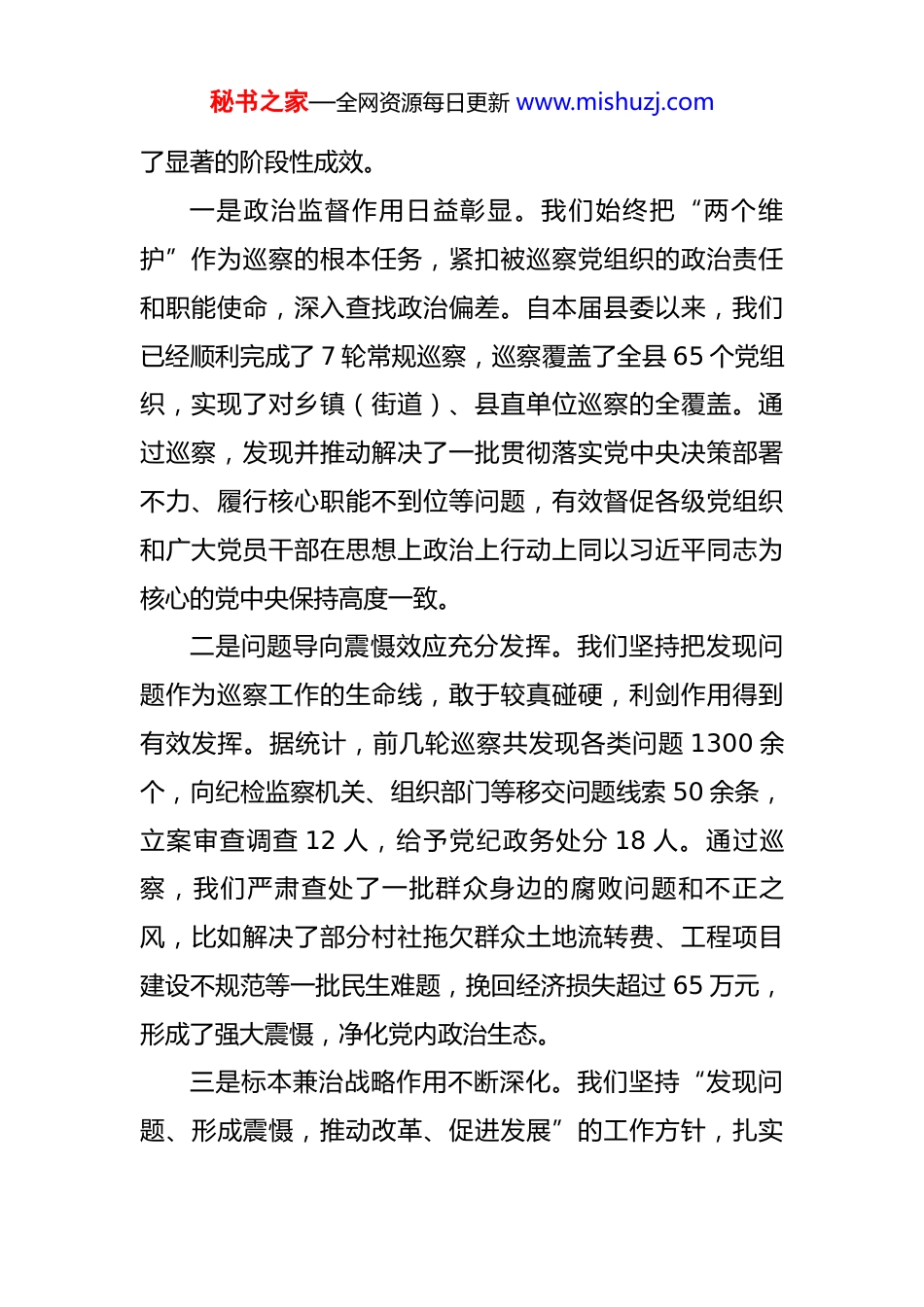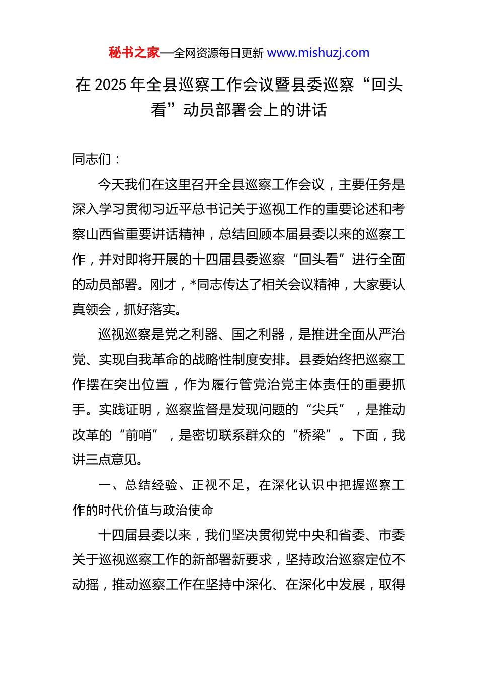 秘书之家—全网资源每日更新 www.mishuzj.com在 2025 年全县巡察工作会议暨县委巡察“回头看”动员部署会上的讲话 同志们:今天我们在这里召开全县巡察工作会议,主要任务是深入学习贯彻习近平总书记关于巡视工作的重要论述和考察山西省重要讲话精神,总结回顾本届县委以来的巡察工作,并对即将开展的十四届县委巡察“回头看”进行全面的动员部署。刚才,*同志传达了相关会议精神,大家要认真领会,抓好落实。巡视巡察是党之利器、国之利器,是推进全面从严治党、实现自我革命的战略性制度安排。县委始终把巡察工作摆在突出位置,作为履行管党治党主体责任的重要抓手。实践证明,巡察监督是发现问题的“尖兵”,是推动改革的“前哨”,是密切联系群众的“桥梁”。下面,我讲三点意见。一、总结经验、正视不足,在深化认识中把握巡察工作的时代价值与政治使命十四届县委以来,我们坚决贯彻党中央和省委、市委关于巡视巡察工作的新部署新要求,坚持政治巡察定位不动摇,推动巡察工作在坚持中深化、在深化中发展,取得秘书之家—全网资源每日更新 www.mishuzj.com了显著的阶段性成效。一是政治监督作用日益彰显。我们始终把“两个维护”作为巡察的根本任务,紧扣被巡察党组织的政治责任和职能使命,深入查找政治偏差。自本届县委以来,我们已经顺利完成了 7 轮常规巡察,巡察覆盖了全县 65 个党组织,实现了对乡镇(街道)、县直单位巡察的全覆盖。通过巡察,发现并推动解决了一批贯彻落实党中央决策部署不力、履行核心职能不到位等问题,有效督促各级党组织和广大党员干部在思想上政治上行动上同以习近平同志为核心的党中央保持高度一致。二是问题导向震慑效应充分发挥。我们坚持把发现问题作为巡察工作的生命线,敢于较真碰硬,利剑作用得到有效发挥。据统计,前几轮巡察共发现各类问题 1300 余个,向纪检监察机关、组织部门等移交问题线索 50 余条,立案审查调查 12 人,给予党纪政务处分 18 人。通过巡察,我们严肃查处了一批群众身边的腐败问题和不正之风,比如解决了部分村社拖欠群众土地流转费、工程项目建设不规范等一批民生难题,挽回经济损失超过 65 万元,形成了强大震慑,净化党内政治生态。三是标本兼治战略作用不断深化。我们坚持“发现问题、形成震慑,推动改革、促进发展”的工作方针,扎实秘书之家—全网资源每日更新 www.mishuzj.com做好巡察“后半篇文章”。巡察整改的完成率稳步提升,前三轮巡察指出的问题整改完成率达到 97.3%,推动被巡察单位修订完善各类制度机制 300 余项,有效堵塞了制度漏洞,提升了治理效能。例如,针对部分单位在项目管理、资金使用方面存在的共性问题,我们推动开展了系统性治理,完善了招投标和财务审批流程,从源头上防范了廉政风险。在肯定成绩的同时,我们也要清醒地看到工作中存在的短板和不足。有的单位党组织对巡察整改的政治意义认识不足,存在“过关”心态,整改责任压得不实;有的问题整改满足于表面化、形式化,举一反三、建立长效机制不够;个别巡察干部在精准发现深层次问题、特别是体制机制性问题的能力上还有待提高。这些问题,我们必须高度重视,在今后的工作中切实加以解决。二、突出重点、精准发力,以高度的政治自觉高质量完成本轮巡察“回头看”任务开展巡察“回头看”,是巡察制度的重要创新,是巡察工作的深化和延伸,彰显的是党内监督的韧劲和严肃性。“回头看”不是简单地重复,而是要带着政治的“放大镜”和“显微镜”,进行一次深度的“政治复检”,重点看整改、看深化、看长效。根据县委统一安排,本轮巡秘书之家—全网资源每日更新 www.mishuzj.com察将对县住房建设和城市管理局、县应急管理局、县卫生健康委员会、县人民医院等 8 家单位党组织开展“回头看”。各巡察组要准确把握“回头看”的监督重点,确保看深、看透、看准。第一,要“回头看”政治忠诚和政治担当,检查“两个维护”的落实情况。巡察首先是政治巡察,“回头看”首先要看政治。要重点检查被巡察党组织,特别是“一把手”和领导班子,在巡察整改过程中,是否真正提高了政治站位,是否将整改工作作为一项严肃的...