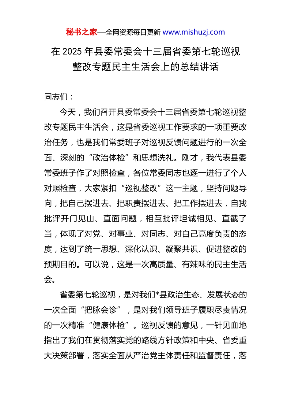 秘书之家—全网资源每日更新 www.mishuzj.com在 2025 年县委常委会十三届省委第七轮巡视整改专题民主生活会上的总结讲话 同志们:今天,我们召开县委常委会十三届省委第七轮巡视整改专题民主生活会,这是省委巡视工作要求的一项重要政治任务,也是我们常委班子对巡视反馈问题进行的一次全面、深刻的“政治体检”和思想洗礼。刚才,我代表县委常委班子作了对照检查,各位常委同志也逐一进行了个人对照检查,大家紧扣“巡视整改”这一主题,坚持问题导向,把自己摆进去、把职责摆进去、把工作摆进去,自我批评开门见山、直面问题,相互批评坦诚相见、直截了当,体现了对党、对事业、对同志、对自己高度负责的态度,达到了统一思想、深化认识、凝聚共识、促进整改的预期目的。可以说,这是一次高质量、有辣味的民主生活会。省委第七轮巡视,是对我们*县政治生态、发展状态的一次全面“把脉会诊”,是对我们领导班子履职尽责情况的一次精准“健康体检”。巡视反馈的意见,一针见血地指出了我们在贯彻落实党的路线方针政策和中央、省委重大决策部署,落实全面从严治党主体责任和监督责任,落秘书之家—全网资源每日更新 www.mishuzj.com实新时代党的组织路线,以及落实巡视、审计等监督发现问题整改等方面存在的差距和不足。比如,在推动高质量发展方面,我们对新发展理念的理解和运用还不够深入,传统路径依赖依然存在,产业转型升级的步伐还不够快,在一些重大项目推进中还存在堵点难点;在践行以人民为中心的发展思想方面,我们在解决群众急难愁盼问题上还存在短板,个别民生工程的实施效果与群众期盼还有差距,城乡基本公共服务均等化水平有待进一步提高;在防范化解重大风险方面,我们的忧患意识和底线思维树得还不够牢,对一些重点领域的风险隐患排查整治还不够彻底;在全面从严治党方面,“两个责任”压力传导还存在层层递减现象,形式主义、官僚主义问题在一些领域和部门仍未根除,少数党员干部的担当精神和斗争本领有待加强。面对这些问题,我们不能有任何回避和遮掩。在会前,常委会作了充分准备,通过深入学习研讨、广泛征求意见、开展谈心谈话,为开好这次民主生活会打下了坚实基础。会上,大家本着对事业负责、对同志负责的精神,深入查摆问题,深刻剖析根源,明确了整改方向。自我批评勇于揭短亮丑,相互批评敢于动真碰硬,体现了刀刃向内的勇气和自我革命的精神。总的来看,这次会议开得很成功,大家经受了一次严格的党内政治生活锻炼,在思想上受到了深秘书之家—全网资源每日更新 www.mishuzj.com刻的警醒和教育,达到了“红脸出汗、排毒治病”的效果。但是,我们必须清醒地认识到,民主生活会的成功召开,只是整改工作的一个新起点,绝不是终点。查摆问题只是第一步,解决问题才是关键。如果查摆问题轰轰烈烈,整改落实却悄无声息,那这次民主生活会就失去了意义,巡视整改的“后半篇文章”也就无从谈起。我们必须以此次专题民主生活会为契机,以高度的政治责任感和钉钉子精神,坚决扛起整改主体责任,把问题整改贯穿于各项工作始终,确保省委巡视反馈问题一个不落、见底清零。下面,我代表县委常委会,就如何抓好下一步的整改落实工作,讲几点意见。一、必须旗帜鲜明讲政治,以高质量整改成果诠释对党绝对忠诚巡视整改,首先是一项严肃的政治任务,是对我们政治判断力、政治领悟力、政治执行力的重大考验。抓好巡视整改,最根本的是要从政治上看、从政治上抓。县委常委班子作为全县的“领头雁”,必须带头提高政治站位,深刻认识到巡视整改的政治属性和政治要求,把抓好整改作为衷心拥护“两个确立”、忠诚践行“两个维护”最直接、最现实的检验。我们要把巡视反馈的问题,当作是上级党组织对我们的政治提醒和爱护。每一个问题,都关乎秘书之家—全网资源每日更新 www.mishuzj.com党的形象、关乎发展大局、关乎民心向背。我们必须以最坚决的态度、最果断的行动,不折不扣地抓好整改。常委会的同志们要带头深化理论学习,持续深入学习贯彻习近平新时代中国特色社会主义思想和党的二十大精神,自觉用党的创新理论武装头脑、指导实践、推动工作,确保中央和省委、*...