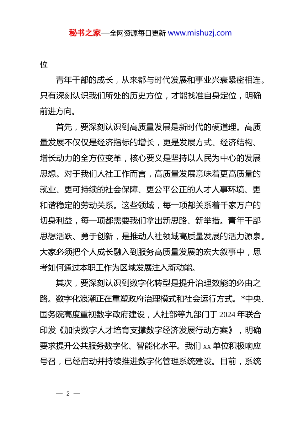 秘书之家—全网资源每日更新 www.mishuzj.com在 xx 单位“90 后”青年干部座谈会上的讲话同志们:今天,我们齐聚一堂,召开这次青年干部座谈会,主要目的是深入贯彻落实*中央、国务院及上级*委、政府关于加强青年干部队伍建设的系列重要部署,倾听青年心声,共话成长未来,凝聚奋进力量。在座的各位都是 90 后青年干部,是 xx 单位事业的生力军和突击队,也是推动 xx 区高质量发展的宝贵财富。看到大家朝气蓬勃、精神焕发的样子,由衷地感到欣慰,也对 xx 单位的未来充满信心。当前,我们正处在一个波澜壮阔的伟大时代。世界百年未有之大变局加速演进,新一轮科技革命和产业变革深入发展,我国正迈向全面建设社会主义现代化国家的新征程。在这个历史交汇点上,xx 单位作为保障和改善民生的重要职能部门,肩负着的时代使命无比光荣,承担的发展任务也异常艰巨。要将宏伟蓝图变为美好现实,关键在人,根本在干,尤其需要一支政治坚定、能力过硬、作风优良、奋发有为的青年干部队伍。今天召开这次座谈会,既是组织对大家成长的深切关怀,也是推动事业发展的必然要求。一、深刻认识时代方位,在把握大势中坚定信念、找准定— 1 —秘书之家—全网资源每日更新 www.mishuzj.com位青年干部的成长,从来都与时代发展和事业兴衰紧密相连。只有深刻认识我们所处的历史方位,才能找准自身定位,明确前进方向。首先,要深刻认识到高质量发展是新时代的硬道理。高质量发展不仅仅是经济指标的增长,更是发展方式、经济结构、增长动力的全方位变革,核心要义是坚持以人民为中心的发展思想。对于我们人社工作而言,高质量发展意味着更高质量的就业、更可持续的社会保障、更公平公正的人才人事环境、更和谐稳定的劳动关系。这些领域,每一项都关系着千家万户的切身利益,每一项都需要我们拿出新思路、新举措。青年干部思想活跃、勇于创新,是推动人社领域高质量发展的活力源泉。大家必须把个人成长融入到服务高质量发展的宏大叙事中,思考如何通过本职工作为区域发展注入新动能。其次,要深刻认识到数字化转型是提升治理效能的必由之路。数字化浪潮正在重塑政府治理模式和社会运行方式。*中央、国务院高度重视数字政府建设,人社部等九部门于 2024 年联合印发《加快数字人才培育支撑数字经济发展行动方案》,明确要求提升公共服务数字化、智能化水平。我们 xx 单位积极响应号召,已经启动并持续推进数字化管理系统建设。目前,系统— 2 —秘书之家—全网资源每日更新 www.mishuzj.com已初步覆盖就业创业、社会保险、劳动关系等核心业务板块,实现了部分业务的线上办理和数据归集。比如,通过就业服务模块,岗位匹配的精准度和效率得到初步提升;通过社保业务线上办理,群众跑动次数显著减少。但我们必须清醒地看到,我们的数字化转型还处于深化阶段,数据壁垒尚未完全打破,业务协同的潜能远未充分释放。青年干部是数字时代的“原住民”,理应成为数字化转型的先行者和主力军。大家要主动学习数字技术,熟悉数字工具,不仅要会用,更要思考如何优化、如何创新,推动人社服务从“能办”向“好办、智办”跨越。再者,要深刻认识到建设高素质专业化干部队伍是事业成功的根本保证。*的二十大报告强调,要“建设堪当民族复兴重任的高素质干部队伍”。我们 xx 单位干部队伍总体是好的,但也面临一些结构性挑战。参照一些地区的数据分析,干部队伍年龄老化、年轻干部储备不足的问题客观存在。据不完全统计,在一些兄弟单位中,35 周岁以下青年干部占比仅在 25%至 30%之间。我们 xx 单位的青年干部虽然逐年增多,但在全局干部总数中的比例仍有提升空间,高层次、复合型的专业人才依然紧缺。这既是挑战,更是机遇。它意味着在座的每一位青年干部都有更广阔的舞台和更多的成长机会。大家要增强使命感和紧迫感,珍惜韶华,苦练内功,努力成为可堪大用、能担重任的— 3 —秘书之家—全网资源每日更新 www.mishuzj.com栋梁之才。二、聚焦主责主业,在砥砺实干中锤炼本领、担当作为理想信念的坚定,最终要体现到具体行动上。结合大家的交流发言和我局的实际情况,我向青年干部们...