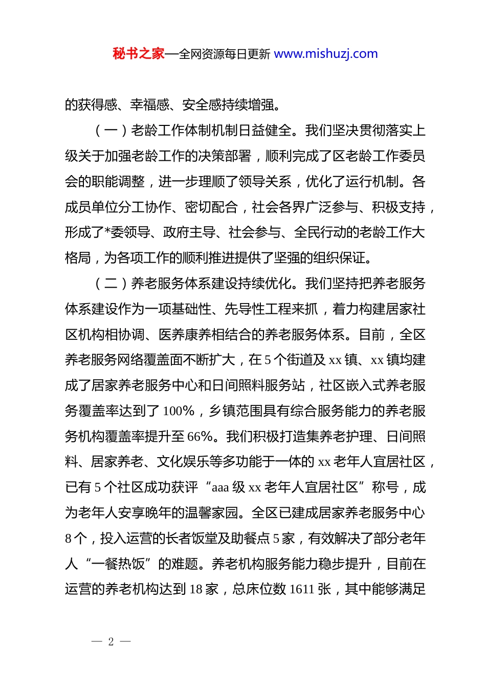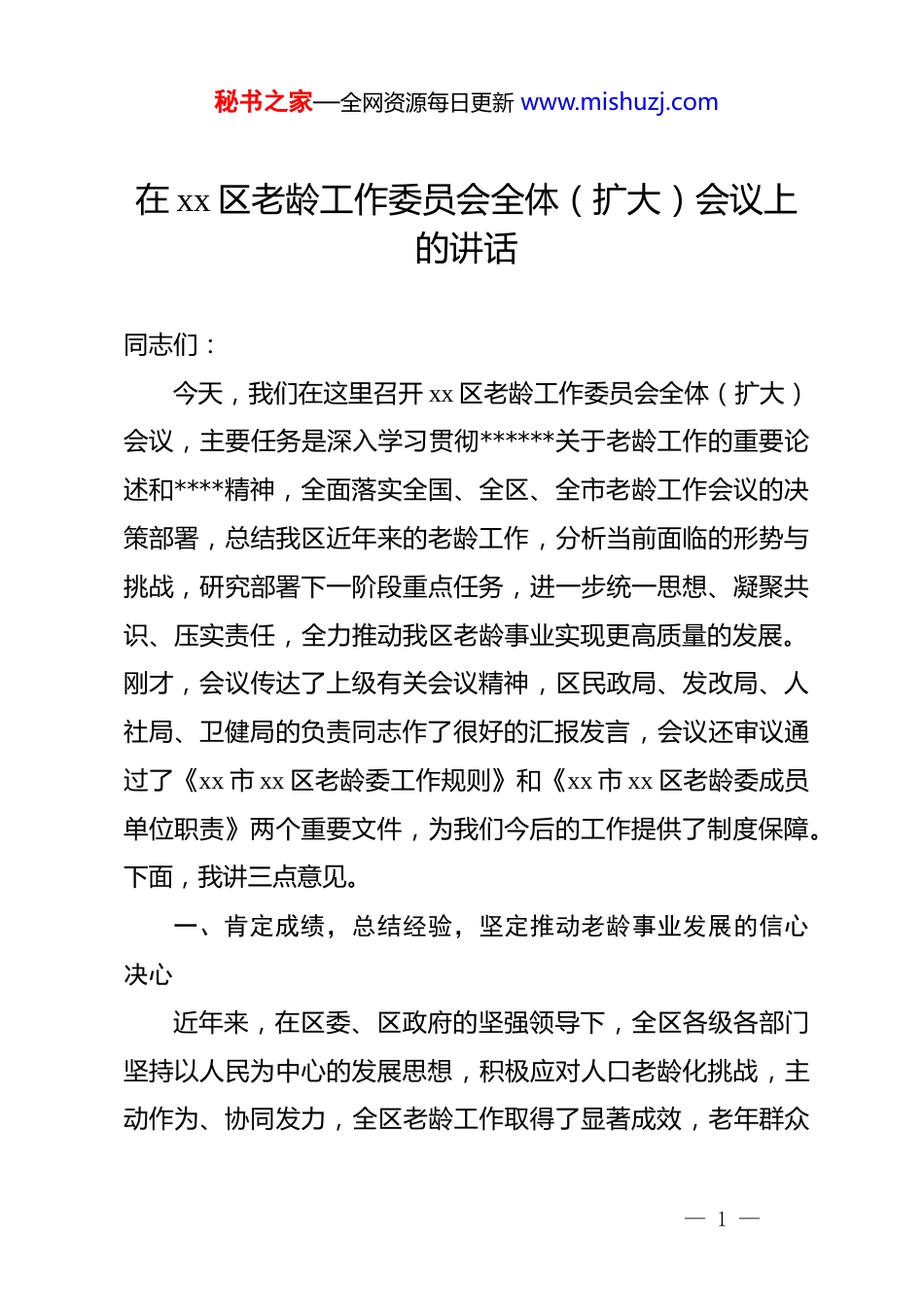 秘书之家—全网资源每日更新 www.mishuzj.com在 xx 区老龄工作委员会全体(扩大)会议上的讲话同志们:今天,我们在这里召开 xx 区老龄工作委员会全体(扩大)会议,主要任务是深入学习贯彻******关于老龄工作的重要论述和****精神,全面落实全国、全区、全市老龄工作会议的决策部署,总结我区近年来的老龄工作,分析当前面临的形势与挑战,研究部署下一阶段重点任务,进一步统一思想、凝聚共识、压实责任,全力推动我区老龄事业实现更高质量的发展。刚才,会议传达了上级有关会议精神,区民政局、发改局、人社局、卫健局的负责同志作了很好的汇报发言,会议还审议通过了《xx 市 xx 区老龄委工作规则》和《xx 市 xx 区老龄委成员单位职责》两个重要文件,为我们今后的工作提供了制度保障。下面,我讲三点意见。一、肯定成绩,总结经验,坚定推动老龄事业发展的信心决心近年来,在区委、区政府的坚强领导下,全区各级各部门坚持以人民为中心的发展思想,积极应对人口老龄化挑战,主动作为、协同发力,全区老龄工作取得了显著成效,老年群众— 1 —秘书之家—全网资源每日更新 www.mishuzj.com的获得感、幸福感、安全感持续增强。(一)老龄工作体制机制日益健全。我们坚决贯彻落实上级关于加强老龄工作的决策部署,顺利完成了区老龄工作委员会的职能调整,进一步理顺了领导关系,优化了运行机制。各成员单位分工协作、密切配合,社会各界广泛参与、积极支持,形成了*委领导、政府主导、社会参与、全民行动的老龄工作大格局,为各项工作的顺利推进提供了坚强的组织保证。(二)养老服务体系建设持续优化。我们坚持把养老服务体系建设作为一项基础性、先导性工程来抓,着力构建居家社区机构相协调、医养康养相结合的养老服务体系。目前,全区养老服务网络覆盖面不断扩大,在 5 个街道及 xx 镇、xx 镇均建成了居家养老服务中心和日间照料服务站,社区嵌入式养老服务覆盖率达到了 100%,乡镇范围具有综合服务能力的养老服务机构覆盖率提升至 66%。我们积极打造集养老护理、日间照料、居家养老、文化娱乐等多功能于一体的 xx 老年人宜居社区,已有 5 个社区成功获评“aaa 级 xx 老年人宜居社区”称号,成为老年人安享晚年的温馨家园。全区已建成居家养老服务中心8 个,投入运营的长者饭堂及助餐点 5 家,有效解决了部分老年人“一餐热饭”的难题。养老机构服务能力稳步提升,目前在运营的养老机构达到 18 家,总床位数 1611 张,其中能够满足— 2 —秘书之家—全网资源每日更新 www.mishuzj.com失能、半失能老人需求的护理型床位达到 1321 张,占比超过80%。特别是作为我区重点民生工程的 xx 区养护院项目建设正在加快推进,力争在 2025 年内完成 500 张养老床位的建设任务,届时将极大缓解我区机构养老的压力。(三)老年社会保障水平稳步提高。我们始终将保障老年人基本生活放在突出位置,不断织密织牢社会保障安全网。全面落实城乡居民基本养老保险待遇政策,积极配合做好基础养老金政策的动态调整,持续推进基本养老保险参保扩面工作,确保应保尽保。同时,我们高度关注孤寡、残障、失能等特殊困难老年群体的生活状况,建立健全关爱服务体系,通过定期探访、结对帮扶等方式,切实把*和政府的温暖送到了他们心坎上。(四)老年人生活品质得到有效提升。我们不仅关注老年人的物质生活,更关心他们的精神文化需求和居住环境。近年来,我们累计为约 700 户城乡特殊困难老年人家庭实施了居家适老化改造,通过安装扶手、改造无障碍通道、配备紧急呼叫设备等措施,显著提升了老年人在家生活的安全性与便利性。此外,我们还积极组织开展各类老年文体活动,支持老年大学、老年协会发展,丰富了老年人的精神文化生活,营造了尊老、敬老、爱老、助老的浓厚社会氛围。— 3 —秘书之家—全网资源每日更新 www.mishuzj.com这些成绩的取得,是区委、区政府正确领导的结果,是区老龄委各成员单位履职尽责、通力协作的结果,更是全区广大老龄工作者辛勤付出的结果。在此,我代表区委、区老龄委,向大家表示衷心的感谢和崇高的敬意!在肯定成绩的同...