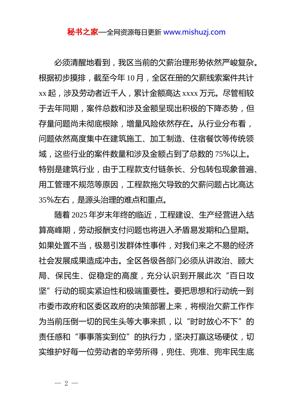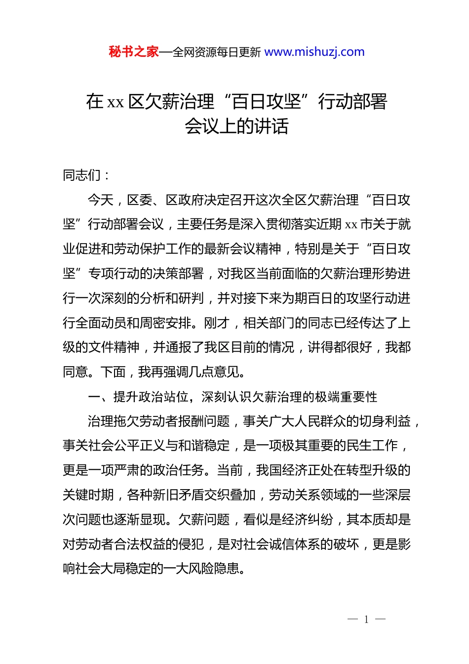 秘书之家—全网资源每日更新 www.mishuzj.com在 xx 区欠薪治理“百日攻坚”行动部署会议上的讲话同志们:今天,区委、区政府决定召开这次全区欠薪治理“百日攻坚”行动部署会议,主要任务是深入贯彻落实近期 xx 市关于就业促进和劳动保护工作的最新会议精神,特别是关于“百日攻坚”专项行动的决策部署,对我区当前面临的欠薪治理形势进行一次深刻的分析和研判,并对接下来为期百日的攻坚行动进行全面动员和周密安排。刚才,相关部门的同志已经传达了上级的文件精神,并通报了我区目前的情况,讲得都很好,我都同意。下面,我再强调几点意见。一、提升政治站位,深刻认识欠薪治理的极端重要性治理拖欠劳动者报酬问题,事关广大人民群众的切身利益,事关社会公平正义与和谐稳定,是一项极其重要的民生工作,更是一项严肃的政治任务。当前,我国经济正处在转型升级的关键时期,各种新旧矛盾交织叠加,劳动关系领域的一些深层次问题也逐渐显现。欠薪问题,看似是经济纠纷,其本质却是对劳动者合法权益的侵犯,是对社会诚信体系的破坏,更是影响社会大局稳定的一大风险隐患。— 1 —秘书之家—全网资源每日更新 www.mishuzj.com必须清醒地看到,我区当前的欠薪治理形势依然严峻复杂。根据初步摸排,截至今年 10 月,全区在册的欠薪线索案件共计xx 起,涉及劳动者近千人,累计金额高达 xxxx 万元。尽管相较于去年同期,案件总数和涉及金额呈现出积极的下降态势,但存量问题尚未彻底根除,增量风险依然存在。从行业分布看,问题依然高度集中在建筑施工、加工制造、住宿餐饮等传统领域,这些行业的案件数量和涉及金额占到了总数的 75%以上。特别是建筑行业,由于工程款支付链条长、分包转包现象普遍、用工管理不规范等原因,工程款拖欠导致的欠薪问题占比高达35%左右,是源头治理的难点和重点。随着 2025 年岁末年终的临近,工程建设、生产经营进入结算高峰期,劳动报酬支付问题也将进入矛盾易发期和凸显期。如果处置不当,极易引发群体性事件,对我们来之不易的经济社会发展成果造成冲击。全区各级各部门必须从讲政治、顾大局、保民生、促稳定的高度,充分认识到开展此次“百日攻坚”行动的现实紧迫性和极端重要性。要把思想和行动统一到市委市政府和区委区政府的决策部署上来,将根治欠薪工作作为当前压倒一切的民生头等大事来抓,以“时时放心不下”的责任感和“事事落实到位”的执行力,坚决打赢这场硬仗,切实维护好每一位劳动者的辛劳所得,兜住、兜准、兜牢民生底— 2 —秘书之家—全网资源每日更新 www.mishuzj.com线。二、明确目标任务,以决战决胜的姿态投入攻坚行动本次“百日攻坚”行动,从今天开始,到 2026 年春节前结束。时间紧、任务重、要求高。行动的总体目标必须明确、具体、可量化。就是要通过一百天的集中奋战,实现“两个清零、一个显著下降”。第一,坚决实现存量案件动态清零。对目前已经排查出的所有欠薪案件和线索,必须建立台账,逐一销号。各责任单位要倒排工期、挂图作战,确保在 2026 年春节前,所有查实的存量欠薪案件全部办结,涉及的工资全部发放到劳动者手中。任何单位、任何个人都不得以任何理由拖延、推诿,确保历史遗留问题“见底清零”。第二,坚决实现新增案件限时清零。在攻坚行动期间,对于新发生的欠薪举报投诉,必须启动“绿色通道”和快速响应机制。要严格落实“快立、快查、快处”原则,力争做到一般性案件在 3 个工作日内介入调查,简单案件在 7 个工作日内办结,复杂案件的办结时限原则上不得超过 15 个工作日。目标是实现新增欠薪案件“发生一起、查处一起、动态清零”,绝不允许新账未还、又欠旧账。第三,坚决实现重点行业发案率显著下降。攻坚行动不仅— 3 —秘书之家—全网资源每日更新 www.mishuzj.com要治标,更要治本。要通过此次行动,在建筑施工、加工制造等重点行业,建立健全更加完善的源头预防机制。力争到行动结束时,这些重点行业的欠薪案件发生数量、涉及人数、拖欠金额同比下降 30%以上。要通过强化制度建设和日常监管,从根本上扭转重点领域欠薪问题易发多发的被动局面。这三大目标,...