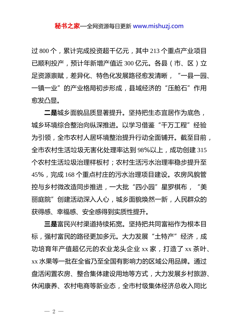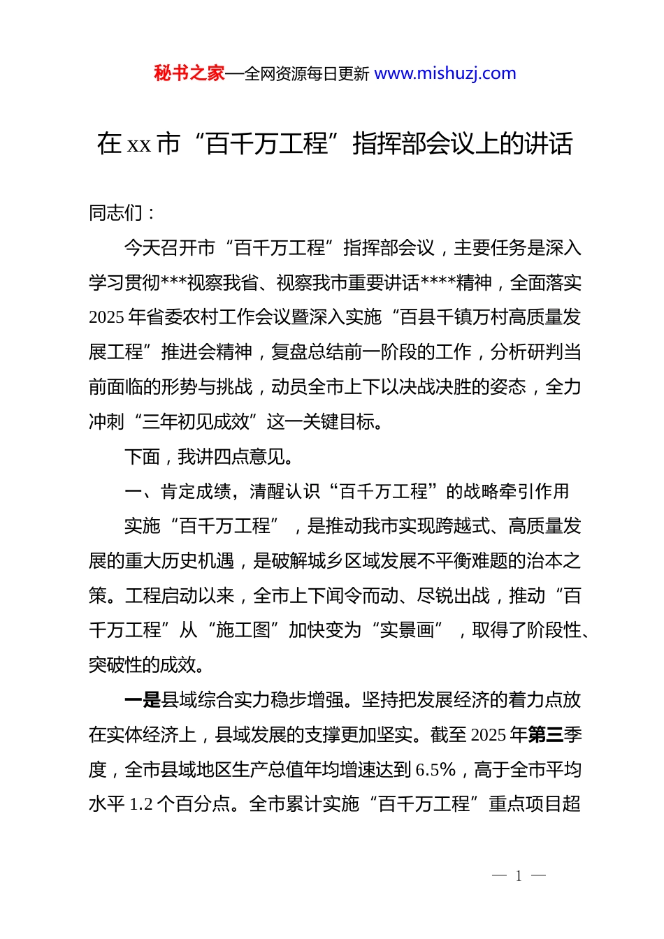 秘书之家—全网资源每日更新 www.mishuzj.com在 xx 市“百千万工程”指挥部会议上的讲话同志们:今天召开市“百千万工程”指挥部会议,主要任务是深入学习贯彻***视察我省、视察我市重要讲话****精神,全面落实2025 年省委农村工作会议暨深入实施“百县千镇万村高质量发展工程”推进会精神,复盘总结前一阶段的工作,分析研判当前面临的形势与挑战,动员全市上下以决战决胜的姿态,全力冲刺“三年初见成效”这一关键目标。下面,我讲四点意见。一、肯定成绩,清醒认识“百千万工程”的战略牵引作用实施“百千万工程”,是推动我市实现跨越式、高质量发展的重大历史机遇,是破解城乡区域发展不平衡难题的治本之策。工程启动以来,全市上下闻令而动、尽锐出战,推动“百千万工程”从“施工图”加快变为“实景画”,取得了阶段性、突破性的成效。一是县域综合实力稳步增强。坚持把发展经济的着力点放在实体经济上,县域发展的支撑更加坚实。截至 2025 年第三季度,全市县域地区生产总值年均增速达到 6.5%,高于全市平均水平 1.2 个百分点。全市累计实施“百千万工程”重点项目超— 1 —秘书之家—全网资源每日更新 www.mishuzj.com过 800 个,累计完成投资超千亿元,其中 213 个重点产业项目已顺利投产,预计年新增产值近 300 亿元。各县(市、区)立足资源禀赋,差异化、特色化发展路径愈发清晰,“一县一园、一镇一业”的产业格局初步形成,县域经济的“压舱石”作用愈发凸显。二是城乡面貌品质显著提升。坚持把生态宜居作为底色,城乡环境综合整治向纵深推进。以学习借鉴“千万工程”经验为引领,全市农村人居环境整治提升行动全面铺开。截至目前,全市农村生活垃圾无害化处理率达到 98%以上,成功创建 315个农村生活垃圾治理样板村;农村生活污水治理率稳步提升至45%,完成 168 个重点村庄的污水治理项目建设。农房风貌管控与乡村微改造同步推进,一大批“四小园”星罗棋布,“美丽庭院”创建活动深入人心,城乡面貌焕然一新,人民群众的获得感、幸福感、安全感得到实质性提升。三是富民兴村渠道持续拓宽。坚持把共同富裕作为根本目标,强村富民的路径更加多元。大力发展“土特产”经济,成功培育年产值超亿元的农业龙头企业 xx 家,打造了 xx 茶叶、xx 水果等一批在全省乃至全国有影响力的区域公用品牌。通过盘活闲置农房、整合集体建设用地等方式,大力发展乡村旅游、休闲康养、农村电商等新业态,全市村级集体经济总收入同比— 2 —秘书之家—全网资源每日更新 www.mishuzj.com增长 15.3%,经营性收入超 10 万元的村占比达到 75%。农村居民人均可支配收入同比增长 7.2%,增速连续两年快于城镇居民。四是体制机制创新取得突破。坚持向改革要动力、向创新要活力,要素保障的瓶颈制约得到初步破解。县域投融资体制改革迈出坚实步伐,各县(市、区)均已组建运营实体化的国有投融资平台,撬动社会资本参与项目建设超 200 亿元。稳慎推进农村“三块地”改革,累计盘活利用农村存量建设用地约1.2 万亩,为产业项目落地和公共设施建设提供了宝贵空间。央地合作、政企联动模式不断深化,与 xx 集团等央企合作的 xx个重点项目加快建设,引导 xx 家民营企业与 xx 个镇(村)建立了结对帮扶关系。在看到成绩的同时,更要清醒地认识到,对标“三年初见成效”的硬性要求,对照人民群众的殷切期盼,工作中还存在不少短板与不足。主要体现在:一是发展不平衡问题依然突出,典型镇村的“盆景”效应尚未有效转化为全域“风景”,市域xx 地区与 xx 地区的发展差距依然明显。二是产业支撑能力有待加强,部分县域的产业项目仍以传统加工业为主,产业链条短、附加值不高,缺乏具有核心竞争力的龙头企业和拳头产品。三是长效管护机制尚未健全,“重建设、轻管护”的现象在一些地方不同程度存在,农村人居环境整治成果巩固面临反弹回潮— 3 —秘书之家—全网资源每日更新 www.mishuzj.com的风险。四是要素瓶颈制约尚未根本破解,建设用地指标紧张、项目融资渠道单一等问题,依然是制约县镇村高质量发展的关键因素。五是群众参与热情有待进一步激发...