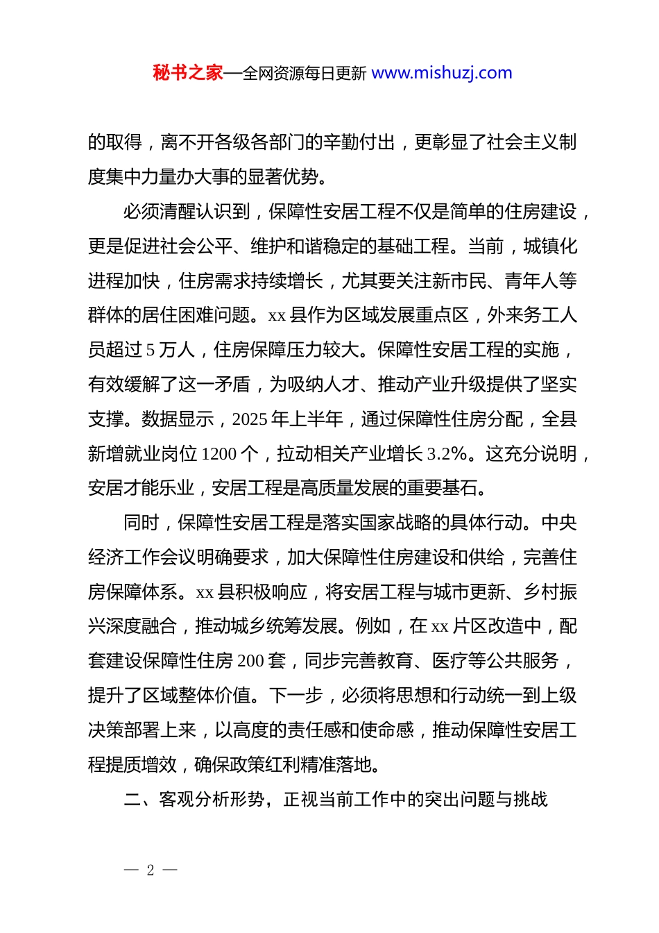秘书之家—全网资源每日更新 www.mishuzj.com在 xx 县住房和城乡建设局 2025 年保障性安居工程业务培训暨工作推进会议上的讲话同志们:今天,xx 县住房和城乡建设局召开 2025 年保障性安居工程业务培训暨工作推进会议,主要任务是深入学习贯彻*中央、国务院关于住房保障工作的决策部署,全面落实省市相关要求,总结前期工作进展,分析当前面临形势,部署下一步重点任务,确保全县保障性安居工程高质量推进。保障性安居工程是关系群众切身利益的民生工程、民心工程,是稳增长、惠民生的重要举措。当前,全县上下正锚定年度目标,全力冲刺第四季度,召开此次会议十分必要、十分及时。希望大家高度重视,认真学习,切实把会议精神转化为推动工作的实际行动。一、提高政治站位,深刻把握保障性安居工程的战略意义保障性安居工程是*和政府关注民生、改善民生的重要抓手,是实现全体人民住有所居目标的关键路径。近年来,xx 县坚持以人民为中心的发展思想,将保障性安居工程纳入经济社会发展全局,统筹谋划、系统推进。2024 年至 2025 年,全县计划新建保障性住房 1200 套,总投资额达 6.8 亿元,已建成交付 850套,惠及群众 3000 余人,完成年度投资计划的 75%。这些成绩— 1 —秘书之家—全网资源每日更新 www.mishuzj.com的取得,离不开各级各部门的辛勤付出,更彰显了社会主义制度集中力量办大事的显著优势。必须清醒认识到,保障性安居工程不仅是简单的住房建设,更是促进社会公平、维护和谐稳定的基础工程。当前,城镇化进程加快,住房需求持续增长,尤其要关注新市民、青年人等群体的居住困难问题。xx 县作为区域发展重点区,外来务工人员超过 5 万人,住房保障压力较大。保障性安居工程的实施,有效缓解了这一矛盾,为吸纳人才、推动产业升级提供了坚实支撑。数据显示,2025 年上半年,通过保障性住房分配,全县新增就业岗位 1200 个,拉动相关产业增长 3.2%。这充分说明,安居才能乐业,安居工程是高质量发展的重要基石。同时,保障性安居工程是落实国家战略的具体行动。中央经济工作会议明确要求,加大保障性住房建设和供给,完善住房保障体系。xx 县积极响应,将安居工程与城市更新、乡村振兴深度融合,推动城乡统筹发展。例如,在 xx 片区改造中,配套建设保障性住房 200 套,同步完善教育、医疗等公共服务,提升了区域整体价值。下一步,必须将思想和行动统一到上级决策部署上来,以高度的责任感和使命感,推动保障性安居工程提质增效,确保政策红利精准落地。二、客观分析形势,正视当前工作中的突出问题与挑战— 2 —秘书之家—全网资源每日更新 www.mishuzj.com在肯定成绩的同时,必须坚持问题导向,深入剖析保障性安居工程建设中存在的短板和不足。近期,县建筑工程质量安全服务中心组织专项检查,覆盖全县 18 个在建项目,发现质量安全隐患 32 处,其中重大隐患 5 处。这些问题集中表现在三个方面:一是施工管理不规范,部分项目存在偷工减料、工序简化现象;二是监理责任落实不到位,个别监理单位对关键环节把关不严,存在“走过场”问题;三是协同配合不紧密,施工单位、监理单位与管理部门之间信息不畅,影响工程整体进度。例如,xx 项目因设计变更未及时沟通,导致工期延误 15 天。数据背后反映出深层次矛盾。一方面,思想认识有偏差,少数单位将保障性住房视为“一般工程”,忽视其民生属性,存在重进度、轻质量倾向。检查中,发现 7 个项目未严格执行质量标准,合格率仅为 85%。另一方面,能力建设有差距,一线管理人员专业素养不足,难以适应高标准要求。本次业务培训前调研显示,30%的施工人员缺乏系统培训,对新材料、新工艺掌握不够。此外,外部环境带来新挑战,建筑材料价格上涨,钢材、水泥成本同比上涨 10%,挤压了项目利润空间,部分企业为降低成本而放松管理。面对这些问题,必须保持清醒头脑,增强忧患意识。保障性安居工程是百年大计,质量是生命线,安全是底线。任何疏— 3 —秘书之家—全网资源每日更新 www.mishuzj.com忽都可能损害群众利益,影响政府公信力。从全国范围看,类似问题时有...