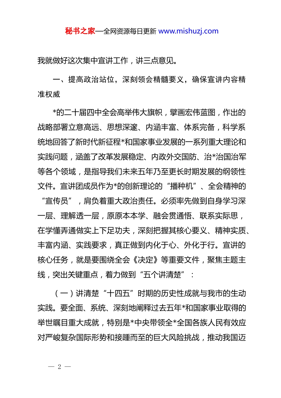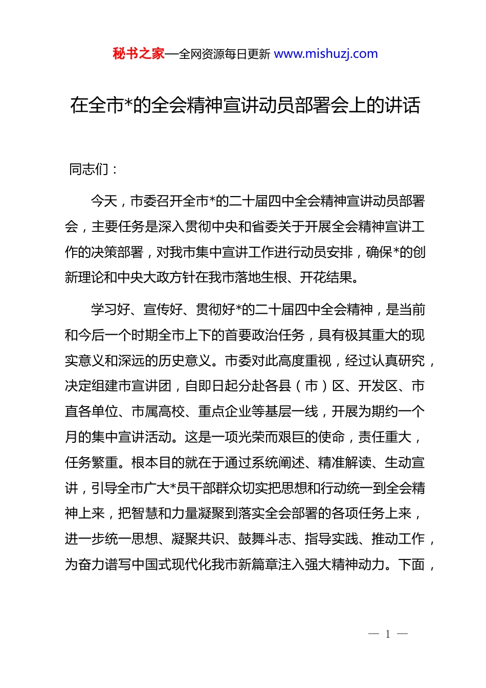 秘书之家—全网资源每日更新 www.mishuzj.com在全市*的全会精神宣讲动员部署会上的讲话 同志们:今天,市委召开全市*的二十届四中全会精神宣讲动员部署会,主要任务是深入贯彻中央和省委关于开展全会精神宣讲工作的决策部署,对我市集中宣讲工作进行动员安排,确保*的创新理论和中央大政方针在我市落地生根、开花结果。学习好、宣传好、贯彻好*的二十届四中全会精神,是当前和今后一个时期全市上下的首要政治任务,具有极其重大的现实意义和深远的历史意义。市委对此高度重视,经过认真研究,决定组建市宣讲团,自即日起分赴各县(市)区、开发区、市直各单位、市属高校、重点企业等基层一线,开展为期约一个月的集中宣讲活动。这是一项光荣而艰巨的使命,责任重大,任务繁重。根本目的就在于通过系统阐述、精准解读、生动宣讲,引导全市广大*员干部群众切实把思想和行动统一到全会精神上来,把智慧和力量凝聚到落实全会部署的各项任务上来,进一步统一思想、凝聚共识、鼓舞斗志、指导实践、推动工作,为奋力谱写中国式现代化我市新篇章注入强大精神动力。下面,— 1 —秘书之家—全网资源每日更新 www.mishuzj.com我就做好这次集中宣讲工作,讲三点意见。一、提高政治站位,深刻领会精髓要义,确保宣讲内容精准权威*的二十届四中全会高举伟大旗帜,擘画宏伟蓝图,作出的战略部署立意高远、思想深邃、内涵丰富、体系完备,科学系统地回答了新时代新征程*和国家事业发展的一系列重大理论和实践问题,涵盖了改革发展稳定、内政外交国防、治*治国治军等各个领域,是指导我们未来五年乃至更长时期发展的纲领性文件。宣讲团成员作为*的创新理论的“播种机”、全会精神的“宣传员”,肩负着重大政治责任。必须率先做到自身学习深一层、理解透一层,原原本本学、融会贯通悟、联系实际思,在学懂弄通做实上下足功夫,深刻把握其核心要义、精神实质、丰富内涵、实践要求,真正做到内化于心、外化于行。宣讲的核心任务,就是要围绕全会《决定》等重要文件,聚焦主题主线,突出关键重点,着力做到“五个讲清楚”:(一)讲清楚“十四五”时期的历史性成就与我市的生动实践。要全面、系统、深刻地阐释过去五年*和国家事业取得的举世瞩目重大成就,特别是*中央带领全*全国各族人民有效应对严峻复杂国际形势和接踵而至的巨大风险挑战,推动我国迈— 2 —秘书之家—全网资源每日更新 www.mishuzj.com上全面建设社会主义现代化国家新征程的光辉历程。紧密联系我市实际,重点讲好我市在“十四五”期间,坚决贯彻落实*中央及省委决策部署,抢抓长三角一体化发展、长江经济带发展、中部崛起等国家战略机遇,在科技创新领域取得量子通信、核聚变等领域的世界级突破性进展,高标准建设运行大科学装置集中区,打造综合性国家科学中心“金字招牌”;在战新产业发展方面,“芯屏汽合”、“急终生智”产业地标加速隆起,新型显示、集成电路、人工智能产业集群实力跻身全国前列,新能源汽车产业异军突起;在城市能级跃升上,现代化都市区框架全面拉开,城市功能品质显著提升,全国性综合交通枢纽地位巩固;在民生福祉改善方面,民生投入持续加大,居民收入稳步增长,“一老一小”、教育医疗、住房保障等公共服务体系更加健全优质。要用大量我市案例、我市数据、我市故事,全面生动展现国家发展伟力在我市大地的具体实践、丰硕成果和人民群众实实在在的获得感幸福感安全感。(二)讲清楚“十五五”时期的重大意义与我市的战略机遇。要深刻阐释“十五五”时期是我国全面建设社会主义现代化国家开局起步的关键五年,是承前启后、继往开来,奠定未来长远发展基础的战略窗口期。对于我市而言,这五年更是我— 3 —秘书之家—全网资源每日更新 www.mishuzj.com们乘势而上、跨越赶超,勇当科技和产业创新开路先锋、打造全省高质量发展核心增长极的关键五年。要讲透我市在国家和区域发展格局中的坐标方位、使命任务:我们正处于多重国家战略叠加赋能的历史机遇期,科教资源富集、创新动能强劲的比较优势期,产业基础雄厚、转型升级加速的攻坚突破期。要引导全市上下深刻认识到肩负的时代重任,切实增强抢抓...