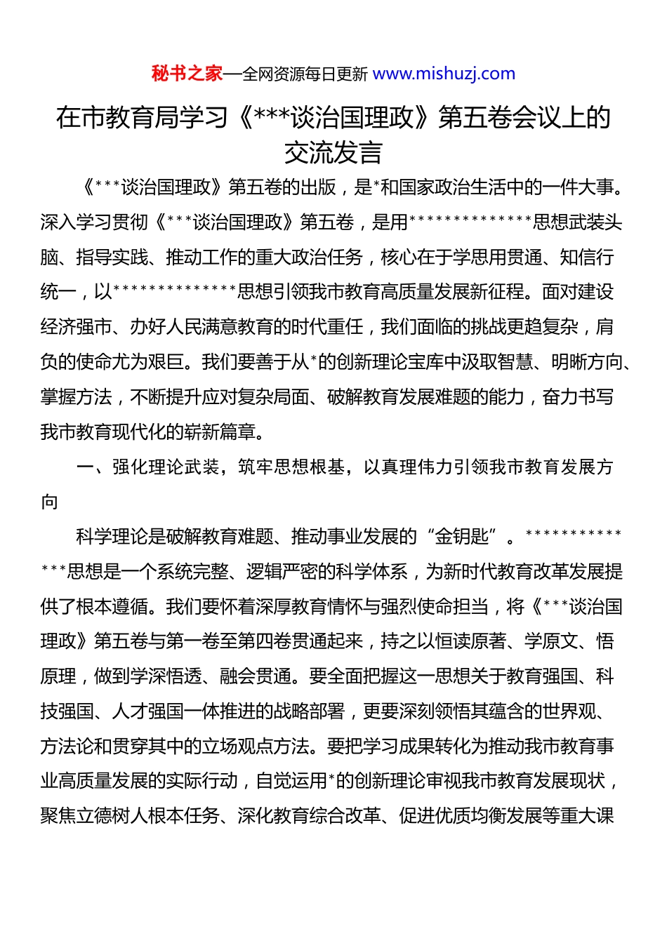 秘书之家—全网资源每日更新 www.mishuzj.com在市教育局学习《***谈治国理政》第五卷会议上的交流发言《***谈治国理政》第五卷的出版,是*和国家政治生活中的一件大事。深入学习贯彻《***谈治国理政》第五卷,是用**************思想武装头脑、指导实践、推动工作的重大政治任务,核心在于学思用贯通、知信行统一,以**************思想引领我市教育高质量发展新征程。面对建设经济强市、办好人民满意教育的时代重任,我们面临的挑战更趋复杂,肩负的使命尤为艰巨。我们要善于从*的创新理论宝库中汲取智慧、明晰方向、掌握方法,不断提升应对复杂局面、破解教育发展难题的能力,奋力书写我市教育现代化的崭新篇章。一、强化理论武装,筑牢思想根基,以真理伟力引领我市教育发展方向科学理论是破解教育难题、推动事业发展的“金钥匙”。**************思想是一个系统完整、逻辑严密的科学体系,为新时代教育改革发展提供了根本遵循。我们要怀着深厚教育情怀与强烈使命担当,将《***谈治国理政》第五卷与第一卷至第四卷贯通起来,持之以恒读原著、学原文、悟原理,做到学深悟透、融会贯通。要全面把握这一思想关于教育强国、科技强国、人才强国一体推进的战略部署,更要深刻领悟其蕴含的世界观、方法论和贯穿其中的立场观点方法。要把学习成果转化为推动我市教育事业高质量发展的实际行动,自觉运用*的创新理论审视我市教育发展现状,聚焦立德树人根本任务、深化教育综合改革、促进优质均衡发展等重大课秘书之家—全网资源每日更新 www.mishuzj.com题,将学习成果切实转化为推动我市教育高质量发展的清晰思路、有效举措和实际能力,使各项工作更具时代性、规律性和创造性。二、聚焦首要任务,践行新发展理念,奋力推动我市教育高质量发展取得新突破高质量发展是新时代教育的硬道理。《***谈治国理政》第五卷深刻阐明了高质量发展的核心要义与实践路径。立足我市教育实际,我们必须深刻领会并坚决贯彻******关于高质量发展是“首要任务”的重要论断,将新发展理念完整、准确、全面融入我市教育发展各环节。要紧扣“发展新质生产力”这一内在要求和重要着力点,思考其教育意涵。要坚持强基固本,持续优化教育资源配置,强力推进学前教育普及普惠、义务教育优质均衡、县域高中发展提升,夯实我市教育高质量发展的根基。要坚持创新驱动,深化育人方式、办学模式、管理体制、保障机制改革,探索拔尖创新人才早期培养的我市路径,激发教育发展内生动力。要突出服务大局,紧密对接我市经济强市建设和产业转型升级需求,优化职业教育类型定位,深化产教融合、科教融汇,提升教育服务区域发展的贡献度。要以改革创新精神破除制约高质量发展的体制机制障碍,努力构建与我市城市发展定位相匹配的高质量教育体系。三、坚持人民至上,厚植教育情怀,用心用情办好人民满意教育“中国式现代化,民生为大”。教育是最大的民生工程。《***谈治国理政》第五卷通篇贯穿着以人民为中心的深厚情怀。我市教育系统必须始终站稳人民立场,将“让每一个孩子都能享有公平而有质量的教育”作为秘书之家—全网资源每日更新 www.mishuzj.com一切工作的出发点和落脚点,努力让我市教育发展成果更多更公平惠及全体市民。要以“时时放心不下”的责任感,聚焦人民群众急难愁盼,持续打好“双减”巩固战,提升课堂教学质量和课后服务水平;大力促进教育公平,保障随迁子女、残疾儿童、留守儿童等群体平等受教育权利;优化招生入学政策,缓解择校焦虑;加强校园安全管理和心理健康教育,守护学生生命安全与身心健康。要将“民生答卷”书写在解决“入园难入园贵”、推动“家门口的好学校”建设、提升教育服务温度等一件件具体的实事上,不断提升人民群众的教育获得感、幸福感、安全感。四、勇于自我革命,锻造过硬队伍,为我市教育行稳致远提供坚强保障推进教育强国建设,关键在*,关键在人。《***谈治国理政》第五卷深刻阐述了*的自我革命的战略思想。我市教育系统全面从严治*必须深入学习贯彻******关于*的自我革命的重要思想,特别是“九个以”的实践要求,深刻认识解决大*独有难题在教育领域的具体体现。要以“革命...