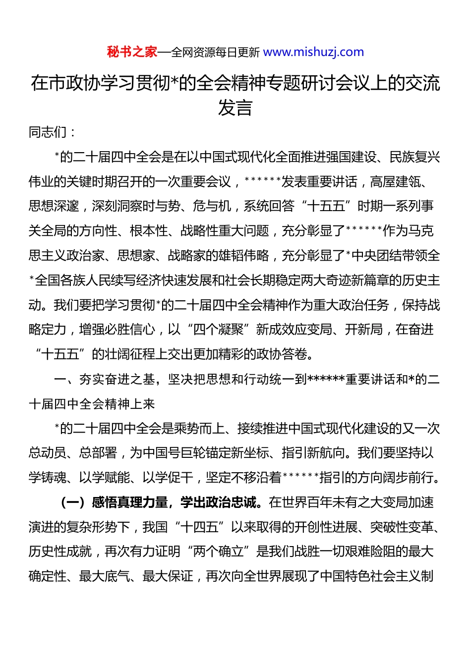 秘书之家—全网资源每日更新 www.mishuzj.com在市政协学习贯彻*的全会精神专题研讨会议上的交流发言同志们:*的二十届四中全会是在以中国式现代化全面推进强国建设、民族复兴伟业的关键时期召开的一次重要会议,******发表重要讲话,高屋建瓴、思想深邃,深刻洞察时与势、危与机,系统回答“十五五”时期一系列事关全局的方向性、根本性、战略性重大问题,充分彰显了******作为马克思主义政治家、思想家、战略家的雄韬伟略,充分彰显了*中央团结带领全*全国各族人民续写经济快速发展和社会长期稳定两大奇迹新篇章的历史主动。我们要把学习贯彻*的二十届四中全会精神作为重大政治任务,保持战略定力,增强必胜信心,以“四个凝聚”新成效应变局、开新局,在奋进“十五五”的壮阔征程上交出更加精彩的政协答卷。一、夯实奋进之基,坚决把思想和行动统一到******重要讲话和*的二十届四中全会精神上来*的二十届四中全会是乘势而上、接续推进中国式现代化建设的又一次总动员、总部署,为中国号巨轮锚定新坐标、指引新航向。我们要坚持以学铸魂、以学赋能、以学促干,坚定不移沿着******指引的方向阔步前行。(一)感悟真理力量,学出政治忠诚。在世界百年未有之大变局加速演进的复杂形势下,我国“十四五”以来取得的开创性进展、突破性变革、历史性成就,再次有力证明“两个确立”是我们战胜一切艰难险阻的最大确定性、最大底气、最大保证,再次向全世界展现了中国特色社会主义制秘书之家—全网资源每日更新 www.mishuzj.com度的显著优势。要从******领航定向创造的新的历史伟业中,从**************思想彰显的强大真理力量中,更加深刻领悟“两个确立”的决定性意义,增强“四个意识”、坚定“四个自信”、做到“两个维护”。(二)把握丰富内涵,学出使命担当。“十五五”规划《建议》通篇贯穿建设社会主义现代化国家这个一以贯之的主题、造福人民这个始终不渝的初心,明确提出“十五五”时期经济社会发展的指导思想、主要目标和必须遵循的原则,科学部署一批富有前瞻性、全局性、基础性、针对性的重大举措,在谋定长远中为中国式现代化夯基聚势。要原原本本、逐字逐句学习《建议》精神,吃透“六个坚持”、12 个方面战略部署的核心要义,结合我市发展实际、政协工作实际,在全面系统、融会贯通上下功夫,切实用以统一思想、指导实践、引领发展。(三)增强学习实效,学出奋进合力。制定落实市政协学习宣传贯彻工作方案,召开学习性常委会会议,组织好*组理论学习中心组学习会、**************思想学习座谈会等各类学习活动,面向界别群众开展好委员宣讲,形成从市政协到市县政协、从*内到*外、从机关到委员的全覆盖学习热潮,把学习成效转化为做好各项工作、创造一流业绩的强大动力。二、彰显协商之效,以高质量履职助力“十五五”经济社会高质量发展******对我市充满深情、寄予厚望,为我们擘画了奋力谱写中国式现代化建设我市篇章的宏伟蓝图。全市上下牢记嘱托、感恩奋进,我市在全国发展大局中的贡献和作用进一步提高,很多方面发生可喜的新变化。秘书之家—全网资源每日更新 www.mishuzj.com“十五五”时期是我市高质量发展持续向上突围的关键时期,我们要把助力“十五五”开好局起好步作为明年的履职主线,在围绕中心、服务大局上彰显新作为。(一)聚焦高质量发展谋良策。紧扣“五位一体”总体布局、“四个全面”战略布局,围绕深入推进京津冀协同发展、高标准高质量建设雄安新区、建设现代化产业体系、发展新质生产力、构建高水平社会主义市场经济体制、发展壮大民营经济等重要工作,坚持“小切口、更聚焦”,组织委员积极参与专题研究和协商活动,增强针对性、拓展纵深度,推动履职成果转化为加快高质量发展的务实举措。(二)坚持人民至上增福祉。把就业、社保、教育、医疗、养老等群众关心关切作为助力“十五五”发展的着力重点,谋深谋细重点履职,用心用情开展委员履职“服务为民”活动,及时提交提案、反映社情民意信息,助推解决群众急难愁盼问题,让现代化建设成果更加可视可感可及。(三)深化合作共事筑同心。加强同民主*派联合履职,组织好*外委员专题视察、...