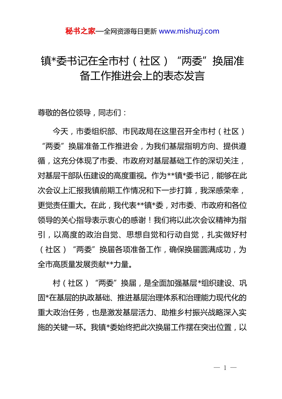 秘书之家—全网资源每日更新 www.mishuzj.com镇*委书记在全市村(社区)“两委”换届准备工作推进会上的表态发言尊敬的各位领导,同志们:今天,市委组织部、市民政局在这里召开全市村(社区)“两委”换届准备工作推进会,为我们基层指明方向、提供遵循,这充分体现了市委、市政府对基层基础工作的深切关注,对基层干部队伍建设的高度重视。作为**镇*委书记,能够在此次会议上汇报我镇前期工作情况和下一步打算,我深感荣幸,更觉责任重大。在此,我代表**镇*委,对市委、市政府和各位领导的关心指导表示衷心的感谢!我们将以此次会议精神为指引,以高度的政治自觉、思想自觉和行动自觉,扎实做好村(社区)“两委”换届各项准备工作,确保换届圆满成功,为全市高质量发展贡献**力量。村(社区)“两委”换届,是全面加强基层*组织建设、巩固*在基层的执政基础、推进基层治理体系和治理能力现代化的重大政治任务,也是激发基层活力、助推乡村振兴战略深入实施的关键一环。我镇*委始终把此次换届工作摆在突出位置,以— 1 —秘书之家—全网资源每日更新 www.mishuzj.com严之又严的标准、实之又实的作风,全力以赴抓好各项准备工作。下面,我将我镇在换届准备工作中的一些思考和具体做法,向各位领导和同志们做一汇报。一、提高政治站位,深刻认识村(社区)“两委”换届的重大意义村(社区)“两委”换届,是基层政治生活中的一件大事事关*在基层的执政根基,事关人民群众的切身利益,事关乡村振兴的全局推进。我们深刻认识到,做好换届工作,是贯彻落实中央和省市委决策部署的具体体现,也是推动**镇高质量发展的内在要求。一是村(社区)“两委”换届是夯实*的执政基础的关键之举。基层是*的执政之基、力量之源。村(社区)“两委”班子直接面向群众、服务群众,是*和政府各项方针政策的“最后一公里”执行者。通过高质量的换届,选优配强“两委”班子,能够进一步提升基层*组织的政治功能和组织力,确保*中央的决策部署在基层落地生根、开花结果,不断巩固*在农村牧区和社区的执政根基。实践表明,一个坚强有力的村(社区)“两委”班子,能够有效团结带领群众听*话、跟*走,形成推动发展的强大合力。— 2 —秘书之家—全网资源每日更新 www.mishuzj.com二是村(社区)“两委”换届是推进基层治理现代化的重要保障。新时代基层治理,要求我们更好地发挥村(社区)*组织的领导作用,健全自治、法治、德治相结合的乡村治理体系。通过换届,选拔一批政治坚定、能力过硬、作风优良的基层干部,能够有效提升基层治理的科学化、精细化、法治化水平。这不仅能够优化基层公共服务,解决群众身边的操心事、烦心事、揪心事,更能有效化解基层矛盾,维护社会和谐稳定,为基层社会治理现代化注入新的活力。三是村(社区)“两委”换届是实施乡村振兴战略的组织支撑。乡村振兴,关键在人,核心在班子。村(社区)“两委”班子是乡村振兴的“主心骨”和“领头雁”。此次换届,是我们选拔一批懂农业、爱农村、爱农民的优秀人才进入班子的绝佳契机。通过选出政治过硬、能带领群众致富、善于治理的骨干力量,能够为产业发展、人居环境改善、乡风文明建设等各项乡村振兴任务提供坚实的组织保障和人才支撑,让乡村振兴的蓝图在**镇变成美好现实。四是村(社区)“两委”换届是检验全面从严治*向基层延伸的重要实践。全面从严治*永远在路上。村(社区)“两委”换届是基层政治生态的“晴雨表”。我们必须把加强*的领导贯— 3 —秘书之家—全网资源每日更新 www.mishuzj.com穿换届全过程,严明换届纪律,坚决杜绝拉票贿选、宗族势力干扰等行为,营造风清气正的换届环境。这既是对基层*组织的一次“政治体检”,也是对基层*员干部的一次*性锤炼,能够有效推动全面从严治*向纵深发展,净化基层政治生态,确保基层政权肌体健康、充满活力。基于上述认识,我镇*委将始终以对*和人民高度负责的态度,把这次换届工作作为当前和今后一个时期的重中之重,精心组织、周密部署、扎实推进,确保换届工作高质量、高水平完成。二、强化责任担当,周密部署换届准备各项工作高质量完成村(社区)“两委”换...