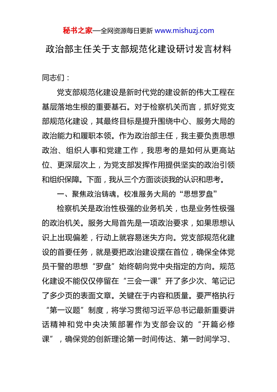 秘书之家—全网资源每日更新 www.mishuzj.com政治部主任关于支部规范化建设研讨发言材料 同志们:党支部规范化建设是新时代党的建设新的伟大工程在基层落地生根的重要基石。对于检察机关而言,抓好党支部规范化建设,其最终目标是提升围绕中心、服务大局的政治能力和履职本领。作为政治部主任,我主要负责思想政治、组织人事和党建工作,我思考的是如何从更高站位、更深层次上,为党支部发挥作用提供坚实的政治引领和组织保障。下面,我从三个方面谈谈我的认识和思考。一、聚焦政治铸魂,校准服务大局的“思想罗盘”检察机关是政治性极强的业务机关,也是业务性极强的政治机关。服务大局首先是一项政治要求,如果思想认识上出现偏差,行动上就容易迷失方向。党支部规范化建设的首要任务,就是要把政治建设摆在首位,确保全体党员干警的思想“罗盘”始终朝向党中央指定的方向。规范化建设不能仅仅停留在“三会一课”开了多少次、笔记记了多少页的表面文章。关键在于内容和质量。要严格执行“第一议题”制度,将学习贯彻习近平总书记最新重要讲话精神和党中央决策部署作为支部会议的“开篇必修课”,确保党的创新理论第一时间传达、第一时间学习、秘书之家—全网资源每日更新 www.mishuzj.com第一时间贯彻。例如,围绕我县“生态立县、产业强县”的发展战略,党支部就应系统组织学习相关法律法规和政策文件,引导党员干部充分地理解检察履职在护航绿色发展、优化营商环境中的切入点和着力点。政治部将牵头制定年度党员学习教育培训工作计划,确保学习内容与中心工作同频共振,改变过去党建学习与业务工作“两张皮”的现象,让每一次学习都成为一次思想上的“对表”和服务大局能力的“充电”。二、着眼能力锻造,夯实服务大局的“人才根基”服务大局,能力是基础,人才是关键。一支政治过硬、本领高强的检察队伍,是党支部战斗力的直接体现。党支部规范化建设,为我们系统性锻造人才提供了绝佳平台。我思考的是,如何通过规范化的组织体系和管理机制,激发党员干警的内生动力,将组织要求转化为个人追求。借鉴 XX 市等地推行机关党组织“三级五岗”责任清单的经验,我们将进一步细化明确从支部书记到普通党员在服务大局中的具体职责,并将其作为履职评议、评先评优的重要依据,形成“人人肩上有担子、个个身上有责任”的生动局面。同时,要依托规范化建设,建立常态化、差异化的党员培训机制。计划在 2026 年,针对不同业务条线的党员,分批次组织进入党校或先进地区进行集中轮训,秘书之家—全网资源每日更新 www.mishuzj.com培训内容既包括党的理论和党性教育,也包括金融、环保、知识产权等服务新发展格局所需的专业知识。通过这种“政治+业务”的融合式培训,旨在培养一批既懂党建又精业务的复合型检察人才,为我院在服务经济社会高质量发展大局中提供坚实的人才支撑。三、深化机制创新,激活服务大局的“融合引擎”党建与业务的深度融合,是提升服务大局本领的根本路径。过去,我院综合党支部曾被评为“全市、全县标准化规范化建设示范党支部”,这说明我们有很好的基础。下一步,规范化建设的重点应放在机制创新上,打造更多可复制、可推广的融合样板。政治部将主导推进“一支部一品牌”提质扩面行动,鼓励各检察业务部门党小组结合自身职能,创建特色党建品牌。例如,负责未成年人检察工作的党小组,可以创建“XX 护苗”党建品牌,通过开展“法治进校园”、心理疏导、司法救助等一系列活动,将党建工作与保护未成年人权益这一“国之大者”紧密结合。我们将建立项目化的品牌培育机制,从立项申报、中期评估到成果推广,进行全周期指导和支持。同时,积极探索将党建成效纳入检察业务考评体系的量化指标,例如,将党支部在服务优化营商环境、参与社会治理中解决的实际问题数量、获得的群众满意度等,作为评价支部工秘书之家—全网资源每日更新 www.mishuzj.com作成效的重要标准,从而真正实现党建工作与检察业务从“相加”迈向“相融”,以高质量党建引领高质量检察履职,为服务 XX 县发展大局贡献更大力量。