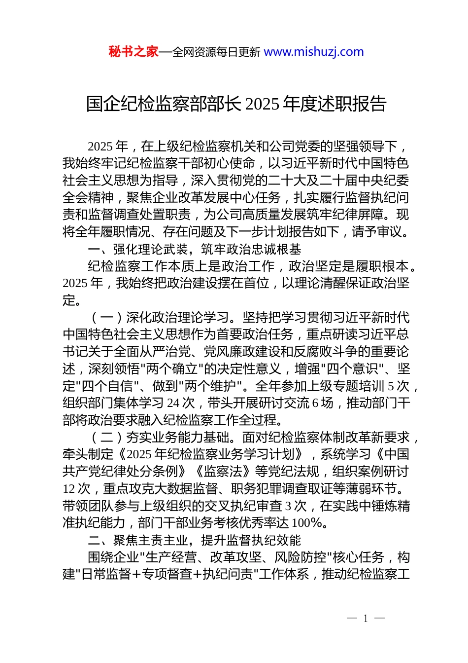 秘书之家—全网资源每日更新 www.mishuzj.com国企纪检监察部部长 2025 年度述职报告2025 年,在上级纪检监察机关和公司党委的坚强领导下,我始终牢记纪检监察干部初心使命,以习近平新时代中国特色社会主义思想为指导,深入贯彻党的二十大及二十届中央纪委全会精神,聚焦企业改革发展中心任务,扎实履行监督执纪问责和监督调查处置职责,为公司高质量发展筑牢纪律屏障。现将全年履职情况、存在问题及下一步计划报告如下,请予审议。一、强化理论武装,筑牢政治忠诚根基纪检监察工作本质上是政治工作,政治坚定是履职根本。2025 年,我始终把政治建设摆在首位,以理论清醒保证政治坚定。(一)深化政治理论学习。坚持把学习贯彻习近平新时代中国特色社会主义思想作为首要政治任务,重点研读习近平总书记关于全面从严治党、党风廉政建设和反腐败斗争的重要论述,深刻领悟"两个确立"的决定性意义,增强"四个意识"、坚定"四个自信"、做到"两个维护"。全年参加上级专题培训 5 次,组织部门集体学习 24 次,带头开展研讨交流 6 场,推动部门干部将政治要求融入纪检监察工作全过程。(二)夯实业务能力基础。面对纪检监察体制改革新要求,牵头制定《2025 年纪检监察业务学习计划》,系统学习《中国共产党纪律处分条例》《监察法》等党纪法规,组织案例研讨12 次,重点攻克大数据监督、职务犯罪调查取证等薄弱环节。带领团队参与上级组织的交叉执纪审查 3 次,在实践中锤炼精准执纪能力,部门干部业务考核优秀率达 100%。二、聚焦主责主业,提升监督执纪效能围绕企业"生产经营、改革攻坚、风险防控"核心任务,构建"日常监督+专项督查+执纪问责"工作体系,推动纪检监察工— 1 —秘书之家—全网资源每日更新 www.mishuzj.com作与企业发展深度融合。(一)做实政治监督,保障决策落地。以"两个维护"为根本任务,紧盯上级决策部署和公司党委重点工作落实情况,建立"清单化监督、项目化推进"机制。全年监督检查"第一议题"落实 32 次,核查主题教育开展情况 16 次,督促整改理论学习走形式、责任传导弱化等问题 8 个。聚焦国企改革三年行动收尾、重大项目建设等重点工作,开展专项监督 7 次,推动解决审批流程繁琐、进度滞后等问题 11 个,确保企业发展方向不偏航。(二)做细日常监督,防范廉政风险。一是紧盯"关键少数"。建立领导班子及中层干部廉政档案 86 份,动态更新廉政信息 300 余条;通过廉政谈话、述职述廉等方式,监督"一把手"及班子成员履行"一岗双责"情况,全年开展提醒谈话 42 人次、任前廉政谈话 18 人次。二是排查风险隐患。聚焦工程建设、物资采购、选人用人等重点领域,牵头排查廉政风险点 43 个,制定防控措施 62 项,建立风险防控台账并实行销号管理。推动相关部门完善招标管理、资金使用等制度 15 项,从源头堵塞漏洞。三是强化作风建设。深入落实纪律规定精神,紧盯节假日等重要节点,开展明察暗访 18 次,查处违规吃喝、公车私用等"四风"问题 6 起,处理 8 人,通报曝光典型案例 4 批次。针对隐形变异"四风"问题,开展"吃公函""隐性福利"专项整治,排查可疑票据 2000 余张,整改不规范问题 23 个。(三)做强执纪问责,保持高压态势。坚持有案必查、有腐必惩,规范问题线索处置流程,全年受理群众举报线索 26 件,办结率 100%;立案查处违纪案件 13 起,给予党纪政务处分 16人次,挽回经济损失 280 余万元。在执纪审查中,严格遵循"事实清楚、证据确凿、定性准确"原则,推行"一案一剖析、一案一警示",组织干部观看警示教育片 6 场次,召开案件通报会 3次,用身边事教育身边人,实现"查处一案、警示一片"的效果。— 2 —秘书之家—全网资源每日更新 www.mishuzj.com(四)做深廉政教育,培育廉洁文化。以"廉洁文化月"为载体,构建"多维立体"教育体系。邀请专家开展党纪法规讲座 4场,覆盖干部职工 800 余人次;组织参观廉政教育基地 2 批次,征集廉洁书画、微视频等作品 56 件;通过企业公众号推送廉政资讯 120 条、发送廉政短信 600 余条,营造"崇廉尚洁"浓厚氛围。针对不同岗位特点,...