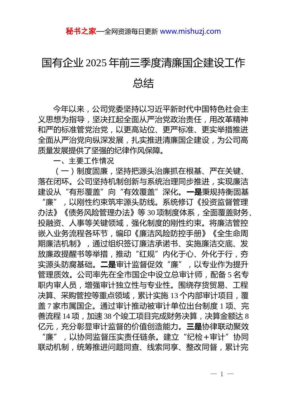 秘书之家—全网资源每日更新 www.mishuzj.com国有企业 2025 年前三季度清廉国企建设工作总结今年以来,公司党委坚持以习近平新时代中国特色社会主义思想为指导,坚决扛起全面从严治党政治责任,用改革精神和严的标准管党治党,以更高站位、更严标准、更实举措推进全面从严治党向纵深发展,扎实推进清廉国企建设,为公司高质量发展提供了坚强的纪律作风保障。一、主要工作情况(一)制度固廉,坚持把源头治廉抓在根基、严在关键、落在闭环。公司坚持机制创新与系统治理同步推进,实现廉洁建设从“有形覆盖”向“有效覆盖”深化。一是秉规持衡固基“廉”,以刚性约束筑牢源头防线。系统修订《投资监督管理办法》《债务风险管理办法》等 30 项制度体系,全面覆盖财务、投融资、人事等关键领域,强化制度的刚性约束。将廉洁管控嵌入业务流程各环节,编印《廉洁风险防控手册》《全生命周期廉洁机制》,通过组织签订廉洁承诺书、实施廉洁交底、发放廉政提醒书等举措,推动“红规”内化于心、外化于行,夯实源头防腐基础。二是审计监督促效“廉”,以专业作为提升管理质效。公司率先在全市国企中设立总审计师,配备 5 名专职内审人员,增强审计独立性与专业性。围绕存货贸易、工程决算、采购管控等重点领域,累计实施 13 个内部审计项目,覆盖 7 家市属国企。通过审计推动被审计单位出台制度 1 项、完善流程 14 项,加速 38 个竣工项目完成财务决算,决算金额达 8亿元,充分彰显审计监督的价值创造能力。三是协律联动聚效“廉”,以协同监督压实责任链条。建立“纪检+审计”协同联动机制,统筹推进问题同查、线索同享、整改同督,累计完— 1 —秘书之家—全网资源每日更新 www.mishuzj.com成 52 项问题整改。创新实施“进点话廉、驻点督廉、撤点验廉”的审计全过程廉洁管理模式,设立审计项目清廉监督员,完善“清廉码”举报与线索移送机制,建立审计人员审前廉洁承诺、现场示范教育、廉洁纪律反馈与回访评估等机制,构建起全链条、可追溯的廉洁闭环管理体系。(二)数智助廉,坚持把智慧监督精在数据、严在预警、明在流程。公司将数字化改革作为清廉建设的重要引擎,推动监督模式由“人防人控”向“技防智控”转型。一是全域数控,打通监管“最后一公里”。完成市属 226 家国企共 358 个账套全面上线,统一财务核算与资产监管标准,打破数据壁垒。创新运用线上报销系统,成为全省首家国有企业试点,实现报销全程透明留痕、风险实时预警,从源头上防治“微腐败”。二是智能预警,织密投资“风险防护网”。对接招商银行基金投资管理系统,将廉洁要求植入项目储备、投前尽调、投中决策、投后评价全流程,设置 12 个廉洁风险点位,实行“红黄绿”三色预警管理,通过线上流程约束、节点控制与异常监测,实现投资管理可视化、可追溯、可预警。三是阳光运作,筑牢资本“合规防火墙”。针对总规模 173.45 亿元的政府产业基金体系,制定《市产业基金投资管理实施细则》《科创产业基金管理办法》,选聘财通资本、协同创新两家专业管理人,完成 37 个项目、15.68 亿元投资监管,在基金运行中落实重大事项报告制度,通过线上集体“晒廉”、纪检监督“保廉”、制度规范“约廉”,确保产业基金全过程合规透明。(三)思想铸廉,坚持把清风育人融在文化、抓在队伍、显在担当。公司坚持廉洁教育、廉洁文化、队伍建设多措并举,推动廉洁理念内化于心、外化于行。一是政治领航,以文澜正气内化廉洁自觉。创新“红润国投”“四心党建”“蓝海青帆”等品牌,构建“金心共富”党建联建机制,联合金融机构、乡镇村社开展共建 30 余次,组建“红帆宣讲团”深入一线宣讲— 2 —秘书之家—全网资源每日更新 www.mishuzj.com纪律红线。高标准建设国企党校“蓝海红帆”分校,实现青年财务人员轮训全覆盖,常态化开展“国投青年说”“青年圆桌会”,强化年轻职工廉洁教育。二是文化润心,以廉韵清风滋养精神沃土。连续开展“510 我要廉”宣传月、廉洁文化节、“清风传家・廉润国投”家风助廉活动,自主创作廉政小品、清廉微电影、飞花令廉洁诗词会、廉政剧本杀等特色项目,开...