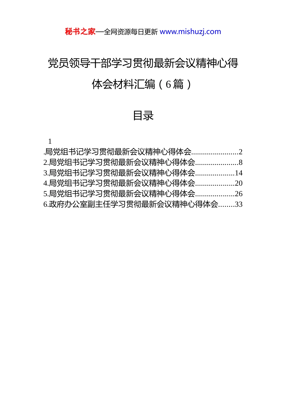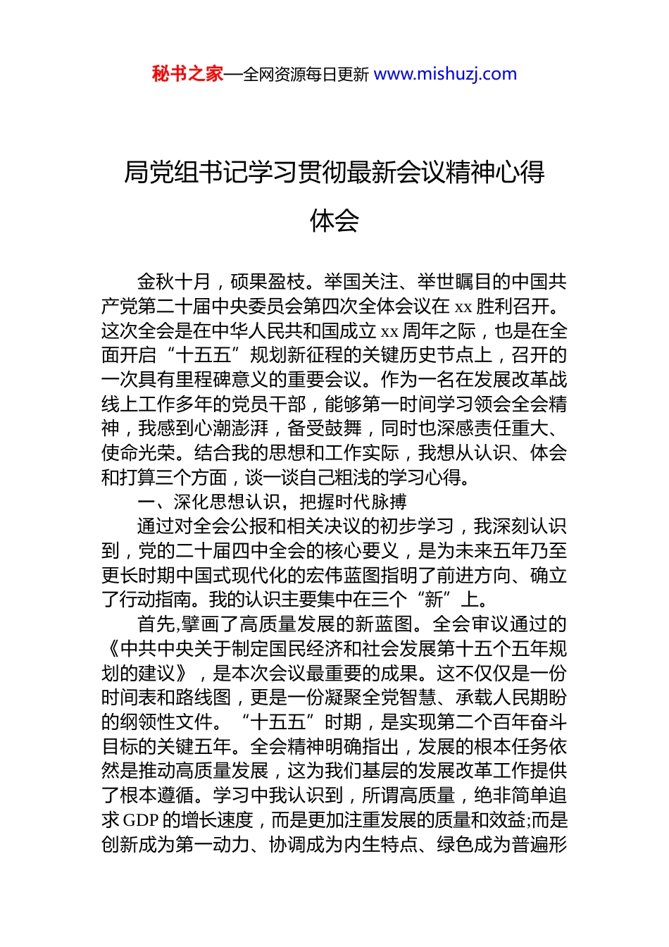 秘书之家—全网资源每日更新 www.mishuzj.com党员领导干部学习贯彻最新会议精神心得体会材料汇编(6 篇)目录1.局党组书记学习贯彻最新会议精神心得体会........................22.局党组书记学习贯彻最新会议精神心得体会......................83.局党组书记学习贯彻最新会议精神心得体会....................144.局党组书记学习贯彻最新会议精神心得体会....................205.局党组书记学习贯彻最新会议精神心得体会....................266.政府办公室副主任学习贯彻最新会议精神心得体会........33秘书之家—全网资源每日更新 www.mishuzj.com局党组书记学习贯彻最新会议精神心得体会金秋十月,硕果盈枝。举国关注、举世瞩目的中国共产党第二十届中央委员会第四次全体会议在 xx 胜利召开。这次全会是在中华人民共和国成立 xx 周年之际,也是在全面开启“十五五”规划新征程的关键历史节点上,召开的一次具有里程碑意义的重要会议。作为一名在发展改革战线上工作多年的党员干部,能够第一时间学习领会全会精神,我感到心潮澎湃,备受鼓舞,同时也深感责任重大、使命光荣。结合我的思想和工作实际,我想从认识、体会和打算三个方面,谈一谈自己粗浅的学习心得。一、深化思想认识,把握时代脉搏通过对全会公报和相关决议的初步学习,我深刻认识到,党的二十届四中全会的核心要义,是为未来五年乃至更长时期中国式现代化的宏伟蓝图指明了前进方向、确立了行动指南。我的认识主要集中在三个“新”上。首先,擘画了高质量发展的新蓝图。全会审议通过的《中共中央关于制定国民经济和社会发展第十五个五年规划的建议》,是本次会议最重要的成果。这不仅仅是一份时间表和路线图,更是一份凝聚全党智慧、承载人民期盼的纲领性文件。“十五五”时期,是实现第二个百年奋斗目标的关键五年。全会精神明确指出,发展的根本任务依然是推动高质量发展,这为我们基层的发展改革工作提供了根本遵循。学习中我认识到,所谓高质量,绝非简单追求 GDP 的增长速度,而是更加注重发展的质量和效益;而是创新成为第一动力、协调成为内生特点、绿色成为普遍形秘书之家—全网资源每日更新 www.mishuzj.com态、开放成为必由之路、共享成为根本目的的发展。这要求我们的思维方式、工作方法都必须实现根本性的转变,从“有没有”转向“好不好”,从“快不快”转向“优不优”。其次,一是明确了统筹兼顾的新要求。全会精神贯穿着一种深刻的系统观念和辩证思维,强调要更好地统筹国内国际两个大局,统筹发展和安全,统筹质的有效提升和量的合理增长。在当前复杂多变的国内外环境下,这种统筹兼顾显得尤为重要。对我个人而言,印象最深的是“发展和安全”的并重。作为欠发达地区的基层干部,过去可能更多地将精力聚焦于抓项目、促投资、稳增长上,但全会的精神提醒我,没有安全和稳定,一切发展都无从谈起。无论是经济金融风险的防范,还是粮食能源安全、产业链供应链安全的保障,都必须像抓发展一样,时刻放在心上抓在手上。这是一种更高层次的执政理念,也是对我们能力本领的更高要求。最后,是彰显了人民至上的新境界。全会强调,推进中国式现代化的最终目的是满足人民日益增长的美好生活需要,要扎实推进共同富裕。这一点让我感触颇深。发展改革工作,一头连着宏观经济大盘,一头连着千家万户的“柴米油盐”。全会提出的保障和改善民生、完善社会治理体系等一系列部署让我更加清晰地认识到,我们工作的出发点和落脚点永远是人民。无论是编制一项规划、审批一个项目,还是研究一项价格政策,都必须首先思考:这是否符合人民的根本利益?是否能增进人民的福祉?这种以人民为中心的发展思想,是共产党人不变的初心,也是我们做好一切工作的价值标尺。二、结合岗位体会,领悟责任使命作为 x 县发展和改革局的负责人,学习全会精神,我更多的是一种“对号入座”的审视和反思。发展改革部门是党委、政府的“参谋部”和“作战部”,全会描绘的宏伟秘书之家—全网资源每日更新 www.mishuzj.com蓝图,最终要通过我们一笔一画地将其细化为地方的“施工图”。这种将中央顶层设计与地方发展实践相结合的...