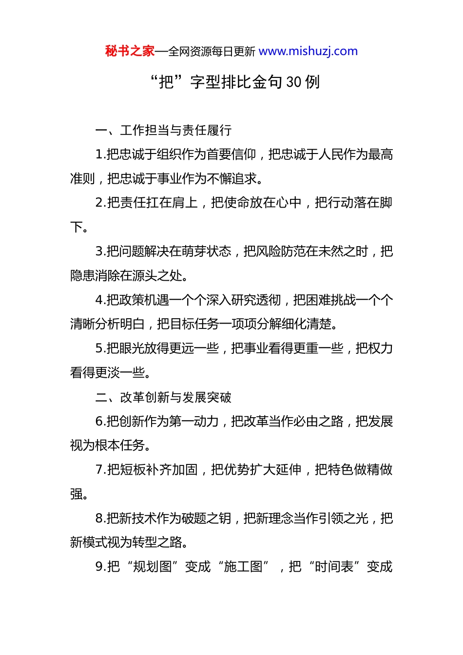 秘书之家—全网资源每日更新 www.mishuzj.com“把”字型排比金句 30 例 一、工作担当与责任履行1.把忠诚于组织作为首要信仰,把忠诚于人民作为最高准则,把忠诚于事业作为不懈追求。2.把责任扛在肩上,把使命放在心中,把行动落在脚下。3.把问题解决在萌芽状态,把风险防范在未然之时,把隐患消除在源头之处。4.把政策机遇一个个深入研究透彻,把困难挑战一个个清晰分析明白,把目标任务一项项分解细化清楚。5.把眼光放得更远一些,把事业看得更重一些,把权力看得更淡一些。二、改革创新与发展突破6.把创新作为第一动力,把改革当作必由之路,把发展视为根本任务。7.把短板补齐加固,把优势扩大延伸,把特色做精做强。8.把新技术作为破题之钥,把新理念当作引领之光,把新模式视为转型之路。9.把“规划图”变成“施工图”,把“时间表”变成秘书之家—全网资源每日更新 www.mishuzj.com“里程表”,把“任务书”变成“成绩单”。10.把困难当阶梯向上攀登,把挫折当养分积蓄力量,把失败当镜子校准方向。三、团队建设与组织管理11.把团队凝聚起来,把人心团结起来,把力量汇聚起来。12.把正确的人放在正确的岗位,把合适的任务交给合适的人员,把精准的要求提给精准的对象。13.把思想政治工作做细,把文化建设抓实,把作风建设抓牢。14.把每个人的专长发挥出来,把每个团队的优势放大出来,把每个部门的作用彰显出来。15.把制度当作“压舱石”,把执行当作“生命线”,把监督当作“防火墙”。四、基层实践与为民服务16.把信访群众当作自己的家人,把群众来信当作家书来读,把信访之事当作家事来办。17.把群众呼声作为第一信号,把群众需求作为第一选择,把群众满意作为第一标准。18.把温暖送到基层去,把问题收上来解决;把政策落实到实处去,把服务跟上来保障。秘书之家—全网资源每日更新 www.mishuzj.com19.把汗水播洒在一线,把智慧浇灌在一线,把成就书写在一线。20.把基层作为根系来滋养,把一线作为熔炉来锻造,把群众作为老师来请教。五、自我提升与奋斗精神21.把真干作为本分,把实干作为责任,把苦干作为追求。22.把心思聚焦在谋发展上,把精力集中在解难题上,把智慧倾注到创实绩上。23.把失去的时间抢回来,把落下的进度补起来,把发展的节奏拉上来。24.把理想种在实践的土壤里,把本领练在斗争的熔炉中,把担当写在奋斗的旗帜上。25 把精力向一线倾斜,把资源向基层汇聚,把成效在一线检验。六、风险防控与长远规划26.把风险研判得更精准一些,把措施制定得更周密一些,把预案演练得更扎实一些。27.把压力转化为突破的“推进器”,把挑战转化为成长的“磨刀石”,把危机转化为创新的“转折点”。28.把“不可能”变成“可能”,把“办不到”干成秘书之家—全网资源每日更新 www.mishuzj.com“办得好”,把“差不多”做到“极致化”。29.把问题清单当“军令状”,把整改台账当“作战图”,把成效反馈当“荣誉榜”。30.把战略定力保持到底,把战术机动调整到位,把战役执行做到极致。