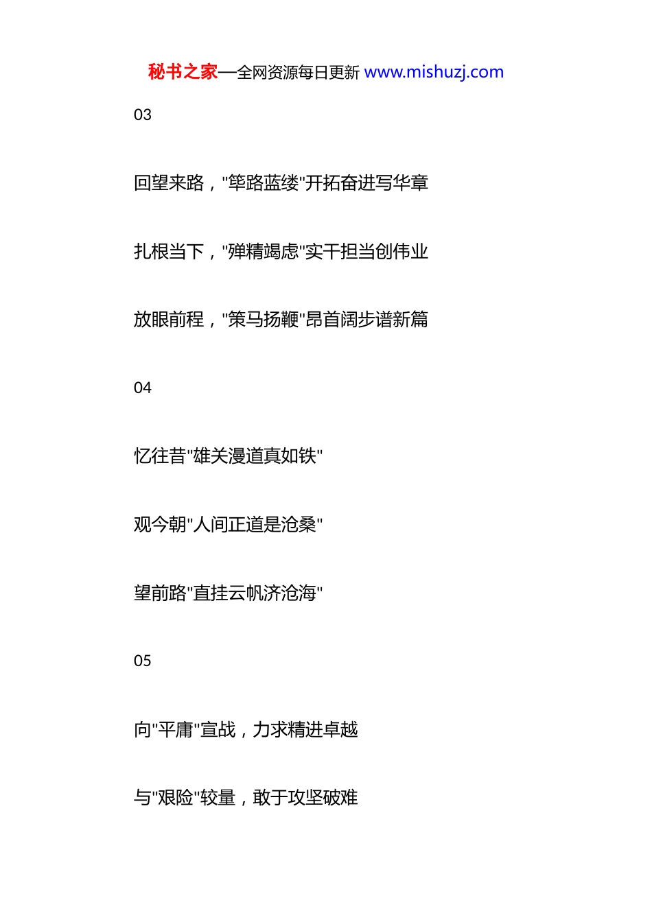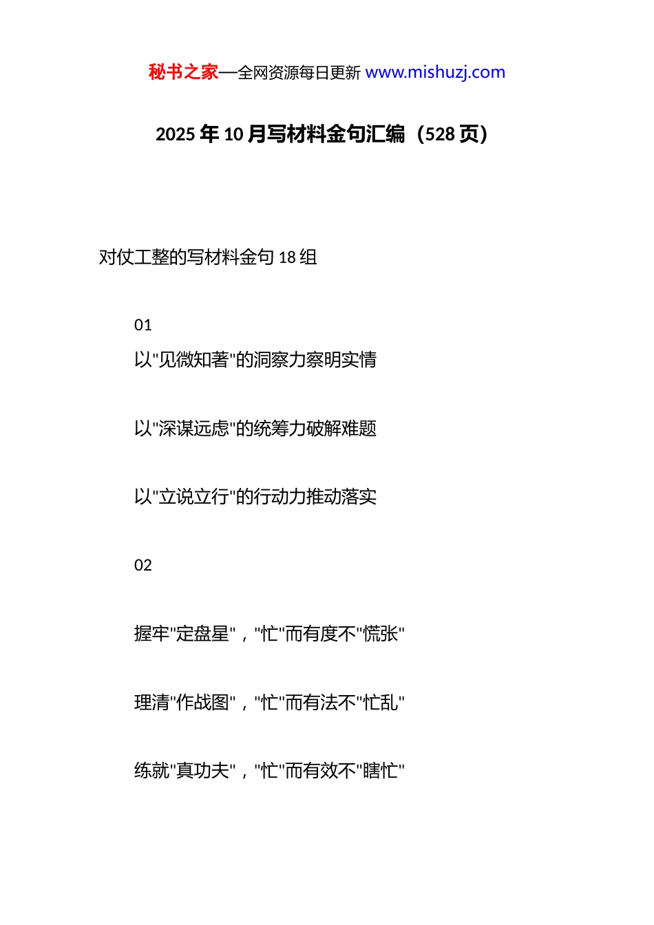 秘书之家—全网资源每日更新 www.mishuzj.com2025 年 10 月写材料金句汇编(528 页)对仗工整的写材料金句 18 组01以"见微知著"的洞察力察明实情 以"深谋远虑"的统筹力破解难题 以"立说立行"的行动力推动落实 02 握牢"定盘星","忙"而有度不"慌张" 理清"作战图","忙"而有法不"忙乱" 练就"真功夫","忙"而有效不"瞎忙"秘书之家—全网资源每日更新 www.mishuzj.com 03 回望来路,"筚路蓝缕"开拓奋进写华章 扎根当下,"殚精竭虑"实干担当创伟业 放眼前程,"策马扬鞭"昂首阔步谱新篇 04 忆往昔"雄关漫道真如铁" 观今朝"人间正道是沧桑" 望前路"直挂云帆济沧海" 05 向"平庸"宣战,力求精进卓越 与"艰险"较量,敢于攻坚破难秘书之家—全网资源每日更新 www.mishuzj.com 同"浮华"抗争,确保务实笃行 06 汲取"博古通今,学而时习"的精华 彰显"持之以恒,日臻完善"的风采 汇聚"自省自律,海纳百川"的合力 07 带着问题学,让理论武装更进一层 奔着问题去,让调研实践更进一步 对着问题改,让整改提升更进一筹 08秘书之家—全网资源每日更新 www.mishuzj.com 坚定理想信念,永葆一颗"赤子心" 强化使命担当,锻造一副"铁肩膀" 提升能力本领,练就一身"硬功夫" 09 学会从"荣与辱"中生敬畏 学会从"是与非"中得清醒 学会从"进与退"中明分寸 10 这是对"时"与"势"的精准研判 这是对"危"与"机"的准确把握 这是对"破"和"立"的正确指引秘书之家—全网资源每日更新 www.mishuzj.com 11 以学固本,深入钻研,提升了理论素养 以干强本,踏实做事,完成了目标任务 以严治本,慎独慎微,树立了清廉形象 12 努力拉高标杆线,把好学习关 不断注入新动力,把好执行关 用心织密防护网,把好作风关 13 奏响开放融合的"协奏曲",共建新平台秘书之家—全网资源每日更新 www.mishuzj.com 奏响创新驱动的"进行曲",共享新机遇 奏响绿色发展的"交响曲",共创新未来 14 "优势减弱、竞争激烈"的转型突围期 "除旧布新、提质升级"的动能转换期 "挑战叠加、风险增多"的矛盾凸显期 "负重前行、爬坡过坎"的攻坚关键期 15 回顾过往,既有成就,也有不足 立足当下,既有压力,也有动力 展望未来,既有挑战,也有希望秘书之家—全网资源每日更新 www.mishuzj.com 16 做事要善为,"准"字当头下功夫 做事要敢为,"实"字为要求实效 做事要有为,"优"字为标惠民生 17 蓄势聚能,洞悉"局与势"的变化 责任在肩,紧系"根与本"的情怀 创新破局,打通"旧与新"的关隘 纪律如剑,校准"公与正"的航向 18秘书之家—全网资源每日更新 www.mishuzj.com 常学常思,将"心血"倾在"学"字上 尽心尽力,将"真功"下在"干"字上 不破不立,将"重点"放在"新"字上 慎独慎行,将"焦点"盯在"廉"字上任前谈话类排比句 1.要把牢正确方向,始终做到旗帜鲜明讲政治;要坚持干字当头,始终做到心无旁骛抓发展;要敢于先行先试,始终做到坚定不移推改革;要站稳人民立场,始终做到牢记初心担使命;要激励团结奋斗,始终做到凝心聚力开新局。 2.要在思想上强基铸魂,永葆“信念坚定、忠诚担当”的政治品格;要在行动上迅速响应,保持“锐意进取、奋楫笃行”的拼搏姿态;要在效能上提质增效,锤炼“执行秘书之家—全网资源每日更新 www.mishuzj.com有力、雷厉风行”的干练作风。 3.理想信念是为政之魂,心有所信方能坚毅前行;求真务实是成事之基,真抓实干方能善作善成;敢为善为是制胜之道,奋勇争先方能走在前列;严以律己是立身之本,心怀敬畏方能行稳致远。 4.保持政治本色,争做对*忠诚的坚定信仰者;勇于担当作为,争做建功立业的不懈奋斗者;提升素质能力,争做创新创造的积极践行者;发扬奉献精神,争做维护团结的示范引领者。 5.铸牢绝对忠诚之魂,做信仰坚定、政治过硬的忠实践行者;激扬奋发进取之志,做攻坚克难、走在前列的奋楫争先者;恪守清正敬畏之戒,做廉洁奉公、作风优良的示范引领者。 6.锤炼*性、做信念坚定的笃行者,心系群众、做为民服务的勤务员,勇于担当、做务实重干的行动派,爱岗敬业、做甘于奉献的螺丝钉,严于律己、做清正廉洁的干净...