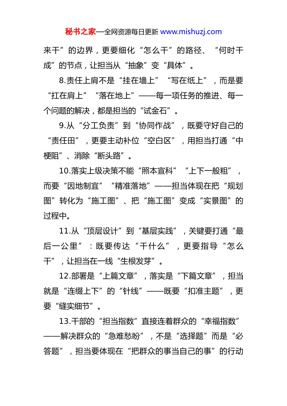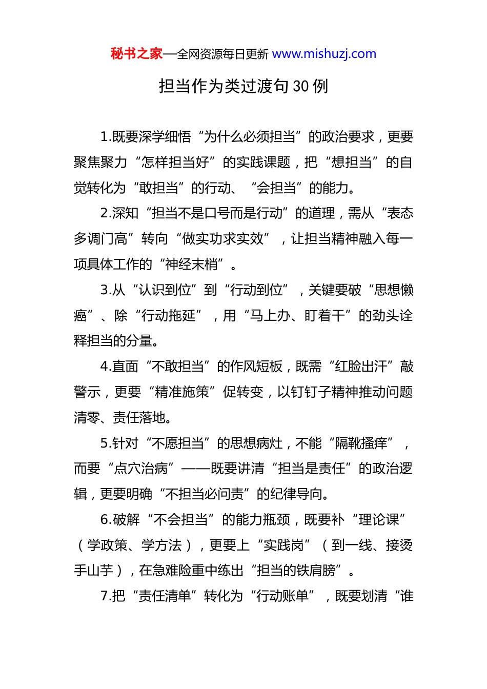 秘书之家—全网资源每日更新 www.mishuzj.com担当作为类过渡句 30 例 1.既要深学细悟“为什么必须担当”的政治要求,更要聚焦聚力“怎样担当好”的实践课题,把“想担当”的自觉转化为“敢担当”的行动、“会担当”的能力。2.深知“担当不是口号而是行动”的道理,需从“表态多调门高”转向“做实功求实效”,让担当精神融入每一项具体工作的“神经末梢”。3.从“认识到位”到“行动到位”,关键要破“思想懒癌”、除“行动拖延”,用“马上办、盯着干”的劲头诠释担当的分量。4.直面“不敢担当”的作风短板,既需“红脸出汗”敲警示,更要“精准施策”促转变,以钉钉子精神推动问题清零、责任落地。5.针对“不愿担当”的思想病灶,不能“隔靴搔痒”,而要“点穴治病”——既要讲清“担当是责任”的政治逻辑,更要明确“不担当必问责”的纪律导向。6.破解“不会担当”的能力瓶颈,既要补“理论课”(学政策、学方法),更要上“实践岗”(到一线、接烫手山芋),在急难险重中练出“担当的铁肩膀”。7.把“责任清单”转化为“行动账单”,既要划清“谁秘书之家—全网资源每日更新 www.mishuzj.com来干”的边界,更要细化“怎么干”的路径、“何时干成”的节点,让担当从“抽象”变“具体”。8.责任上肩不是“挂在墙上”“写在纸上”,而是要“扛在肩上”“落在地上”——每一项任务的推进、每一个问题的解决,都是担当的“试金石”。9.从“分工负责”到“协同作战”,既要守好自己的“责任田”,更要主动补位“空白区”,用担当打通“中梗阻”、消除“断头路”。10.落实上级决策不能“照本宣科”“上下一般粗”,而要“因地制宜”“精准落地”——担当体现在把“规划图”转化为“施工图”、把“施工图”变成“实景图”的过程中。11.从“顶层设计”到“基层实践”,关键要打通“最后一公里”:既要传达“干什么”,更要指导“怎么干”,让担当在一线“生根发芽”。12.部署是“上篇文章”,落实是“下篇文章”,担当就是“连缀上下”的“针线”——既要“扣准主题”,更要“缝实细节”。13.干部的“担当指数”直接连着群众的“幸福指数”——解决群众的“急难愁盼”,不是“选择题”而是“必答题”,担当要体现在“把群众的事当自己的事”的行动秘书之家—全网资源每日更新 www.mishuzj.com里。14.从“群众呼声”到“政策落地”,中间的桥梁是“共情”与“实干”:既要“身入”基层听需求,更要“心入”群众解难题,用担当赢得信任。15.群众看干部,不是看“说了什么”,而是看“干成了什么”——担当就是要让“群众盼的”变成“干部干的”“干部干的”变成“群众赞的”。16.用好“容错纠错”的“护身符”,就是要让“敢担当的人无后顾之忧”“想担当的人有舞台空间”,用正向激励点燃担当的“引擎”。17.把“担当作为”纳入考核“硬指标”,既要看“干了多少”,更要看“干成了多少”;既要看“常规任务”,更要看“急难险重任务”,让考核成为担当的“指挥棒”。18.从“正向激励”到“反向约束”,双管齐下才能治“懒”破“庸”:对“不愿担当”的要“打板子”,对“敢担当”的要“给位子”,让担当成为“主流价值”。19.在“既要保进度、又要保质量、还要保安全”的多重考验中,最能看出干部是否有“担当的铁肩膀”——是“绕道走”还是“迎上去”,高下立判。20.面对“难啃的硬骨头”,担当不是“喊口号”,而秘书之家—全网资源每日更新 www.mishuzj.com是“撸起袖子”“扑下身子”:既要“找方法”,更要“钉钉子”,直到问题解决、任务完成。21.从“常规任务”到“突发挑战”,担当体现在“顶得住压力、扛得起责任、拿得下任务”的行动中——比如疫情防控中的“逆行”、抗洪救灾中的“坚守”。22.跨部门协作不是“简单叠加”,而是“攥指成拳”:既要“各负其责”,更要“主动补位”,用担当打通“信息壁垒”“责任壁垒”,形成“1+1>2”的合力。23.从“各自为战”到“协同发力”,需要每一个环节都有“担当的接力者”——比如项目推进中,发改部门要“牵好头”,财政部门要“保资金”,审批部门要“优服务”。24.区域联动发展要“唱好一盘棋”:既要“唱主角”,更要...