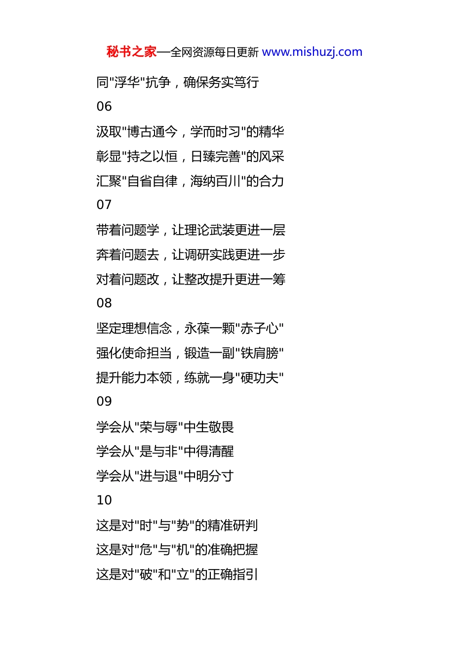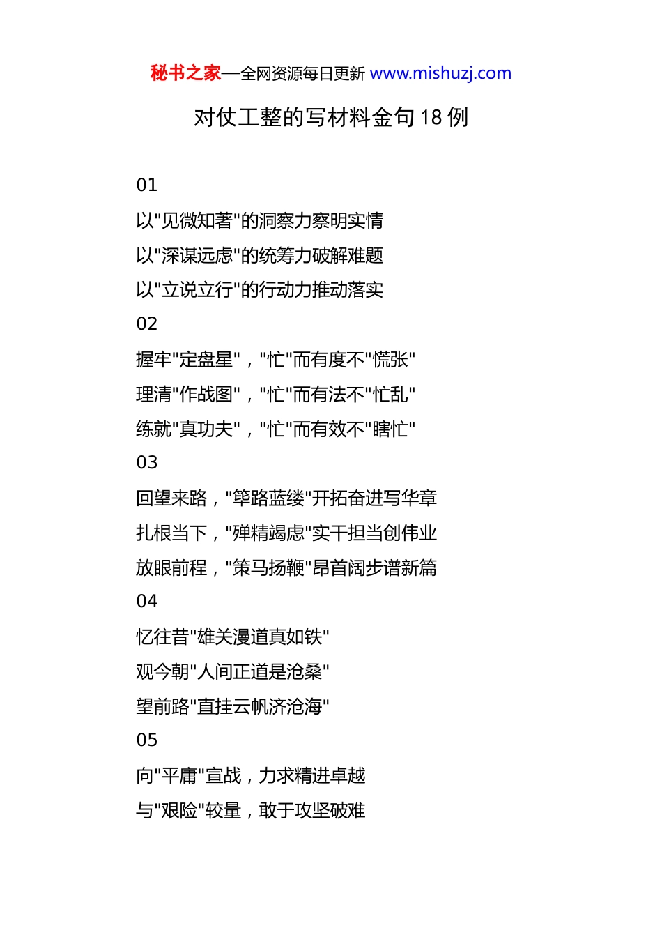 秘书之家—全网资源每日更新 www.mishuzj.com对仗工整的写材料金句 18 例 01以"见微知著"的洞察力察明实情以"深谋远虑"的统筹力破解难题以"立说立行"的行动力推动落实02握牢"定盘星","忙"而有度不"慌张"理清"作战图","忙"而有法不"忙乱"练就"真功夫","忙"而有效不"瞎忙"03回望来路,"筚路蓝缕"开拓奋进写华章扎根当下,"殚精竭虑"实干担当创伟业放眼前程,"策马扬鞭"昂首阔步谱新篇04忆往昔"雄关漫道真如铁"观今朝"人间正道是沧桑"望前路"直挂云帆济沧海"05向"平庸"宣战,力求精进卓越与"艰险"较量,敢于攻坚破难秘书之家—全网资源每日更新 www.mishuzj.com同"浮华"抗争,确保务实笃行06汲取"博古通今,学而时习"的精华彰显"持之以恒,日臻完善"的风采汇聚"自省自律,海纳百川"的合力07带着问题学,让理论武装更进一层奔着问题去,让调研实践更进一步对着问题改,让整改提升更进一筹08坚定理想信念,永葆一颗"赤子心"强化使命担当,锻造一副"铁肩膀"提升能力本领,练就一身"硬功夫"09学会从"荣与辱"中生敬畏学会从"是与非"中得清醒学会从"进与退"中明分寸10这是对"时"与"势"的精准研判这是对"危"与"机"的准确把握这是对"破"和"立"的正确指引秘书之家—全网资源每日更新 www.mishuzj.com11以学固本,深入钻研,提升了理论素养以干强本,踏实做事,完成了目标任务以严治本,慎独慎微,树立了清廉形象12努力拉高标杆线,把好学习关不断注入新动力,把好执行关用心织密防护网,把好作风关13奏响开放融合的"协奏曲",共建新平台奏响创新驱动的"进行曲",共享新机遇奏响绿色发展的"交响曲",共创新未来14"优势减弱、竞争激烈"的转型突围期"除旧布新、提质升级"的动能转换期"挑战叠加、风险增多"的矛盾凸显期"负重前行、爬坡过坎"的攻坚关键期15回顾过往,既有成就,也有不足立足当下,既有压力,也有动力展望未来,既有挑战,也有希望秘书之家—全网资源每日更新 www.mishuzj.com16做事要善为,"准"字当头下功夫做事要敢为,"实"字为要求实效做事要有为,"优"字为标惠民生17蓄势聚能,洞悉"局与势"的变化责任在肩,紧系"根与本"的情怀创新破局,打通"旧与新"的关隘纪律如剑,校准"公与正"的航向18常学常思,将"心血"倾在"学"字上尽心尽力,将"真功"下在"干"字上不破不立,将"重点"放在"新"字上慎独慎行,将"焦点"盯在"廉"字上