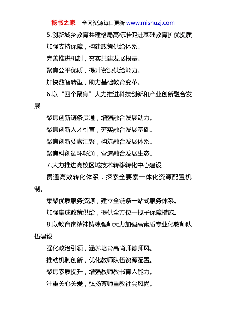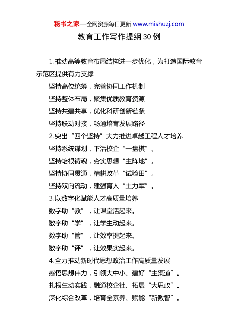 秘书之家—全网资源每日更新 www.mishuzj.com教育工作写作提纲 30 例 1.推动高等教育布局结构进一步优化,为打造国际教育示范区提供有力支撑坚持高位统筹,完善协同工作机制坚持整体布局,聚集优质教育资源坚持共建共享,优化科研创新链条坚持联动对接,畅通培育发展路径2.突出“四个坚持”大力推进卓越工程人才培养坚持系统谋划,下活校企“一盘棋”。坚持培根铸魂,夯实思想“主阵地”。坚持协同贯通,精耕改革“试验田”。坚持双向流动,建强育人“主力军”。3.以数字化赋能人才高质量培养数字助“教”,让课堂活起来。数字助“学”,让学生动起来。数字助“管”,让效率提起来。数字助“评”,让效果实起来。4.全力推动新时代思想政治工作高质量发展感悟思想伟力,引领大中小、建好“主渠道”。扎根生动实践,融通校企社、拓展“大思政”。深化综合改革,培育全素养、赋能“新数智”。秘书之家—全网资源每日更新 www.mishuzj.com5.创新城乡教育共建格局高标准促进基础教育扩优提质加强支持保障,构建政策供给体系。完善推进机制,夯实共建发展根基。聚焦公平优质,提升资源供给能力。加快数智转型,助力基础教育变革。6.以“四个聚焦”大力推进科技创新和产业创新融合发展聚焦创新链条贯通,增强融合发展动力。聚焦创新人才引育,夯实融合发展基础。聚焦创新要素汇聚,构筑融合发展体系。聚焦科创循环畅通,营造融合发展生态。7.大力推进高校区域技术转移转化中心建设贯通高效转化体系,探索全要素一体化资源配置机制。集聚优质服务资源,建立全链条一站式服务体系。加强集成政策供给,提供全方位一揽子保障措施。8.以教育家精神铸魂强师大力加强高素质专业化教师队伍建设强化政治引领,涵养培育高尚师德师风。推动机制创新,优化教师队伍资源配置。聚焦素质提升,增强教师教书育人能力。注重关心关爱,弘扬尊师重教社会风尚。秘书之家—全网资源每日更新 www.mishuzj.com9.多措并举促进高校毕业生高质量充分就业着力优化学科布局,强化供需对接。着力深化产教融合,提高培养质量。着力强化就业指导,提升服务能力。着力扩大岗位供给,拓宽就业渠道。10.“四优四强”大力推进国家平台全域应用试点助力基础教育扩优提质优化领导机制强推进。优化会商机制强统筹。优化支持机制强保障。优化应用机制强质效。11.聚焦基础教育扩优提质健全完善教育公共服务体系强化体系构建,在提升普惠性上务实功。强化改革创新,在提升可及性上出实招。强化数智赋能,在提升便捷性上求实效。12.统筹推进教育科技人才体制机制一体改革加快建设教育强省聚焦提升人才自主培养能力,推动教育链与人才链精准对接。聚焦支撑高水平科技自立自强,推动教育链与创新链精准对接。聚焦提升服务经济社会发展能力,推动教育链与产业秘书之家—全网资源每日更新 www.mishuzj.com链精准对接。13.深化大中小学思政教育一体化建设抓组织统筹,构建“一体化”思政育人格局。抓载体联动,打造“一盘棋”思政育人阵地。抓模式创新,探索“一条链”思政育人体系。14.突出交叉融合推动学科群协同发展聚焦交叉融合特点,优化学科群布局结构。释放交叉融合活力,催生学科群效能产出。发挥交叉融合优势,打造学科群人才高地。深化交叉融合改革,提升学科群育人实效。15.“四链同构”积极服务新能源高质量发展突出超前布局,构建交叉融合的新能源学科链。突出多维协同,构建高精尖缺的新能源人才链。突出战略导向,构建系统集成的新能源创新链。突出精准施策,构建保障有力的新能源转化链。16.聚焦“四力”全面深化科技创新夯实自主创新根基,增强科技创新策源力。对接国家重大战略,加大科技创新协同力。打造发展强力引擎,提升科技创新贡献力。深化科研体制改革,激发科技创新内驱力。17.坚持“四个深耕”持续构建金融自主知识体系深耕理论研究阐释,筑牢自主知识体系根基。秘书之家—全网资源每日更新 www.mishuzj.com深耕学科体系建设,推动自主知识体系创新。深耕学术体系建设,突出自主知识体系特色。深耕话语体系建设,优化自主知识体系传播。18.实施“五大工程”加强有组织科研实施自主知识体系创新工程。实...