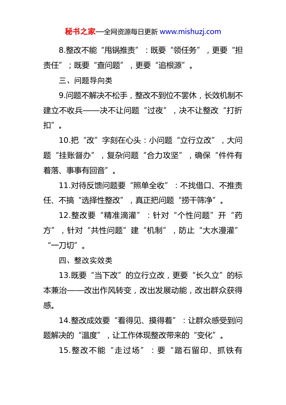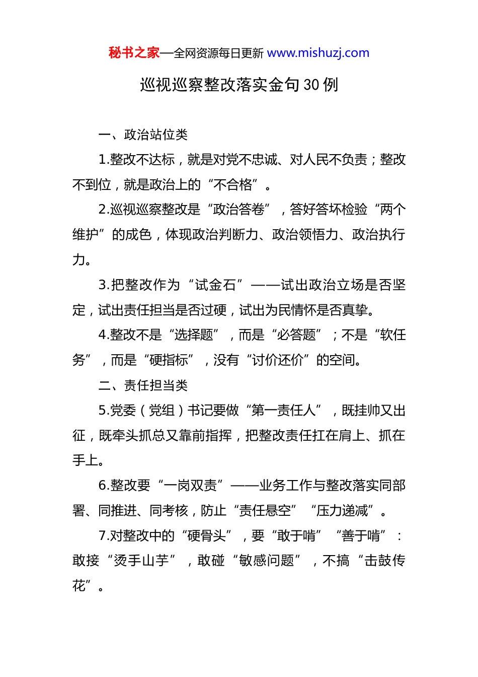 秘书之家—全网资源每日更新 www.mishuzj.com巡视巡察整改落实金句 30 例 一、政治站位类1.整改不达标,就是对党不忠诚、对人民不负责;整改不到位,就是政治上的“不合格”。2.巡视巡察整改是“政治答卷”,答好答坏检验“两个维护”的成色,体现政治判断力、政治领悟力、政治执行力。3.把整改作为“试金石”——试出政治立场是否坚定,试出责任担当是否过硬,试出为民情怀是否真挚。4.整改不是“选择题”,而是“必答题”;不是“软任务”,而是“硬指标”,没有“讨价还价”的空间。二、责任担当类5.党委(党组)书记要做“第一责任人”,既挂帅又出征,既牵头抓总又靠前指挥,把整改责任扛在肩上、抓在手上。6.整改要“一岗双责”——业务工作与整改落实同部署、同推进、同考核,防止“责任悬空”“压力递减”。7.对整改中的“硬骨头”,要“敢于啃”“善于啃”:敢接“烫手山芋”,敢碰“敏感问题”,不搞“击鼓传花”。秘书之家—全网资源每日更新 www.mishuzj.com8.整改不能“甩锅推责”:既要“领任务”,更要“担责任”;既要“查问题”,更要“追根源”。三、问题导向类9.问题不解决不松手,整改不到位不罢休,长效机制不建立不收兵——决不让问题“过夜”,决不让整改“打折扣”。10.把“改”字刻在心头:小问题“立行立改”,大问题“挂账督办”,复杂问题“合力攻坚”,确保“件件有着落、事事有回音”。11.对待反馈问题要“照单全收”:不找借口、不推责任、不搞“选择性整改”,真正把问题“捞干筛净”。12.整改要“精准滴灌”:针对“个性问题”开“药方”,针对“共性问题”建“机制”,防止“大水漫灌”“一刀切”。四、整改实效类13.既要“当下改”的立行立改,更要“长久立”的标本兼治——改出作风转变,改出发展动能,改出群众获得感。14.整改成效要“看得见、摸得着”:让群众感受到问题解决的“温度”,让工作体现整改带来的“变化”。15.整改不能“走过场”:要“踏石留印、抓铁有秘书之家—全网资源每日更新 www.mishuzj.com痕”,不能“做做样子、摆摆姿态”;要“见真章”,不能“玩虚招”。16.把整改与日常工作结合起来:做到“两手抓、两不误、两促进”,用工作成效检验整改实效。五、长效机制类17.长效机制要“接地气”:不能“写在纸上、挂在墙上、锁在抽屉里”,要“可操作、可监督、可问责”。18.以整改促“破立”:破除“旧思维”“老习惯”,建立“新制度”“好机制”,从源头上杜绝问题反弹。19.把整改成果“固化成制”:将“点上经验”转化为“面上制度”,让“一时之效”变为“长久之功”。20.长效机制要“动态调整”:根据形势变化、问题演进及时“修修补补”,防止“制度过期”“机制失效”。六、群众评判类21.整改好不好,群众说了算;问题解决没解决,群众来打分——把群众满意度作为整改的“最终标尺”。22.整改要“开门纳谏”:让群众参与、让群众监督、让群众评价,防止“内部循环”“自说自话”。23.把整改成效体现在“群众急难愁盼”上:解决好教育、医疗、养老等民生痛点,让群众感受到“整改带来的变化”。秘书之家—全网资源每日更新 www.mishuzj.com七、作风要求类24.整改要“全程留痕”:每一个问题都有“台账”,每一项措施都有“记录”,每一步进展都有“轨迹”,确保“可追溯、可核查”。25.克服“整改疲劳症”:防止“刚开始热热闹闹、中后期冷冷清清”,保持“一抓到底”的韧劲。26.整改要“见人见事见细节”:不搞“大而化之、泛泛而谈”,要“精准到事、具体到人”,让问题“无处藏身”。八、联动推进类27.整改要“上下联动”:上级党委要“督”,下级单位要“改”,部门之间要“协同”,防止“各自为战”“推诿扯皮”。28.把整改与巡视巡察“回头看”结合起来:既查“老问题”是否反弹,又查“新问题”是否滋生,形成“闭环管理”。九、结果运用类29.以整改促“治未病”:通过整改发现制度漏洞、管理短板,提前防范“同类问题”再次发生。30.把整改成效纳入“政绩考核”:对整改有力的表扬激励,对整改不力的严肃问责,树立“奖优罚劣”的鲜明秘书之家—全网资源每日更新 www.mishuzj.com导向。