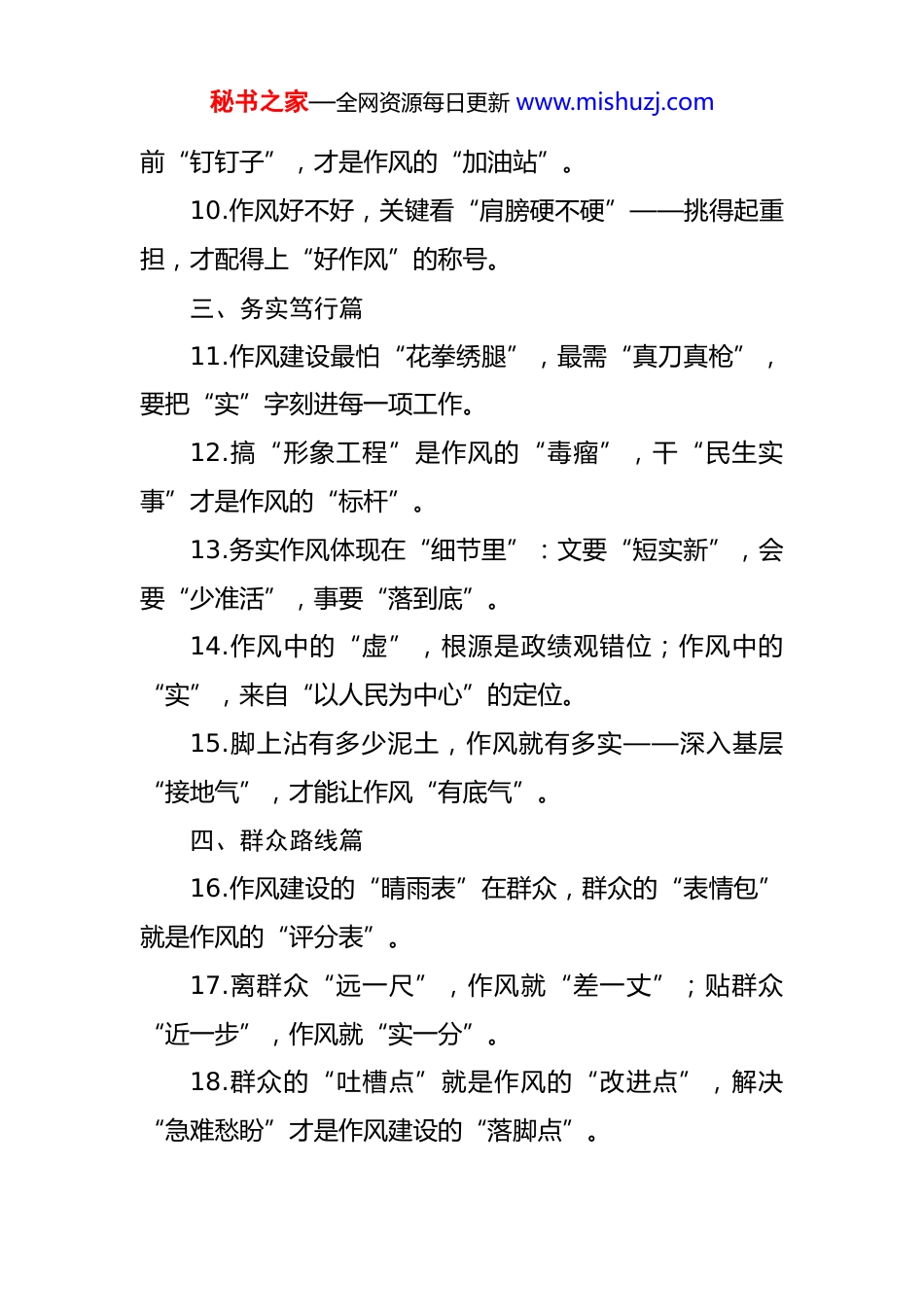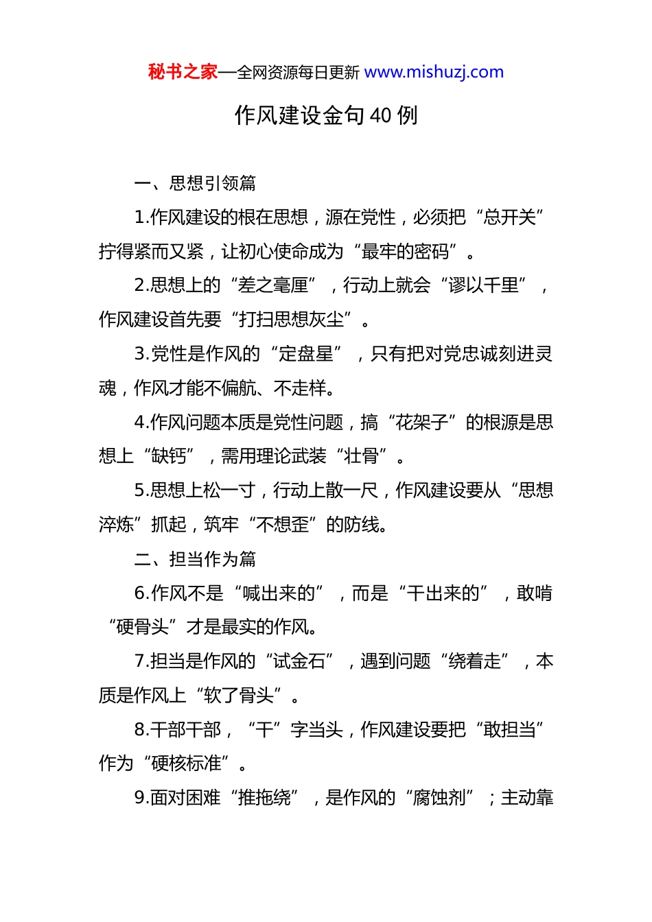 秘书之家—全网资源每日更新 www.mishuzj.com作风建设金句 40 例 一、思想引领篇1.作风建设的根在思想,源在党性,必须把“总开关”拧得紧而又紧,让初心使命成为“最牢的密码”。2.思想上的“差之毫厘”,行动上就会“谬以千里”,作风建设首先要“打扫思想灰尘”。3.党性是作风的“定盘星”,只有把对党忠诚刻进灵魂,作风才能不偏航、不走样。4.作风问题本质是党性问题,搞“花架子”的根源是思想上“缺钙”,需用理论武装“壮骨”。5.思想上松一寸,行动上散一尺,作风建设要从“思想淬炼”抓起,筑牢“不想歪”的防线。二、担当作为篇6.作风不是“喊出来的”,而是“干出来的”,敢啃“硬骨头”才是最实的作风。7.担当是作风的“试金石”,遇到问题“绕着走”,本质是作风上“软了骨头”。8.干部干部,“干”字当头,作风建设要把“敢担当”作为“硬核标准”。9.面对困难“推拖绕”,是作风的“腐蚀剂”;主动靠秘书之家—全网资源每日更新 www.mishuzj.com前“钉钉子”,才是作风的“加油站”。10.作风好不好,关键看“肩膀硬不硬”——挑得起重担,才配得上“好作风”的称号。三、务实笃行篇11.作风建设最怕“花拳绣腿”,最需“真刀真枪”,要把“实”字刻进每一项工作。12.搞“形象工程”是作风的“毒瘤”,干“民生实事”才是作风的“标杆”。13.务实作风体现在“细节里”:文要“短实新”,会要“少准活”,事要“落到底”。14.作风中的“虚”,根源是政绩观错位;作风中的“实”,来自“以人民为中心”的定位。15.脚上沾有多少泥土,作风就有多实——深入基层“接地气”,才能让作风“有底气”。四、群众路线篇16.作风建设的“晴雨表”在群众,群众的“表情包”就是作风的“评分表”。17.离群众“远一尺”,作风就“差一丈”;贴群众“近一步”,作风就“实一分”。18.群众的“吐槽点”就是作风的“改进点”,解决“急难愁盼”才是作风建设的“落脚点”。秘书之家—全网资源每日更新 www.mishuzj.com19.作风好不好,问问“田间汉”;政策实不实,听听“家常话”——群众的声音是作风的“校准仪”。20.把“群众满不满意”作为作风的“最终评判”,才能让作风建设“不走过场”。五、廉洁自律篇21.作风建设的“底线”是廉洁,触碰“红线”的作风,再“花哨”也没用。22.廉洁是作风的“护身符”,搞“特权”“谋私利”,就是作风上“破了防”。23. 作 风 中 的 “ 贪 ” , 始 于 “ 小 便 宜 ” ; 廉 洁 的“堤”,要从“微末处”筑牢。24.正作风先正“家风”,家风严则作风正,家风松则作风散。25.廉洁作风不是“约束”,而是“保护”——守住“底线”,才能守住“政治生命”。六、持之以恒篇26.作风建设不是“一阵风”,而是“四季风”,要常抓不懈、久久为功。27.纠治作风问题不能“抓一阵歇一阵”,需用“钉钉子精神”抓到底。28.作风建设“永远在路上”,松一松就会“反弹回秘书之家—全网资源每日更新 www.mishuzj.com潮”,紧一紧才能“标本兼治”。29.解决作风问题要“常态化”:既要“打攻坚战”,也要“打持久战”。30.作风建设不能“毕其功于一役”,需“日日做功”“月月打磨”,才能成“风气”。七、精准纠治篇31.作风问题要“精准施策”,搞“一刀切”只会“治表不治本”。32.纠治“形式主义”,要瞄准“层层加码”的病灶;整治“官僚主义”,要剑指“脱离群众”的根源。33.作风问题的“变种”需“火眼金睛”:“指尖上的形式主义”“文字里的官僚主义”,都是纠治重点。34.精准纠治作风,要“靶向治疗”——哪里有“痛点”,就往哪里“下针”。35.作风建设要“精准画像”:针对不同岗位、不同领域的作风问题,制定“个性化”整改方案。八、以上率下篇36.作风建设要“头雁领航”,领导干部“带头干”,下面才能“跟着拼”。37.领导干部的“作风样态”,是干部队伍的“风向标”——自己“摆架子”,下属就会“搞形式”。秘书之家—全网资源每日更新 www.mishuzj.com38.“一把手”作风硬,班子就会“作风实”;班子作风实,队伍就会“作风强”。39.领导干部要做“作风标杆”:要求别人做到的,自己先做到;禁止别人做的,自己先不做。40.以上率下是作风建设的“加速器”——领导干部“靠前站”,作风转变就会“快一步”。