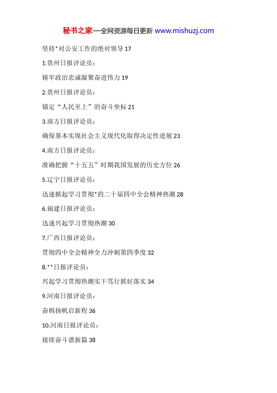秘书之家—全网资源每日更新 www.mishuzj.com(55 篇)学习贯彻*的二十届四中全会精神素材汇编(55 篇)学习贯彻*的二十届四中全会精神素材汇编目录一、全会公报1.中国共产*第二十届中央委员会第四次全体会议公报 1二、评论员文章2.人民日报评论员:接续奋斗,确保基本实现社会主义现代化取得决定性进展 73.经济日报评论员:立足四个优势增强必胜信心 94.经济日报评论员:坚定不移推动高质量发展 115.学习时报评论员哲思:把宏伟蓝图变为美好现实 136.人民公安报评论员: 迅速掀起学习贯彻四中全会精神热潮凝聚力量接续奋斗推动高质量展…157.人民公安报评论员:秘书之家—全网资源每日更新 www.mishuzj.com坚持*对公安工作的绝对领导 171.贵州日报评论员:铸牢政治忠诚凝聚奋进伟力 192.贵州日报评论员:锚定“人民至上”的奋斗坐标 213.南方日报评论员:确保基本实现社会主义现代化取得决定性进展 234.南方日报评论员:准确把握“十五五”时期我国发展的历史方位 265.辽宁日报评论员:迅速掀起学习贯彻*的二十届四中全会精神热潮 286.福建日报评论员:迅速兴起学习贯彻热潮 307.广西日报评论员:贯彻四中全会精神全力冲刺第四季度 328.**日报评论员:兴起学习贯彻热潮实干笃行抓好落实 349.河南日报评论员:奋楫扬帆启新程 3610.河南日报评论员:接续奋斗谱新篇 38秘书之家—全网资源每日更新 www.mishuzj.com三、强烈反应和热议文章11.江西省直单位*员干部认真学习贯彻*的二十届四中全会精神 4012.*的二十届四中全会精神在重庆市广大*员干部群众中引发热烈反响…4313.广东社会各界干部群众学习贯彻落实*的二十届四中全会精神 4714.*的二十届四中全会精神在区直机关*员干部群众中引发热烈反响……5115.云南省各地干部群众认真学习*的二十届四中全会精神 5416.*的二十届四中全会精神在甘肃省干部群众中引发热烈反响 5817.*的二十届四中全会精神在江苏省级机关引发热烈反响 6018.*的二十届四中全会在吉林省引发热烈反响 6419.*的二十届四中全会精神在长沙市*员干部中引发热烈反响 6720.*的二十届四中全会在西安市引起热烈反响 7321.*的二十届四中全会精神在济南广大*员干部群众中引发热烈反响……7622.*的二十届四中全会在合肥广大*员干部群众中引发热烈反响 8023.*的二十届四中全会精神在南通市机关*员干部中引发热烈反响 82四、心得体会24.鄂伦春自治旗法院学习贯彻*的二十届四中全会精神心得体会汇编……8625.重庆无*派人士学习贯彻*的二十届四中全会精神心得体会汇编…秘书之家—全网资源每日更新 www.mishuzj.com……8926.天津民建区级组织领导谈体会学习二十届四中全会精神心得体会汇编…9527.民革上海市委会理论学习中心组成员谈学习全会精神体会汇编10128.学习中共二十届四中全会精神湖北民进会员谈心得体会汇编 10429.施乾平:学习中共二十届四中全会精神感受 10730.殷建光:强大文化“四力”扎实推进文化强国建设 10931.中央*校中国式现代化研究中心主任张占斌:奋力开创中国式现代化建设新局面 11232.广州市社会科学院现代产业研究所副所长、研究员**:建设现代化产业体系积极贡献广州力量 11433.广州实验室研究员施一:勇于探索大胆创新力争关键技术取得关键突破 11534.云蝶科技总裁田雪松:以协同合作激发市场活力积极融入经济发展大局 11635.增城区正果镇*委书记钟灼坤:抢抓引领区建设机遇推动农文旅融合高质量发展 11736.广州市博物馆协会会长、广州博物馆馆长吴凌云:秘书之家—全网资源每日更新 www.mishuzj.com讲好中国人的精彩故事用文化的力量影响世界 11837.越秀区洪桥街道办事处主任王飞:加大保障和改善民生力度提高居民生活品质 11938.陈康:用“为民”情怀交出人民满意答卷 12039.罗建华:擦亮为民底色书写“发展向前民生向暖”精彩答卷 12240.郭元鹏:奔向绚丽多彩的“下一个五年”的新目标 12441.罗建华:“五年规划”尽显“中国之治”制度优势 12642.财政部*校第 81 期处级干部进修班深入学习领会全会精神……12843.新余市工商联副主席、江西赣西教育集团董事长艾磊华:学习贯彻*的二十届四中全...