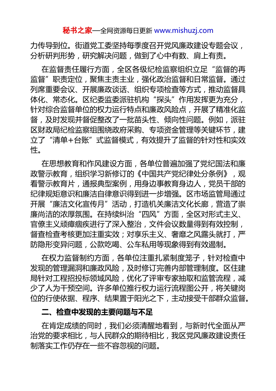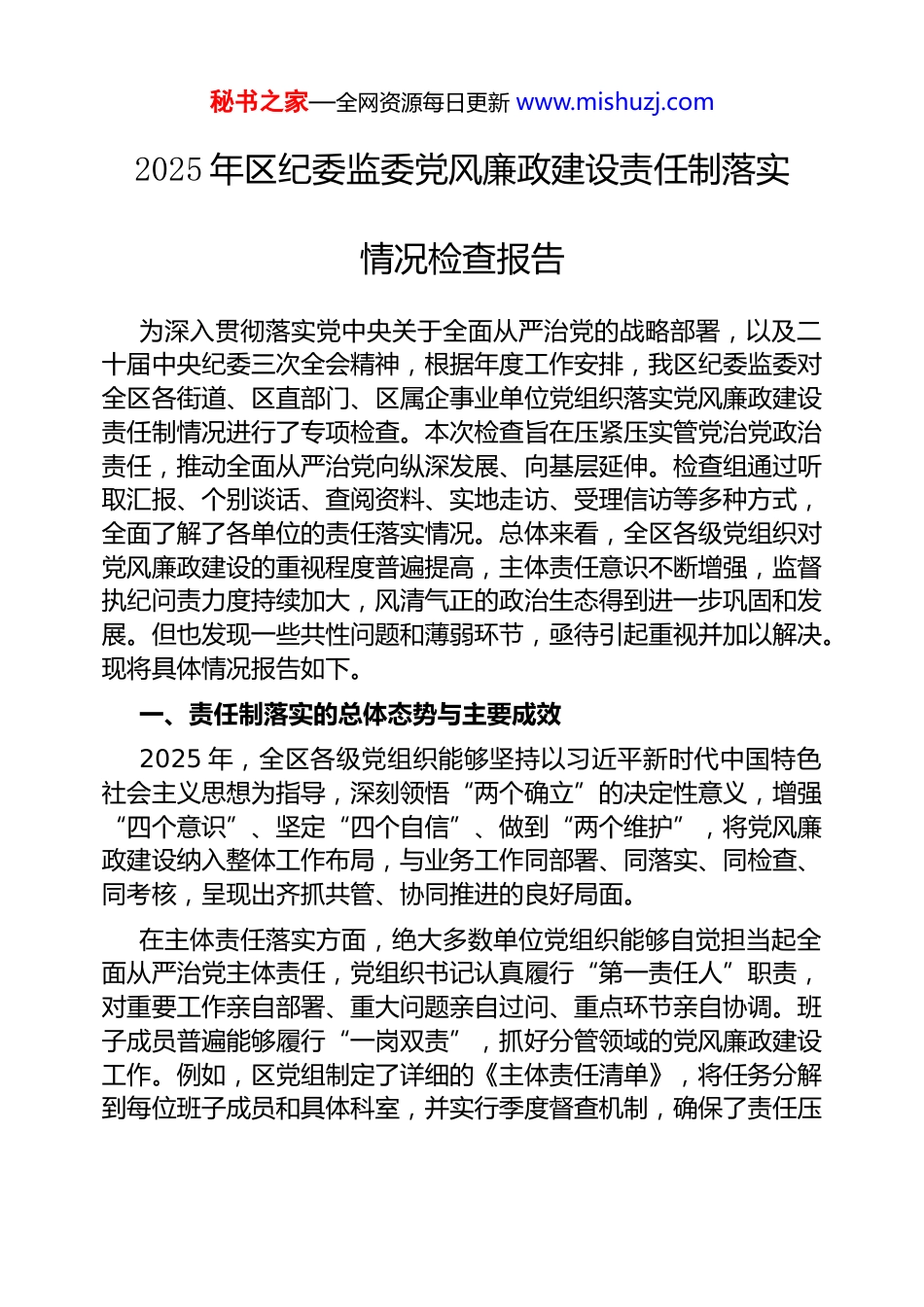 秘书之家—全网资源每日更新 www.mishuzj.com2025 年区纪委监委党风廉政建设责任制落实情况检查报告为深入贯彻落实党中央关于全面从严治党的战略部署,以及二十届中央纪委三次全会精神,根据年度工作安排,我区纪委监委对全区各街道、区直部门、区属企事业单位党组织落实党风廉政建设责任制情况进行了专项检查。本次检查旨在压紧压实管党治党政治责任,推动全面从严治党向纵深发展、向基层延伸。检查组通过听取汇报、个别谈话、查阅资料、实地走访、受理信访等多种方式,全面了解了各单位的责任落实情况。总体来看,全区各级党组织对党风廉政建设的重视程度普遍提高,主体责任意识不断增强,监督执纪问责力度持续加大,风清气正的政治生态得到进一步巩固和发展。但也发现一些共性问题和薄弱环节,亟待引起重视并加以解决。现将具体情况报告如下。一、责任制落实的总体态势与主要成效2025 年,全区各级党组织能够坚持以习近平新时代中国特色社会主义思想为指导,深刻领悟“两个确立”的决定性意义,增强“四个意识”、坚定“四个自信”、做到“两个维护”,将党风廉政建设纳入整体工作布局,与业务工作同部署、同落实、同检查、同考核,呈现出齐抓共管、协同推进的良好局面。在主体责任落实方面,绝大多数单位党组织能够自觉担当起全面从严治党主体责任,党组织书记认真履行“第一责任人”职责,对重要工作亲自部署、重大问题亲自过问、重点环节亲自协调。班子成员普遍能够履行“一岗双责”,抓好分管领域的党风廉政建设工作。例如,区党组制定了详细的《主体责任清单》,将任务分解到每位班子成员和具体科室,并实行季度督查机制,确保了责任压秘书之家—全网资源每日更新 www.mishuzj.com力传导到位。街道党工委坚持每季度召开党风廉政建设专题会议,分析研判形势,研究解决问题,做到了心中有数、肩上有责。在监督责任履行方面,全区各级纪检监察组织立足“监督的再监督”职责定位,聚焦主责主业,强化政治监督和日常监督。通过列席重要会议、开展廉政谈话、组织专项检查等方式,推动监督具体化、常态化。区纪委监委派驻机构“探头”作用发挥更为充分,针对综合监督单位的权力运行特点和廉政风险点,开展了精准化监督,及时发现并督促整改了一批苗头性、倾向性问题。例如,派驻区财政局纪检监察组围绕政府采购、专项资金管理等关键环节,建立了“清单+台账”式监督模式,有效提升了监督的针对性和实效性。在思想教育和作风建设方面,各单位普遍加强了党纪国法和廉政警示教育,组织学习新修订的《中国共产党纪律处分条例》,观看警示教育片,通报典型案例,用身边事教育身边人,党员干部的纪律规矩意识和廉洁自律意识得到进一步增强。区市场监管局通过开展“廉洁文化宣传月”活动,打造机关廉洁文化长廊,营造了崇廉尚洁的浓厚氛围。在持续纠治“四风”方面,全区对形式主义、官僚主义顽瘴痼疾进行了深入整治,文件会议数量得到有效控制,督查检查考核更加注重实效;对享乐主义、奢靡之风露头就打,严防隐形变异问题,公款吃喝、公车私用等现象得到有效遏制。在权力监督制约方面,各单位注重扎紧制度笼子,针对检查中发现的管理漏洞和廉政风险,及时修订完善内部管理制度。区住建局针对工程招投标领域风险,优化了评审专家抽取和监管流程,减少了人为干预空间。许多单位推行权力运行流程图公开,将关键岗位的行使依据、程序、结果置于阳光之下,主动接受干部群众监督。二、检查中发现的主要问题与不足在肯定成绩的同时,我们必须清醒地看到,与新时代全面从严治党的要求相比,与人民群众的期待相比,我区党风廉政建设责任制落实工作仍存在一些不容忽视的问题。秘书之家—全网资源每日更新 www.mishuzj.com一是主体责任压力传导存在“上热中温下冷”现象。 部分区直部门的下属事业单位、基层站所以及街道社区的党组织,对党风廉政建设的重要性认识依然不足,存在“说起来重要、做起来次要”的倾向。有的单位落实责任停留在开会、发文层面,缺乏针对性和有效抓手,责任压力未能有效传导至“神经末梢”。“第一责任人”职责履行不够到位,有的党组织书记对班子成员和下级干部的...