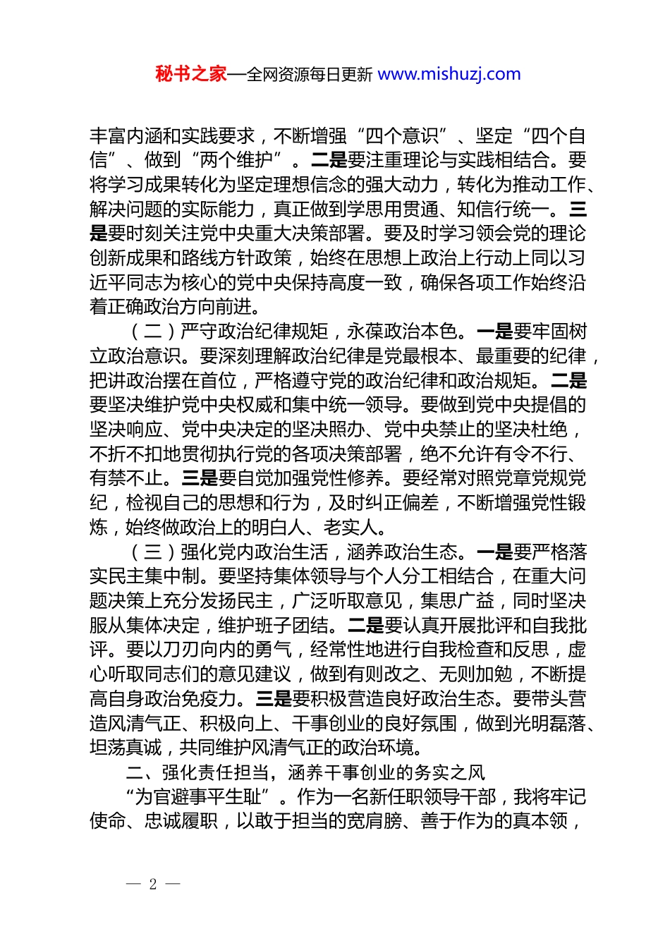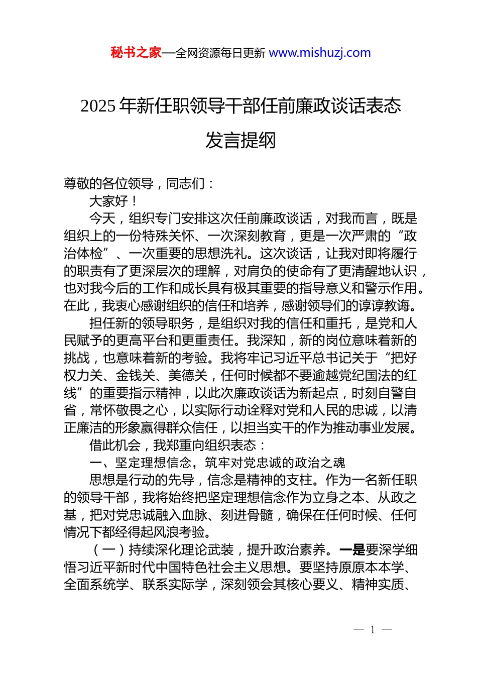 秘书之家—全网资源每日更新 www.mishuzj.com2025 年新任职领导干部任前廉政谈话表态发言提纲尊敬的各位领导,同志们:大家好!今天,组织专门安排这次任前廉政谈话,对我而言,既是组织上的一份特殊关怀、一次深刻教育,更是一次严肃的“政治体检”、一次重要的思想洗礼。这次谈话,让我对即将履行的职责有了更深层次的理解,对肩负的使命有了更清醒地认识,也对我今后的工作和成长具有极其重要的指导意义和警示作用。在此,我衷心感谢组织的信任和培养,感谢领导们的谆谆教诲。担任新的领导职务,是组织对我的信任和重托,是党和人民赋予的更高平台和更重责任。我深知,新的岗位意味着新的挑战,也意味着新的考验。我将牢记习近平总书记关于“把好权力关、金钱关、美德关,任何时候都不要逾越党纪国法的红线”的重要指示精神,以此次廉政谈话为新起点,时刻自警自省,常怀敬畏之心,以实际行动诠释对党和人民的忠诚,以清正廉洁的形象赢得群众信任,以担当实干的作为推动事业发展。借此机会,我郑重向组织表态:一、坚定理想信念,筑牢对党忠诚的政治之魂思想是行动的先导,信念是精神的支柱。作为一名新任职的领导干部,我将始终把坚定理想信念作为立身之本、从政之基,把对党忠诚融入血脉、刻进骨髓,确保在任何时候、任何情况下都经得起风浪考验。(一)持续深化理论武装,提升政治素养。一是要深学细悟习近平新时代中国特色社会主义思想。要坚持原原本本学、全面系统学、联系实际学,深刻领会其核心要义、精神实质、— 1 —秘书之家—全网资源每日更新 www.mishuzj.com丰富内涵和实践要求,不断增强“四个意识”、坚定“四个自信”、做到“两个维护”。二是要注重理论与实践相结合。要将学习成果转化为坚定理想信念的强大动力,转化为推动工作、解决问题的实际能力,真正做到学思用贯通、知信行统一。三是要时刻关注党中央重大决策部署。要及时学习领会党的理论创新成果和路线方针政策,始终在思想上政治上行动上同以习近平同志为核心的党中央保持高度一致,确保各项工作始终沿着正确政治方向前进。(二)严守政治纪律规矩,永葆政治本色。一是要牢固树立政治意识。要深刻理解政治纪律是党最根本、最重要的纪律,把讲政治摆在首位,严格遵守党的政治纪律和政治规矩。二是要坚决维护党中央权威和集中统一领导。要做到党中央提倡的坚决响应、党中央决定的坚决照办、党中央禁止的坚决杜绝,不折不扣地贯彻执行党的各项决策部署,绝不允许有令不行、有禁不止。三是要自觉加强党性修养。要经常对照党章党规党纪,检视自己的思想和行为,及时纠正偏差,不断增强党性锻炼,始终做政治上的明白人、老实人。(三)强化党内政治生活,涵养政治生态。一是要严格落实民主集中制。要坚持集体领导与个人分工相结合,在重大问题决策上充分发扬民主,广泛听取意见,集思广益,同时坚决服从集体决定,维护班子团结。二是要认真开展批评和自我批评。要以刀刃向内的勇气,经常性地进行自我检查和反思,虚心听取同志们的意见建议,做到有则改之、无则加勉,不断提高自身政治免疫力。三是要积极营造良好政治生态。要带头营造风清气正、积极向上、干事创业的良好氛围,做到光明磊落、坦荡真诚,共同维护风清气正的政治环境。二、强化责任担当,涵养干事创业的务实之风“为官避事平生耻”。作为一名新任职领导干部,我将牢记使命、忠诚履职,以敢于担当的宽肩膀、善于作为的真本领,— 2 —秘书之家—全网资源每日更新 www.mishuzj.com全身心投入到为党和人民的事业奋斗中去。(一)牢记宗旨意识,践行初心使命。一是要始终坚持以人民为中心的发展思想。要深入基层、深入群众,倾听民声、了解民意,把群众的呼声作为第一信号,把群众的需求作为第一选择,把群众满意作为第一标准。二是要着力解决群众急难愁盼问题。要时刻把群众的安危冷暖放在心上,对涉及群众切身利益的突出问题,要积极主动作为,想方设法解决,努力让人民群众有更多的获得感、幸福感、安全感。三是要自觉接受人民监督。要始终把自己置于党组织和人民群众的监督之下,虚心听取各方面的意见和批评,以实际行动赢得群众的信...