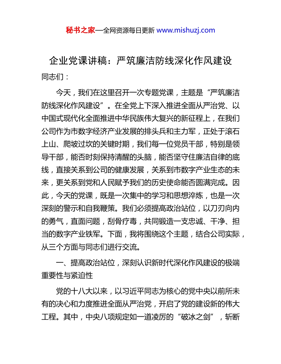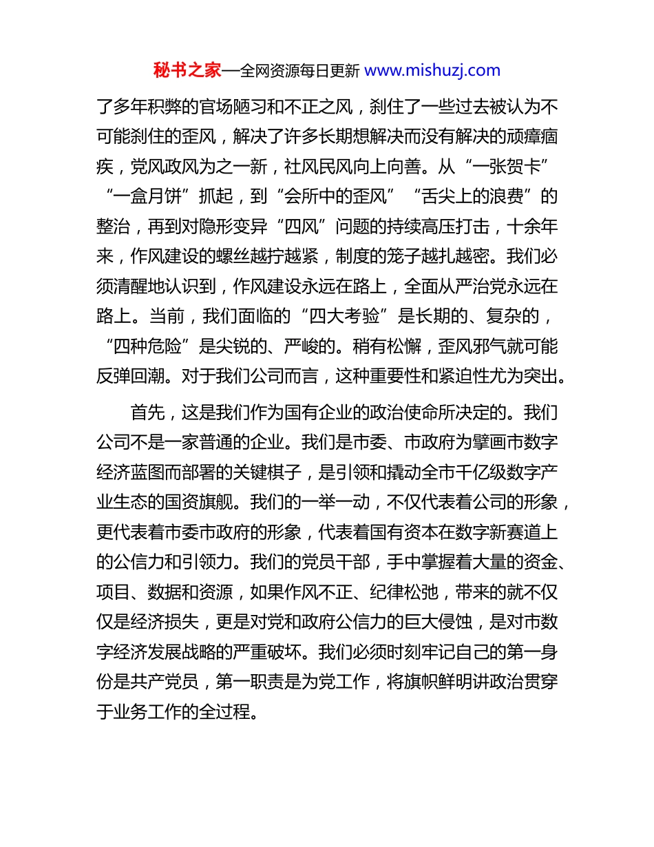 秘书之家—全网资源每日更新 www.mishuzj.com企业党课讲稿:严筑廉洁防线深化作风建设同志们:今天,我们在这里召开一次专题党课,主题是“严筑廉洁防线深化作风建设”。在全党上下深入推进全面从严治党、以中国式现代化全面推进中华民族伟大复兴的新征程上,在我们公司作为市数字经济产业发展的排头兵和主力军,正处于滚石上山、爬坡过坎的关键时期,我们每一位党员干部,特别是领导干部,能否时刻保持清醒的头脑,能否坚守住廉洁自律的底线,直接关系到公司的健康发展,关系到市数字产业生态的未来,更关系到党和人民赋予我们的历史使命能否圆满完成。因此,今天的党课,既是一次集中的学习和思想淬炼,也是一次深刻的警示和自我鞭策。我们必须提高政治站位,以刀刃向内的勇气,直面问题,刮骨疗毒,共同锻造一支忠诚、干净、担当的数字产业铁军。下面,我将围绕这个主题,结合公司实际,从三个方面与同志们进行交流。一、提高政治站位,深刻认识新时代深化作风建设的极端重要性与紧迫性党的十八大以来,以习近平同志为核心的党中央以前所未有的决心和力度推进全面从严治党,开启了党的建设新的伟大工程。其中,中央八项规定如一道凌厉的“破冰之剑”,斩断秘书之家—全网资源每日更新 www.mishuzj.com了多年积弊的官场陋习和不正之风,刹住了一些过去被认为不可能刹住的歪风,解决了许多长期想解决而没有解决的顽瘴痼疾,党风政风为之一新,社风民风向上向善。从“一张贺卡”“一盒月饼”抓起,到“会所中的歪风”“舌尖上的浪费”的整治,再到对隐形变异“四风”问题的持续高压打击,十余年来,作风建设的螺丝越拧越紧,制度的笼子越扎越密。我们必须清醒地认识到,作风建设永远在路上,全面从严治党永远在路上。当前,我们面临的“四大考验”是长期的、复杂的,“四种危险”是尖锐的、严峻的。稍有松懈,歪风邪气就可能反弹回潮。对于我们公司而言,这种重要性和紧迫性尤为突出。首先,这是我们作为国有企业的政治使命所决定的。我们公司不是一家普通的企业。我们是市委、市政府为擘画市数字经济蓝图而部署的关键棋子,是引领和撬动全市千亿级数字产业生态的国资旗舰。我们的一举一动,不仅代表着公司的形象,更代表着市委市政府的形象,代表着国有资本在数字新赛道上的公信力和引领力。我们的党员干部,手中掌握着大量的资金、项目、数据和资源,如果作风不正、纪律松弛,带来的就不仅仅是经济损失,更是对党和政府公信力的巨大侵蚀,是对市数字经济发展战略的严重破坏。我们必须时刻牢记自己的第一身份是共产党员,第一职责是为党工作,将旗帜鲜明讲政治贯穿于业务工作的全过程。秘书之家—全网资源每日更新 www.mishuzj.com其次,这是我们所处行业领域的特殊风险所决定的。我们身处数字产业这一新兴领域,技术迭代快,商业模式新,资本流动密集。与传统行业相比,我们面临的廉洁风险也呈现出新的特点。过去,腐败可能是看得见的工程回扣、摸得着的烟酒礼品。而在数字经济时代,腐败的形式可能变得更加隐蔽和复杂。它可以是数据资源的不当倾斜,可以是算法模型中的人为偏好,可以是利用信息不对称进行的内幕交易,甚至可以是一次看似平常的技术合作、一次“免费”的增值服务。这些新型的、智能化的手段,迷惑性更强,甄别难度更大。如果我们还用老眼光看待新问题,满足于“不拿群众一针一线”的朴素认知,就可能在不知不觉中触碰红线、滑入深渊。因此,我们必须与时俱进,深入研究数字产业的廉洁风险点,构筑起与之相适应的“防火墙”和“隔离带”。最后,这是实现公司高质量发展的内在要求所决定的。作风就是战斗力,纪律就是生命线。一个纪律严明、作风过硬的团队,才能有强大的凝聚力和执行力。反之,如果一个组织内部形式主义、官僚主义盛行,人人满足于“把说了当做了,把做了当做好了”,工作推诿扯皮,决策久拖不议;如果享乐主义、奢靡之风抬头,大家心思不在工作上,而是比待遇、比享受、铺张浪费,那么这个组织必然人心涣散,毫无战斗力可言。我们当前正肩负着建设**市“城市大脑”、运营“东数西算”枢纽节点核心区、打造数字资产交易平台等一系列艰巨任务。...