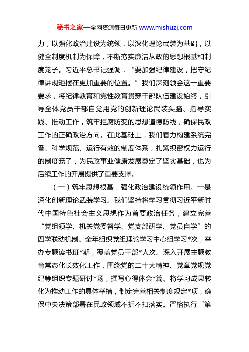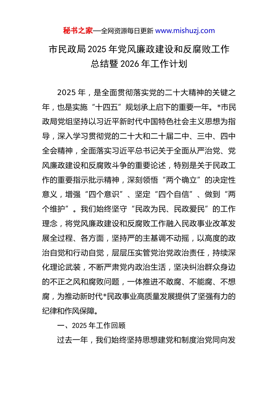 秘书之家—全网资源每日更新 www.mishuzj.com市民政局 2025 年党风廉政建设和反腐败工作总结暨 2026 年工作计划 2025 年,是全面贯彻落实党的二十大精神的关键之年,也是实施“十四五”规划承上启下的重要一年。*市民政局党组坚持以习近平新时代中国特色社会主义思想为指导,深入学习贯彻党的二十大和二十届二中、三中、四中全会精神,全面落实习近平总书记关于全面从严治党、党风廉政建设和反腐败斗争的重要论述,特别是关于民政工作的重要指示批示精神,深刻领悟“两个确立”的决定性意义,增强“四个意识”、坚定“四个自信”、做到“两个维护”。我们始终坚守“民政为民、民政爱民”的工作理念,将党风廉政建设和反腐败工作融入民政事业改革发展全过程、各方面,坚持严的主基调不动摇,以高度的政治自觉和行动自觉,层层压实管党治党政治责任,持续深化理论武装,不断严肃党内政治生活,坚决纠治群众身边的不正之风和腐败问题,一体推进不敢腐、不能腐、不想腐,为推动新时代*民政事业高质量发展提供了坚强有力的纪律和作风保障。一、2025 年工作回顾过去一年,我们始终坚持思想建党和制度治党同向发秘书之家—全网资源每日更新 www.mishuzj.com力,以强化政治建设为统领,以深化理论武装为基础,以健全制度机制为保障,不断夯实廉洁从政的思想根基和制度笼子。习近平总书记强调,“要加强纪律建设,把守纪律讲规矩摆在更加重要的位置。”我们深刻领会这一重要要求,将纪律教育和党性教育贯穿干部队伍建设始终,引导全体党员干部自觉用党的创新理论武装头脑、指导实践、推动工作,筑牢拒腐防变的思想道德防线,确保民政工作的正确政治方向。在此基础上,我们着力构建系统完备、科学规范、运行有效的制度体系,扎紧织密权力运行的制度笼子,为民政事业健康发展奠定了坚实基础,也为后续工作的开展提供了重要支撑。(一)筑牢思想根基,强化政治建设统领作用。一是深化创新理论武装学习。我们坚持将学习贯彻习近平新时代中国特色社会主义思想作为首要政治任务,建立完善“党组领学、机关党委督学、党支部研学、党员自学”的四学联动机制。全年组织党组理论学习中心组学习*次,举办专题读书班*期,覆盖党员干部*人次。深入开展主题教育常态化长效化工作,围绕党的二十大精神、党章党规党纪等组织专题研讨*场,撰写心得体会*篇。将学习成果转化为推动工作的具体举措,制定完善相关制度规定*项,确保中央决策部署在民政领域不折不扣落实。严格执行“第秘书之家—全网资源每日更新 www.mishuzj.com一议题”制度,及时传达学习习近平总书记最新重要讲话和指示批示精神,不断提高党员干部的政治判断力、政治领悟力、政治执行力。二是严肃党内政治生活锤炼。严格执行《关于新形势下党内政治生活的若干准则》,认真落实“三会一课”、民主生活会、组织生活会、民主评议党员等制度。局党组成员均以普通党员身份参加所在党支部组织生活,全年带头讲党课*次。高质量召开年度民主生活会和专题民主生活会,深入查摆问题*个,制定整改措施*条,目前已全部整改到位。开展经常性政治体检,通过谈心谈话、批评与自我批评等方式,及时发现和纠正党员干部在政治、思想、作风等方面存在的偏差,营造了健康纯洁的党内政治生态。三是严明政治纪律和政治规矩。始终把遵守党的政治纪律和政治规矩摆在首位,加强对党员干部的政治监督,聚焦是否同党中央保持高度一致、是否贯彻落实中央和省委、市委重大决策部署等情况开展专项检查*次。教育引导党员干部深刻认识“两个确立”的决定性意义,坚决做到“两个维护”,不在任何场合发表与党的路线方针政策相违背的言论,不参与任何形式的非法组织活动。严肃查处违反政治纪律和政治规矩的行为*起,处理*人,确保了民政系统在政治上的坚定和可靠。(二)压实主体责任,健全从严治党制度体系。一是秘书之家—全网资源每日更新 www.mishuzj.com拧紧责任链条传导压力。局党组切实履行全面从严治党主体责任,年初召开专题会议研究制定党风廉政建设工作要点和责任清单,将任务分解到班子成员和各处室(单位)。全年召开党组会议研究部署党风廉政建设工作*次...