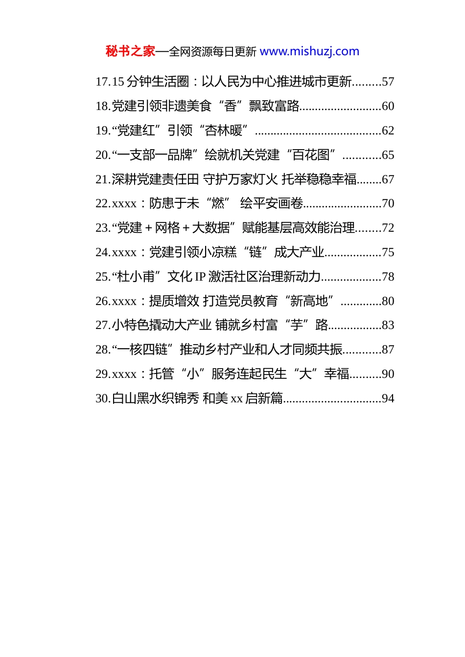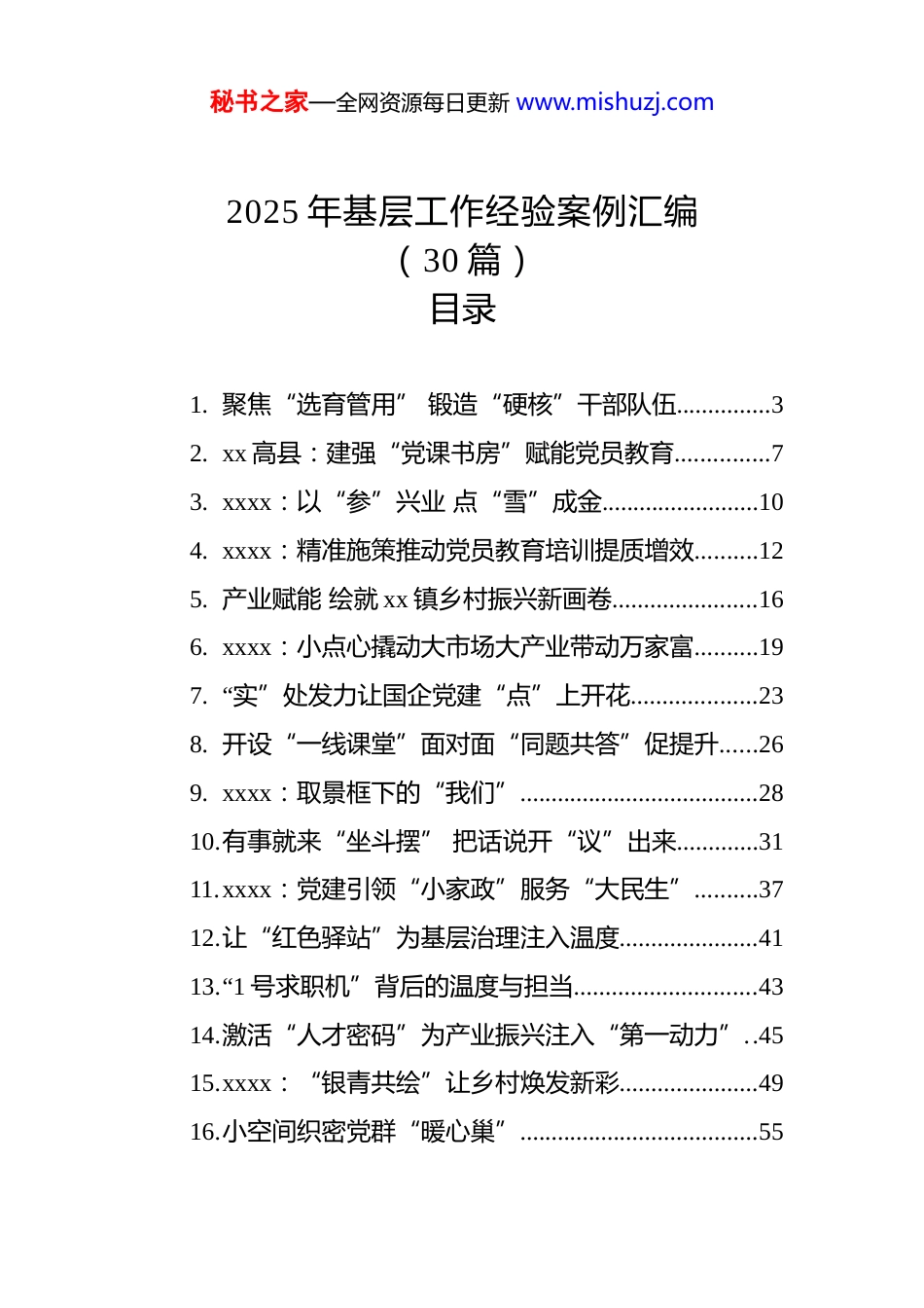 秘书之家—全网资源每日更新 www.mishuzj.com2025 年基层工作经验案例汇编(30 篇)目录1. 聚焦“选育管用” 锻造“硬核”干部队伍...............32. xx 高县:建强“党课书房”赋能党员教育...............73. xxxx:以“参”兴业 点“雪”成金.........................104. xxxx:精准施策推动党员教育培训提质增效..........125. 产业赋能 绘就 xx 镇乡村振兴新画卷.......................166. xxxx:小点心撬动大市场大产业带动万家富..........197. “实”处发力让国企党建“点”上开花....................238. 开设“一线课堂”面对面“同题共答”促提升......269. xxxx:取景框下的“我们”......................................2810.有事就来“坐斗摆” 把话说开“议”出来.............3111.xxxx:党建引领“小家政”服务“大民生”..........3712.让“红色驿站”为基层治理注入温度......................4113.“1 号求职机”背后的温度与担当.............................4314.激活“人才密码”为产业振兴注入“第一动力”..4515.xxxx:“银青共绘”让乡村焕发新彩......................4916.小空间织密党群“暖心巢”......................................55秘书之家—全网资源每日更新 www.mishuzj.com17.15 分钟生活圈:以人民为中心推进城市更新.........5718.党建引领非遗美食“香”飘致富路..........................6019.“党建红”引领“杏林暖”........................................6220.“一支部一品牌”绘就机关党建“百花图”............6521.深耕党建责任田 守护万家灯火 托举稳稳幸福........6722.xxxx:防患于未“燃” 绘平安画卷.........................7023.“党建+网格+大数据”赋能基层高效能治理........7224.xxxx:党建引领小凉糕“链”成大产业..................7525.“杜小甫”文化 IP 激活社区治理新动力...................7826.xxxx:提质增效 打造党员教育“新高地”.............8027.小特色撬动大产业 铺就乡村富“芋”路.................8328.“一核四链”推动乡村产业和人才同频共振............8729.xxxx:托管“小”服务连起民生“大”幸福..........9030.白山黑水织锦秀 和美 xx 启新篇...............................94秘书之家—全网资源每日更新 www.mishuzj.com聚焦“选育管用” 锻造“硬核”干部队伍党的十八大以来,习近平总书记围绕培养选拔党和人民需要的好干部作了系统阐述,科学回答了新的历史条件下党的干部工作一系列重大理论和实践问题,是我们党新时期选人用人工作的重要指针和行动指南。各级党委务必要聚焦“选育管用”,坚持精准科学,真正将信念坚定、为民服务、勤政务实、敢于担当、清正廉洁的好干部培养使用起来,锻造高素质专业化的干部队伍。聚焦政治标准,在斗争一线把好干部选出来。习近平总书记指出,重大考验面前,更能考察识别干部。一线是贯彻落实党中央决策部署的“最后一公里”,是检验干部政治判断力、政治领悟力、政治执行力的“试金石”。组织路线历来是为政治路线服务的,干部考察工作必须紧扣中心大局,常态化深入重大斗争一线,全面了解干部政治素养和履职能力,以考促干推动党中央重大决策部署落实落地。辽宁省抚顺市委组织部旗帜鲜明地将贯彻落实总书记重要指示批示精神和党中央关于推动高质量发展的战略部署,作为干部考察识别工作的出发点和落脚点,研究出台一线考察识别干部办法,通过列席会议、现场督察、谈秘书之家—全网资源每日更新 www.mishuzj.com话调研等方式,全方位掌握全市 41 个招商引资工作组、10个攻坚工作专班和 140 个攻坚工作组、12 个避险搬迁工作专班等重点考察对象在关键时刻、重大事项中的现实表现。聚焦素质提升,以系统培养把好干部带出来。习近平总书记强调,好干部不会自然而然产生。成长为一个好干部,一靠自身努力,二靠组织培养。组织部门要扛牢主责、干好主业、当好主角,突出抓好政治忠诚教育和党性教育,加强思想淬炼、政治历练、实践锻炼、专业训练,准确把握干部成长规律,围绕中国式现...