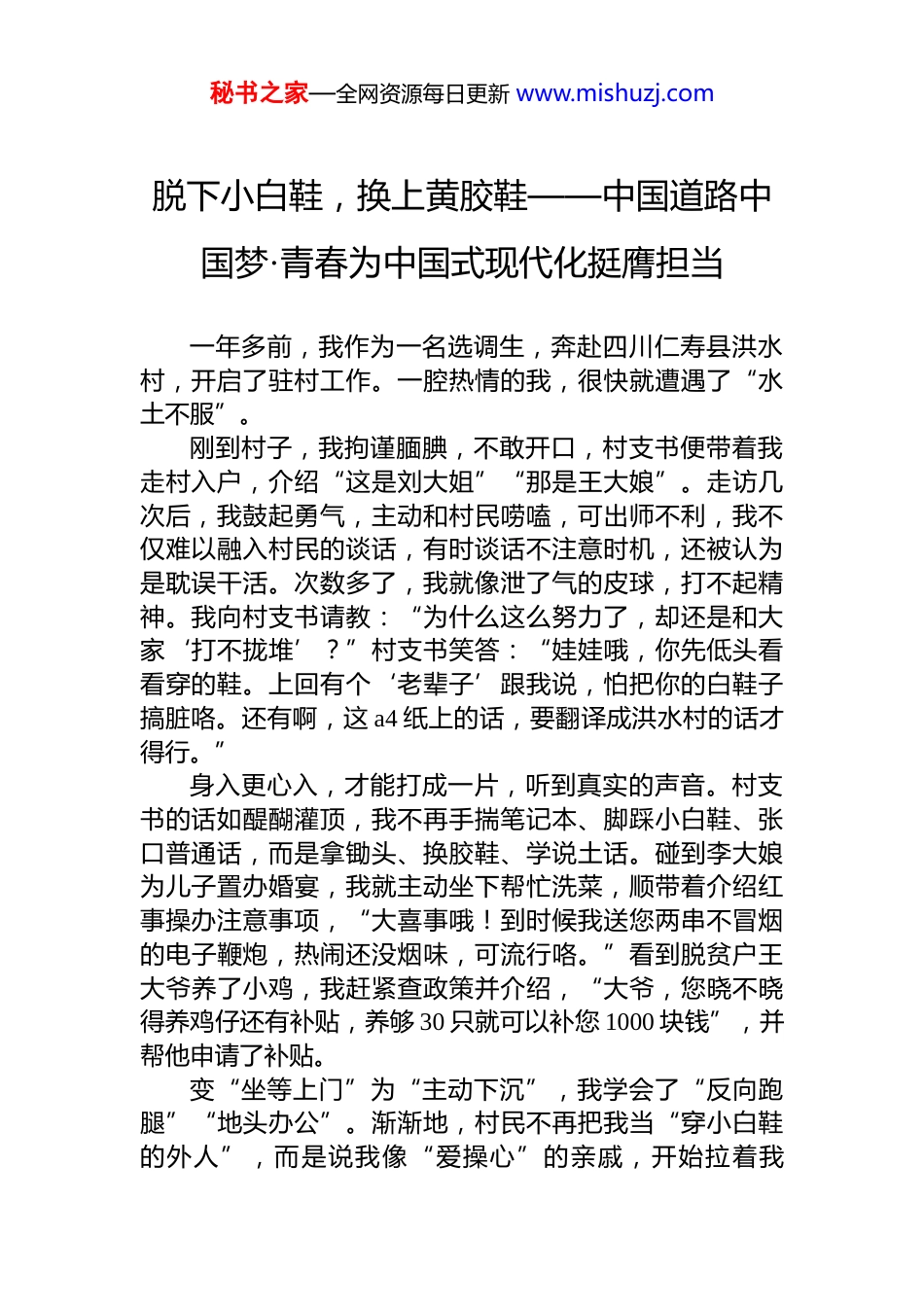 秘书之家—全网资源每日更新 www.mishuzj.com脱下小白鞋,换上黄胶鞋——中国道路中国梦·青春为中国式现代化挺膺担当一年多前,我作为一名选调生,奔赴四川仁寿县洪水村,开启了驻村工作。一腔热情的我,很快就遭遇了“水土不服”。刚到村子,我拘谨腼腆,不敢开口,村支书便带着我走村入户,介绍“这是刘大姐”“那是王大娘”。走访几次后,我鼓起勇气,主动和村民唠嗑,可出师不利,我不仅难以融入村民的谈话,有时谈话不注意时机,还被认为是耽误干活。次数多了,我就像泄了气的皮球,打不起精神。我向村支书请教:“为什么这么努力了,却还是和大家‘打不拢堆’?”村支书笑答:“娃娃哦,你先低头看看穿的鞋。上回有个‘老辈子’跟我说,怕把你的白鞋子搞脏咯。还有啊,这 a4 纸上的话,要翻译成洪水村的话才得行。”身入更心入,才能打成一片,听到真实的声音。村支书的话如醍醐灌顶,我不再手揣笔记本、脚踩小白鞋、张口普通话,而是拿锄头、换胶鞋、学说土话。碰到李大娘为儿子置办婚宴,我就主动坐下帮忙洗菜,顺带着介绍红事操办注意事项,“大喜事哦!到时候我送您两串不冒烟的电子鞭炮,热闹还没烟味,可流行咯。”看到脱贫户王大爷养了小鸡,我赶紧查政策并介绍,“大爷,您晓不晓得养鸡仔还有补贴,养够 30 只就可以补您 1000 块钱”,并帮他申请了补贴。变“坐等上门”为“主动下沉”,我学会了“反向跑腿”“地头办公”。渐渐地,村民不再把我当“穿小白鞋的外人”,而是说我像“爱操心”的亲戚,开始拉着我秘书之家—全网资源每日更新 www.mishuzj.com“摆龙门阵”,问今年有啥好政策、贷款有啥新优惠。落实惠民政策的“最后一公里”,不在文件、会议里,而在田间地头、街头巷尾。在乎民心,才能换得民“信”。******强调,“老百姓的事情是最重要的事情”。一年多驻村时光,让我对这件“事情”是什么有了更深的体会。在洪水村,那是孩子上好学、看病能报销、出门水泥路,是衣食住行的方方面面。把这些事情当作自己的“心头事”“要紧事”,踏踏实实干好干实,老百姓自然会看在眼里、甜在心上。500 多个日夜,我的电瓶车里程数接近 2 万公里,我走遍了每一条蜿蜒小路,难以忘记,在大树下给村里老人定制专属“智能手机说明书”、在村委会办公室辅导留守儿童写作业、在“烂场雨”中抢收菜籽、在春耕季给农田派送“水包裹”……“些小吾曹州县吏,一枝一叶总关情。”枝叶虽小,却连着根本。一步步、一寸寸,唯有以真情多下“尽精微”的细功夫,方能把“最重要的事情”办好,织就“致广大”的和美画卷。对我来说,看到组建的老年秧歌队在乡镇舞台大放光彩、得知帮助申请的种粮补助发放到村民手上、听说调解后的两家人重归于好,那份获得感与满足感比什么都值。如今,在村干部口中,我从那个懂天文地理的“研究生”成了知春耕夏忙的“小曾”;在乡亲们口中,我从县上来的“领导”变为咱们村的“曾妹儿”。今年 10 月,我就要结束在洪水村的锻炼,但这份经历将深深烙印在心中它见证了我的成长,也给我底气,让我不惮前行,在为民服务的实干奋斗中成就出彩人生。