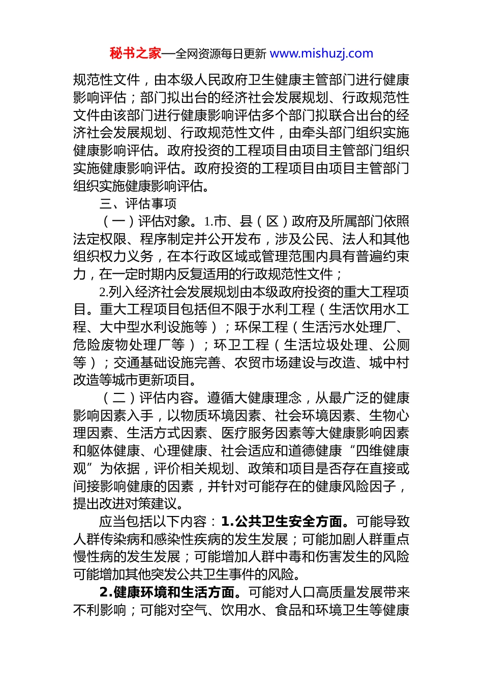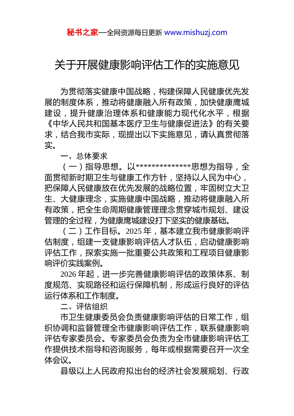 秘书之家—全网资源每日更新 www.mishuzj.com关于开展健康影响评估工作的实施意见为贯彻落实健康中国战略,构建保障人民健康优先发展的制度体系,推动将健康融入所有政策,加快健康鹰城建设,提升健康治理体系和健康能力现代化水平,根据《中华人民共和国基本医疗卫生与健康促进法》的有关要求,结合我市实际,现提出以下实施意见,请认真贯彻落实。一、总体要求(一)指导思想。以**************思想为指导,全面贯彻新时期卫生与健康工作方针,坚持以人民为中心,把保障人民健康放在优先发展的战略位置,牢固树立大卫生、大健康理念,实施健康中国战略,推动将健康融入所有政策,把全生命周期健康管理理念贯穿城市规划、建设管理的全过程,为健康鹰城建设打下坚实的健康基础。(二)工作目标。2025 年,基本建立我市健康影响评估制度,组建一支健康影响评估人才队伍,启动健康影响评估工作,探索实施一批重要公共政策和工程项目健康影响评价实践案例。2026 年起,进一步完善健康影响评估的政策体系、制度规范、实现路径和运行保障机制,形成运行良好的评估运行体系和工作制度。二、评估组织市卫生健康委员会负责健康影响评估的日常工作,组织协调和监督管理全市健康影响评估工作,联系健康影响评估专家委员会。专家委员会负责为全市健康影响评估工作提供技术指导和咨询服务,每年或根据需要召开一次全体会议。县级以上人民政府拟出台的经济社会发展规划、行政秘书之家—全网资源每日更新 www.mishuzj.com规范性文件,由本级人民政府卫生健康主管部门进行健康影响评估;部门拟出台的经济社会发展规划、行政规范性文件由该部门进行健康影响评估多个部门拟联合出台的经济社会发展规划、行政规范性文件,由牵头部门组织实施健康影响评估。政府投资的工程项目由项目主管部门组织实施健康影响评估。政府投资的工程项目由项目主管部门组织实施健康影响评估。三、评估事项(一)评估对象。1.市、县(区)政府及所属部门依照法定权限、程序制定并公开发布,涉及公民、法人和其他组织权力义务,在本行政区域或管理范围内具有普遍约束力,在一定时期内反复适用的行政规范性文件;2.列入经济社会发展规划由本级政府投资的重大工程项目。重大工程项目包括但不限于水利工程(生活饮用水工程、大中型水利设施等);环保工程(生活污水处理厂、危险废物处理厂等);环卫工程(生活垃圾处理、公厕等);交通基础设施完善、农贸市场建设与改造、城中村改造等城市更新项目。(二)评估内容。遵循大健康理念,从最广泛的健康影响因素入手,以物质环境因素、社会环境因素、生物心理因素、生活方式因素、医疗服务因素等大健康影响因素和躯体健康、心理健康、社会适应和道德健康“四维健康观”为依据,评价相关规划、政策和项目是否存在直接或间接影响健康的因素,并针对可能存在的健康风险因子,提出改进对策建议。应当包括以下内容:1.公共卫生安全方面。可能导致人群传染病和感染性疾病的发生发展;可能加剧人群重点慢性病的发生发展;可能增加人群中毒和伤害发生的风险可能增加其他突发公共卫生事件的风险。2.健康环境和生活方面。可能对人口高质量发展带来不利影响;可能对空气、饮用水、食品和环境卫生等健康秘书之家—全网资源每日更新 www.mishuzj.com环境带来不利影响;可能对人群健康生活方式、社会心理健康等带来不利影响。3.健康服务和保障方面。可能对卫生健康投入保障和医疗保险水平带来不利影响;可能对优质医疗资源合理配置和利用带来不利影响;可能对医疗卫生服务质量安全和利用、公平性和可及性带来不利影响。4.法律法规规定的其他应当评估的内容。四、评估程序健康影响评估工作按照部门初筛、信息报备、组织实施 3 个阶段依次开展。(一)部门初筛。经济社会发展规划、行政规范性文件完成征求意见后,拟定部门进行初筛,确定涉及的健康相关因素。工程项目建议书成文后,主管部门进行初筛。(二)信息报备。根据初筛结果,经济社会发展规划、行政规范性文件拟定部门、工程项目主管部门向市卫生健康委员会报送有关资料,市卫生健康委员会对相关信息进行登记。(三)组织实施。市...