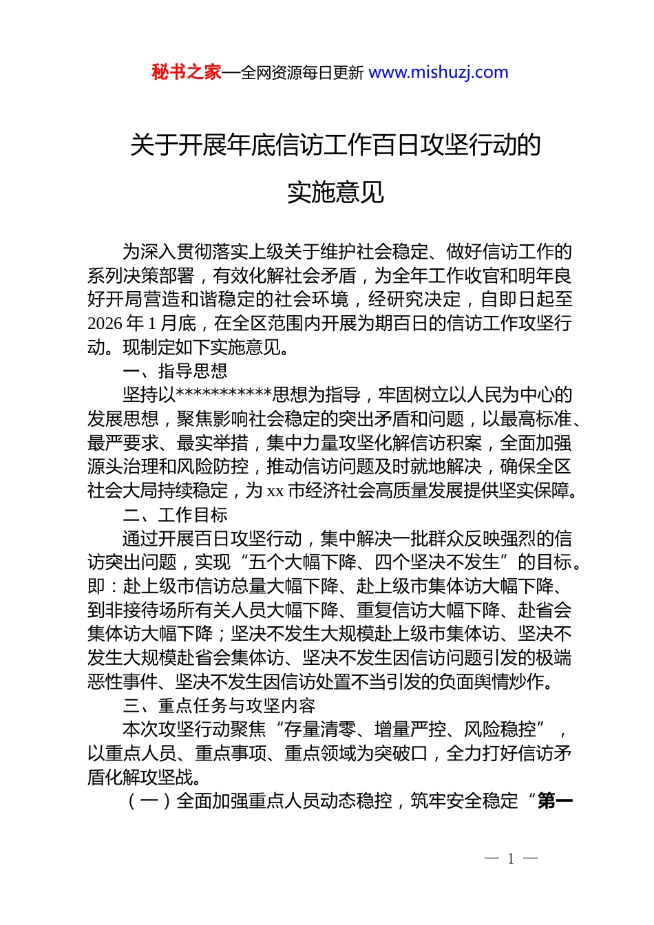 秘书之家—全网资源每日更新 www.mishuzj.com关于开展年底信访工作百日攻坚行动的实施意见为深入贯彻落实上级关于维护社会稳定、做好信访工作的系列决策部署,有效化解社会矛盾,为全年工作收官和明年良好开局营造和谐稳定的社会环境,经研究决定,自即日起至2026 年 1 月底,在全区范围内开展为期百日的信访工作攻坚行动。现制定如下实施意见。一、指导思想坚持以***********思想为指导,牢固树立以人民为中心的发展思想,聚焦影响社会稳定的突出矛盾和问题,以最高标准、最严要求、最实举措,集中力量攻坚化解信访积案,全面加强源头治理和风险防控,推动信访问题及时就地解决,确保全区社会大局持续稳定,为 xx 市经济社会高质量发展提供坚实保障。二、工作目标通过开展百日攻坚行动,集中解决一批群众反映强烈的信访突出问题,实现“五个大幅下降、四个坚决不发生”的目标。即:赴上级市信访总量大幅下降、赴上级市集体访大幅下降、到非接待场所有关人员大幅下降、重复信访大幅下降、赴省会集体访大幅下降;坚决不发生大规模赴上级市集体访、坚决不发生大规模赴省会集体访、坚决不发生因信访问题引发的极端恶性事件、坚决不发生因信访处置不当引发的负面舆情炒作。三、重点任务与攻坚内容本次攻坚行动聚焦“存量清零、增量严控、风险稳控”,以重点人员、重点事项、重点领域为突破口,全力打好信访矛盾化解攻坚战。(一)全面加强重点人员动态稳控,筑牢安全稳定“第一— 1 —秘书之家—全网资源每日更新 www.mishuzj.com防线”。重点人员的稳定是信访稳定的关键。必须综合运用法治、科技、人文关怀等多种手段,实现对重点人员的精准管控和有效疏导。一是建立健全“一人一档一策”管理机制。对排查出的信访重点人员,逐一建立电子档案,详尽记录其基本信息、主要诉求、活动轨迹、现实表现和关系网络。由属地和责任单位共同组建工作专班,制定个性化稳控化解方案,明确包案领导和具体责任人,做到情况清、底数明、措施实。二是深化智慧化技术手段应用。充分依托 xx 区“智慧治理”中心和新建的重点人员智能管控系统,实现对重点人员活动轨迹的动态感知与风险的秒级预警响应。该系统融合了多源信息与机器学习算法,能够对异常行为模式进行智能分析和预警,目前对潜在风险行为的预警准确率已超过 90%。攻坚期间,要实现重点人员数据全面接入,利用人脸识别、行动轨迹监控等技术,确保一旦出现异常动向,预警信息能在 3 秒内推送至一线稳控人员,实现“事前精准预警、事中快速处置”。三是强化人文关怀与心理疏导。坚持“管控”与“疏导”相结合,组织心理咨询师、资深调解员、法律工作者等专业力量,定期对重点人员开展心理疏导和情绪安抚。对其中生活确有困难的,按政策规定及时予以救助帮扶,从情感上感化、从生活上解困,最大限度促使其回归理性、息诉罢访。(二)全力化解信访积案和重点事项,实现“存量见底清零”信访积案是影响社会稳定的“老大难”问题,必须下定决心、集中攻坚,推动案结事了。一是实行领导包案和挂牌督办。对排查出的 30 件信访积案和 15 件中央、省市交办的重点信访事项,全部由区级领导包案,明确责任单位、责任人和化解时限,挂牌督办。包案领导要亲自接访、亲自研究、亲自协调,确保“三到位一处理”落到实处。二是运用“智慧信访”平台提升化解效率。全面应用“智— 2 —秘书之家—全网资源每日更新 www.mishuzj.com慧信访”数字化治理平台发挥其在案件流转、办理跟踪、数据分析等方面的优势。利用平台的 ai 文本解析功能,对信访事项进行要素化拆解和诉求精准识别,自动关联相关法律法规和过往案例,为精准施策提供支持。目前,该系统对重复信访件的智能拦截识别准确率已达 99.2%,攻坚期间要确保所有新增案件办理流程线上流转、全程留痕、实时监督,力争将案件平均办理周期缩短 20%。三是开展多元化解综合施策。对事实清楚、政策明确的案件,快查快办,立即解决;对涉及多个部门、情况复杂的案件,由区信访工作联席会议牵头,组织联合会商,形成处置合力;对已经三级终结但信访人仍缠访闹访的,加强法治宣传教育,引导...
