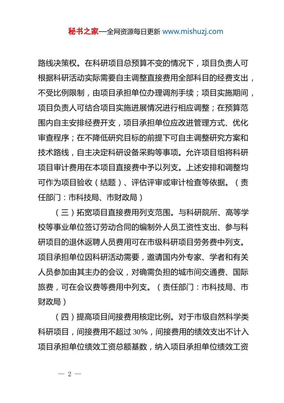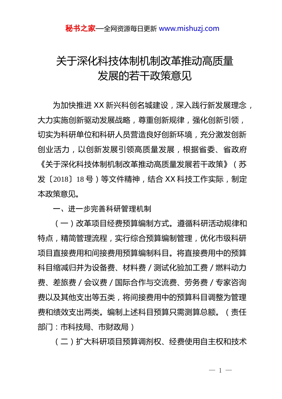 秘书之家—全网资源每日更新 www.mishuzj.com关于深化科技体制机制改革推动高质量发展的若干政策意见为加快推进 XX 新兴科创名城建设,深入践行新发展理念,大力实施创新驱动发展战略,尊重创新规律,强化创新引领,切实为科研单位和科研人员营造良好创新环境,充分激发创新创业活力,以创新发展引领高质量发展,根据省委、省政府《关于深化科技体制机制改革推动高质量发展若干政策》(苏发〔2018〕18 号)等文件精神,结合 XX 科技工作实际,制定本政策意见。一、进一步完善科研管理机制(一)改革项目经费预算编制方式。遵循科研活动规律和特点,精简管理流程,实行综合预算编制管理,优化市级科研项目直接费用和间接费用预算编制科目。将直接费用中的预算科目缩减归并为设备费、材料费/测试化验加工费/燃料动力费、差旅费/会议费/国际合作与交流费、劳务费/专家咨询费以及其他支出等五类,将间接费用中的预算科目调整为管理费和绩效支出两类。编制上述科目预算只需测算总额。(责任部门:市科技局、市财政局)(二)扩大科研项目预算调剂权、经费使用自主权和技术— 1 —秘书之家—全网资源每日更新 www.mishuzj.com路线决策权。在科研项目总预算不变的情况下,项目负责人可根据科研活动实际需要自主调整直接费用全部科目的经费支出,不受比例限制,由项目承担单位办理调剂手续;项目实施期间,项目负责人可结合项目实施进展情况进行相应调整;在预算范围内自主安排经费开支,项目承担单位应改进管理方式、优化审查程序;在不降低研究目标的前提下可自主调整研究方案和技术路线,自主决定科研设备采购等事项。允许项目组将科研项目审计费用在本项目直接费中予以列支。上述安排和调整均可作为项目验收(结题)、评估评审或审计检查等依据。(责任部门:市科技局、市财政局)(三)拓宽项目直接费用列支范围。与科研院所、高等学校等事业单位签订劳动合同的编制外人员工资性支出、参与科研项目的退休返聘人员费用可在市级科研项目劳务费中列支。项目承担单位因科研活动需要,邀请国内外专家、学者和有关人员参加由其主办的会议,对确需负担的城市间交通费、国际旅费,可在会议费等费用中列支。(责任部门:市科技局、市财政局)(四)提高项目间接费用核定比例。对于市级自然科学类科研项目,间接费用不超过 30%,间接费用的绩效支出不计入项目承担单位绩效工资总额基数,纳入项目承担单位绩效工资— 2 —秘书之家—全网资源每日更新 www.mishuzj.com总量管理。间接费用的绩效支出中,给予 35 周岁以下青年科技人员的比例原则上不低于 30%。(责任部门:市科技局、市财政局)(五)加大对承担重大科研任务领衔人员的薪酬激励。对全时全职承担重大技术攻关、成果转化或平台建设任务的项目负责人实行年薪制,年薪所需经费允许在项目经费中列支并单独核算,在本单位绩效工资总量中单列,单位当年绩效工资总量相应增加。项目承担单位应在项目立项时与市有关部门确定人员名单和年薪标准,并报市财政、人力资源社会保障部门备案。(责任部门:市科技局、市财政局、市人社局)(六)创新政府采购机制。科研院所、高等学校等事业单位使用市级科研项目经费购买仪器设备或科研服务,按有关规定采购;购买通用货物与服务,可不受自行采购限额标准限制,采购结束后报市财政部门备案。对科研院所、高等学校等事业单位科研急需的设备和耗材,采用特事特办、随到随办的采购机制,可不进行招投标程序,缩短采购周期;对于独家代理或生产的仪器设备,按程序确定采取单一来源采购等方式增强采购灵活性和便利性。对首购首用重大创新产品与服务,可按实际需要组织采购,采购结束后报同级财政部门备案。完善首台(套)重大装备保险试点财政支持政策,对符合条件的首台— 3 —秘书之家—全网资源每日更新 www.mishuzj.com(套)重大装备投保给予适当的保费补助。(责任部门:市财政局、市科技局)(七)改进项目资金拨付和留用处理方式。简化市级科研项目资金拨付程序,加快拨付进度,非市级预算单位项目资金直接拨付到项目承担单位基本户;市级预算单位项目资金可一次性申请全...
