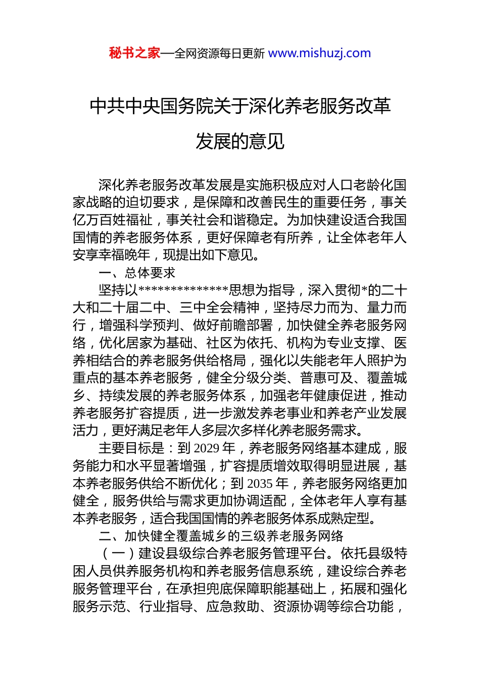 秘书之家—全网资源每日更新 www.mishuzj.com中共中央国务院关于深化养老服务改革发展的意见深化养老服务改革发展是实施积极应对人口老龄化国家战略的迫切要求,是保障和改善民生的重要任务,事关亿万百姓福祉,事关社会和谐稳定。为加快建设适合我国国情的养老服务体系,更好保障老有所养,让全体老年人安享幸福晚年,现提出如下意见。一、总体要求坚持以**************思想为指导,深入贯彻*的二十大和二十届二中、三中全会精神,坚持尽力而为、量力而行,增强科学预判、做好前瞻部署,加快健全养老服务网络,优化居家为基础、社区为依托、机构为专业支撑、医养相结合的养老服务供给格局,强化以失能老年人照护为重点的基本养老服务,健全分级分类、普惠可及、覆盖城乡、持续发展的养老服务体系,加强老年健康促进,推动养老服务扩容提质,进一步激发养老事业和养老产业发展活力,更好满足老年人多层次多样化养老服务需求。主要目标是:到 2029 年,养老服务网络基本建成,服务能力和水平显著增强,扩容提质增效取得明显进展,基本养老服务供给不断优化;到 2035 年,养老服务网络更加健全,服务供给与需求更加协调适配,全体老年人享有基本养老服务,适合我国国情的养老服务体系成熟定型。二、加快健全覆盖城乡的三级养老服务网络(一)建设县级综合养老服务管理平台。依托县级特困人员供养服务机构和养老服务信息系统,建设综合养老服务管理平台,在承担兜底保障职能基础上,拓展和强化服务示范、行业指导、应急救助、资源协调等综合功能,秘书之家—全网资源每日更新 www.mishuzj.com统筹推动县域养老服务资源高效利用。省级、市级养老机构要推动优质资源下沉,增强对县级综合养老服务管理平台的技术支持、示范引领、人才培养作用,促进区域联动。(二)加强乡镇(街道)区域养老服务能力建设。依托乡镇(街道)敬老院、优质民办养老机构等,改扩建为区域养老服务中心,发挥专业照护、服务转介、资源链接等作用,促进上下联动,推动供需衔接。支持有条件的地方推动乡镇(街道)敬老院由县级民政部门直管,探索推广委托运营,提升服务管理质效。(三)完善村(社区)养老服务设施站点。发挥乡镇(街道)区域养老服务中心带动作用,采取“中心+站点”等方式,大力发展嵌入式社区养老服务设施、互助性养老服务站点,完善老旧小区养老服务设施,加强与教育、卫生健康、文化等公共服务设施的综合利用,建设“一老一小”服务综合体。发挥设施站点连接家庭与社会服务的作用,及时收集和转介服务需求。三、贯通协调居家社区机构三类养老服务形态(四)巩固居家养老基础作用。完善老年人床边、身边可感可及的养老服务政策措施。健全家庭养老支持政策探索为居家失能老年人建设具有连续、稳定、专业服务功能的家庭养老床位,开展老年人家庭成员照护技能培训。积极培育专业化服务机构,鼓励社区和家政、互联网平台企业等上门提供老年助餐、助浴、助洁、助行、助医、助急等多样化服务,更好满足居家照护服务需求。加快适老住宅建设,推进家庭适老化改造,支持老旧小区加装电梯加强无障碍环境建设。(五)强化社区养老依托作用。扩大社区养老服务有效供给,依托社区为居家养老提供有力支持。发展嵌入式社区养老服务,大力培育专业化、连锁化、品牌化运营的社区养老服务机构,整合周边场地设施等资源,推行“社区+物业+养老服务”,增强专业照护、日间照料、康复护秘书之家—全网资源每日更新 www.mishuzj.com理、上门服务等能力。将社区养老服务纳入城市一刻钟便民生活圈建设重点内容。探索老旧小区养老服务供给有效途径,推动完整社区建设。探索开展“养老顾问”服务,提供专业咨询、委托代办等助老项目。村(社区)“两委”要把服务老年人作为重要职责,掌握辖区内老年人情况和服务需求,协助开展养老服务。补齐社区老年人活动场所短板,开展文体娱乐、社会交往等活动。加强孤寡老年人探访关爱服务。(六)优化机构养老专业支撑作用。根据服务对象和设施条件,因地制宜推进养老机构分类改革,调整完善供给结构。兜底保障型养老机构主要收住特困老年人和经济困难失能老年人等;普惠...