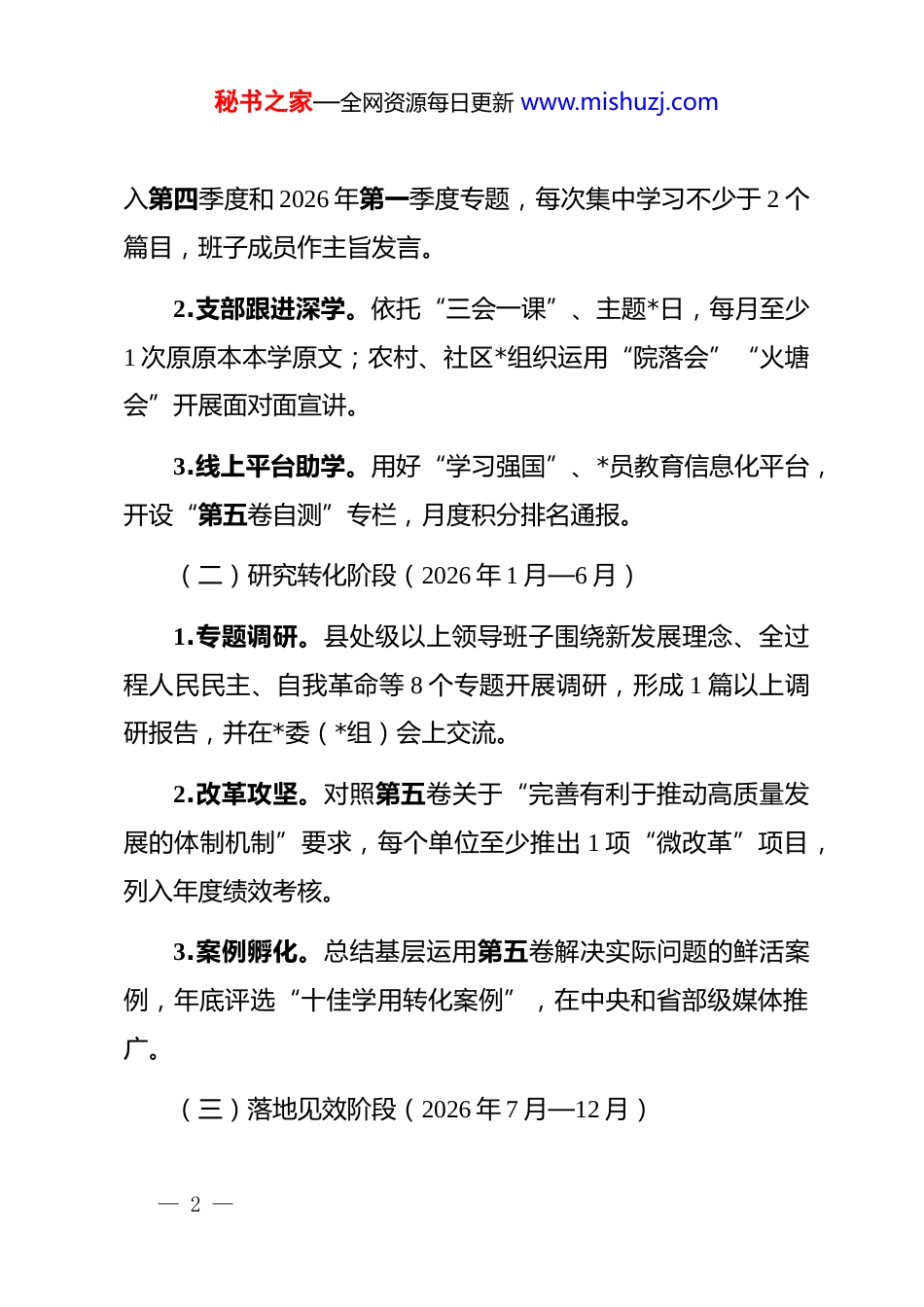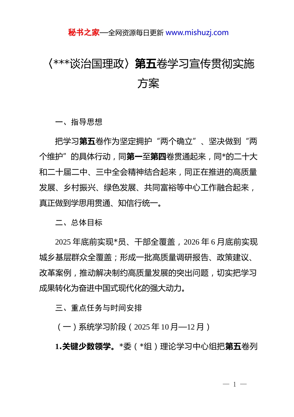 秘书之家—全网资源每日更新 www.mishuzj.com〈***谈治国理政〉第五卷学习宣传贯彻实施方案一、指导思想把学习第五卷作为坚定拥护“两个确立”、坚决做到“两个维护”的具体行动,同第一至第四卷贯通起来,同*的二十大和二十届二中、三中全会精神结合起来,同正在推进的高质量发展、乡村振兴、绿色发展、共同富裕等中心工作融合起来,真正做到学思用贯通、知信行统一。二、总体目标2025 年底前实现*员、干部全覆盖,2026 年 6 月底前实现城乡基层群众全覆盖;形成一批高质量调研报告、政策建议、改革案例,推动解决制约高质量发展的突出问题,切实把学习成果转化为奋进中国式现代化的强大动力。三、重点任务与时间安排(一)系统学习阶段(2025 年 10 月—12 月)1.关键少数领学。*委(*组)理论学习中心组把第五卷列— 1 —秘书之家—全网资源每日更新 www.mishuzj.com入第四季度和 2026 年第一季度专题,每次集中学习不少于 2 个篇目,班子成员作主旨发言。2.支部跟进深学。依托“三会一课”、主题*日,每月至少1 次原原本本学原文;农村、社区*组织运用“院落会”“火塘会”开展面对面宣讲。3.线上平台助学。用好“学习强国”、*员教育信息化平台,开设“第五卷自测”专栏,月度积分排名通报。(二)研究转化阶段(2026 年 1 月—6 月)1.专题调研。县处级以上领导班子围绕新发展理念、全过程人民民主、自我革命等 8 个专题开展调研,形成 1 篇以上调研报告,并在*委(*组)会上交流。2.改革攻坚。对照第五卷关于“完善有利于推动高质量发展的体制机制”要求,每个单位至少推出 1 项“微改革”项目,列入年度绩效考核。3.案例孵化。总结基层运用第五卷解决实际问题的鲜活案例,年底评选“十佳学用转化案例”,在中央和省部级媒体推广。(三)落地见效阶段(2026 年 7 月—12 月)— 2 —秘书之家—全网资源每日更新 www.mishuzj.com1.民生清单。把“我为群众办实事”常态化,省级统筹形成教育、医疗、养老、住房等 20 项民生项目清单,实行台账管理、销号落实。2.风险防控。对照书中关于底线思维的重要论述,开展安全生产、金融债务、意识形态等领域风险大起底、大整治。3.制度固化。将学习第五卷的好做法上升为制度,修订*委(*组)理论学习中心组学习规则、干部教育培训条例,建立“第一议题”学习提示单制度。四、分层分类学习安排1.机关:突出“服务高质量发展”,每季度举办 1 次“处长论坛”,把学习成果转化为政策文件。2.企业:突出“科技自立自强”,依托央企、省属国企理论学习中心组,开设“车间微课堂”,把学习融入技术攻关。3.农村:突出“乡村振兴”,组织驻村第一书记、“法律明白人”开展“田间地头宣讲”,用方言土语讲清共同富裕政策。4.学校:突出“立德树人”,把第五卷重要篇目融入高校《形势与政策》课程、中小学道德与法治课堂,举办“青年— 3 —秘书之家—全网资源每日更新 www.mishuzj.com说”微视频大赛。5.“两新”组织:突出“dj 强、发展强”,依托园区、商圈、楼宇*组织,开设“午间 30 分”读书会,实现学习生产两不误。五、载体与平台1.“十百千”宣讲工程:省级组建 10 人专家宣讲团、市级组建 100 人骨干团、县级组建 1000 人百姓团,全年宣讲不少于1 万场。2.“云课堂+微视频”:制作 20 集《读懂第五卷》动漫微课,全网推送;举办“学习达人”短视频挑战赛,点击量超过10 亿人次。3.出版和发行:参照云南“网格化发行”模式,确保全省所有机关、农村、社区、学校、企业“五必到”,实现当天到货、当天上架。4.研究阐释:设立省社科规划专项,立项 50 个课题,在核心期刊发表理论文章 200 篇以上;举办“中国式现代化高端论坛”,形成《第五卷学习导读》《第五卷关键词汇编》等成果。六、组织保障— 4 —秘书之家—全网资源每日更新 www.mishuzj.com1.领导机制:成立由*委书记任组长的学习第五卷领导小组,办公室设在宣传部,抽调纪委监委、组织部、*校等骨干集中办公。2.督查考核:把学习情况纳入巡视巡察、年度考核、*组织书记述职评议;每季度通报一次学习进度,对敷衍...