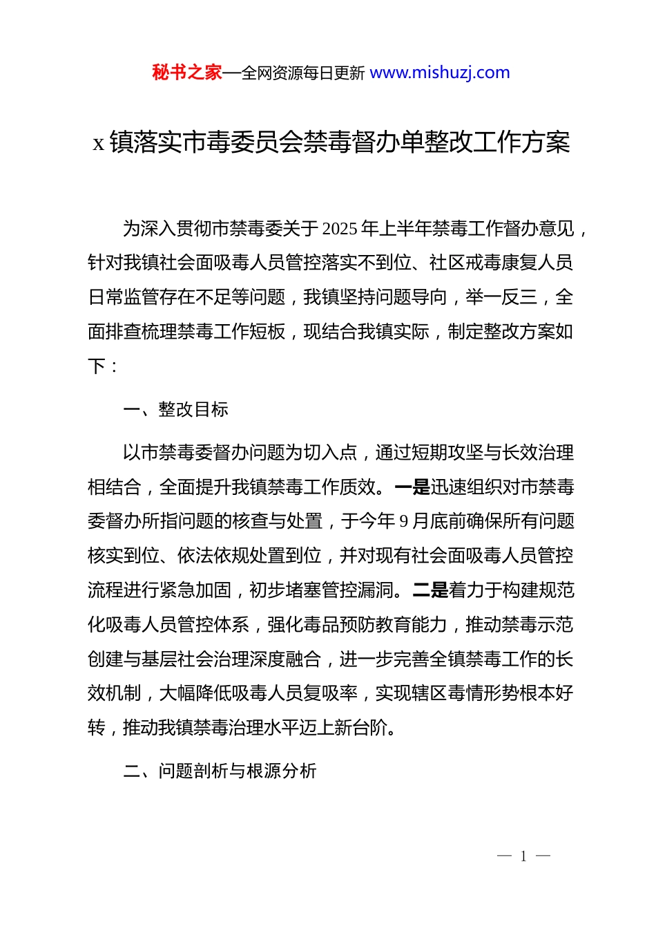 秘书之家—全网资源每日更新 www.mishuzj.comx 镇落实市毒委员会禁毒督办单整改工作方案为深入贯彻市禁毒委关于 2025 年上半年禁毒工作督办意见,针对我镇社会面吸毒人员管控落实不到位、社区戒毒康复人员日常监管存在不足等问题,我镇坚持问题导向,举一反三,全面排查梳理禁毒工作短板,现结合我镇实际,制定整改方案如下:一、整改目标以市禁毒委督办问题为切入点,通过短期攻坚与长效治理相结合,全面提升我镇禁毒工作质效。一是迅速组织对市禁毒委督办所指问题的核查与处置,于今年 9 月底前确保所有问题核实到位、依法依规处置到位,并对现有社会面吸毒人员管控流程进行紧急加固,初步堵塞管控漏洞。二是着力于构建规范化吸毒人员管控体系,强化毒品预防教育能力,推动禁毒示范创建与基层社会治理深度融合,进一步完善全镇禁毒工作的长效机制,大幅降低吸毒人员复吸率,实现辖区毒情形势根本好转,推动我镇禁毒治理水平迈上新台阶。二、问题剖析与根源分析— 1 —秘书之家—全网资源每日更新 www.mishuzj.com通过对市禁毒委督办问题的深入排查、分析,我镇社会面吸毒人员管控工作主要存在以下问题:(一)毒品检测手段存在盲区。毒品尿液检测仅能反映近几日吸毒情况,毛发毒品检测虽然可追溯 6 个月内的吸毒行为,但存在本级毛发检测费用高且频率低、上级毛发检测反馈周期长等问题。两种检测手段存在盲区,导致对部分社区戒毒社区康复人员短期吸毒行为的动态监测不足,个别人员利用时间差逃避监管,出现日常管控配合、尿检阴性而发检呈阳性现象。(二)人员管控措施落实不到位。属地管理责任落实不到位,对社会面吸毒人员的日常动态管控措施未能完全落实落细,突击抽检、跟踪随访、心理疏导、就业扶持等关键环节的力度和精度有待加强。(三)部门协同联动效能不足。我镇社戒社康工作站与公安、司法、卫健、民政等部门信息共享不畅,联合惩戒力度不足,同时部分村(社区)未严格落实“禁种铲毒”工作,制约了禁毒工作的整体效能。三、整改措施及责任分工(一)强化核查处置,落实管控责任。对今年上半年毛发— 2 —秘书之家—全网资源每日更新 www.mishuzj.com检测为阳性的 3 名社区戒毒社区康复人员开展备份毛发实验室复检、尿液检测以及二次毛发检测,并根据核查结果依法依规分类处置。对确系复吸人员且符合强制隔离戒毒条件的立即执行强制隔离戒毒,对不符合强制隔离戒毒条件的复吸人员,依法责令社区戒毒并纳入重点管控,加密检测频率,加强动态轨迹监测,筑牢人员管控防线。责任部门:镇社会治理办、各村(社区)、派出所整改时限:2025 年 9 月底前(二)强化业务培训,提升专业能力。积极组织全镇禁毒社工、禁毒专干、社区民警以及禁毒志愿者参加市级禁毒专项业务培训,重点规范毛发采集操作流程、检测技术应用标准、日常管控工作要点以及禁毒相关法律法规等,提高工作人员的法律意识、专业化水平和执行力。责任部门:镇社会治理办、派出所、各村(社区)整改时限:2025 年 10 月底前参加本年度市级培训(三)强化预防教育,提高禁毒意识。以广泛普及新型毒品、麻精药品和非列管成瘾性物质滥用危害为重点,持续实施禁毒公益宣传“亮屏”工程,从“线上”发力,提高全民禁毒— 3 —秘书之家—全网资源每日更新 www.mishuzj.com基础知识知晓率。统筹抓好“线下”禁毒宣传教育“六进”措施,深入社区、农村、学校、单位、场所、家庭,不断拓展禁毒宣传覆盖面,形成强大震慑力。责任部门:镇 dj 办、镇社会治理办、派出所、各村(社区)整改时限:2025 年 12 月底前,并长期坚持(四)强化部门协同,完善共治格局。由镇社会治理办牵头,每季度定期召开综治工作会议,专题研究解决禁毒工作中的重大问题,协调各部门工作,同步互通吸毒人员信息、风险评估结果、管控措施落实情况等数据,强化联合惩戒以及街接就业帮扶、医疗保障等支持措施。责任部门:镇社会治理办、镇 dj 办、镇公共服务办、派出所、司法所、卫生院、团委、妇联、各村(社区)整改时限:2025 年 12 月底前,并长期坚持四、工作要求(一)提高政治站位,压实工作责任。各...